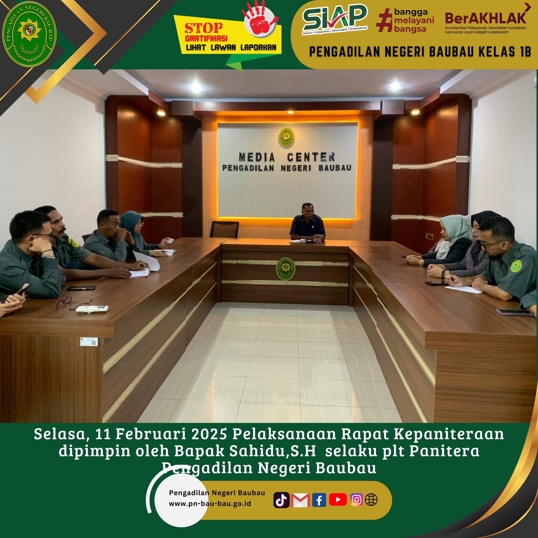 Selasa, 12 Februari 2025, plt. Panitera Pengadilan Negeri Baubau Bpk. Sahidu, S.H., bersama memimpin langsung Rapat berjenjang Bagian Kepaniteraan Bulan Februri Tahun 2025. Rapat diikuti Oleh Para Panmud, PP, JS/JSP, Staf dan PPNPN Kepaniteraan.