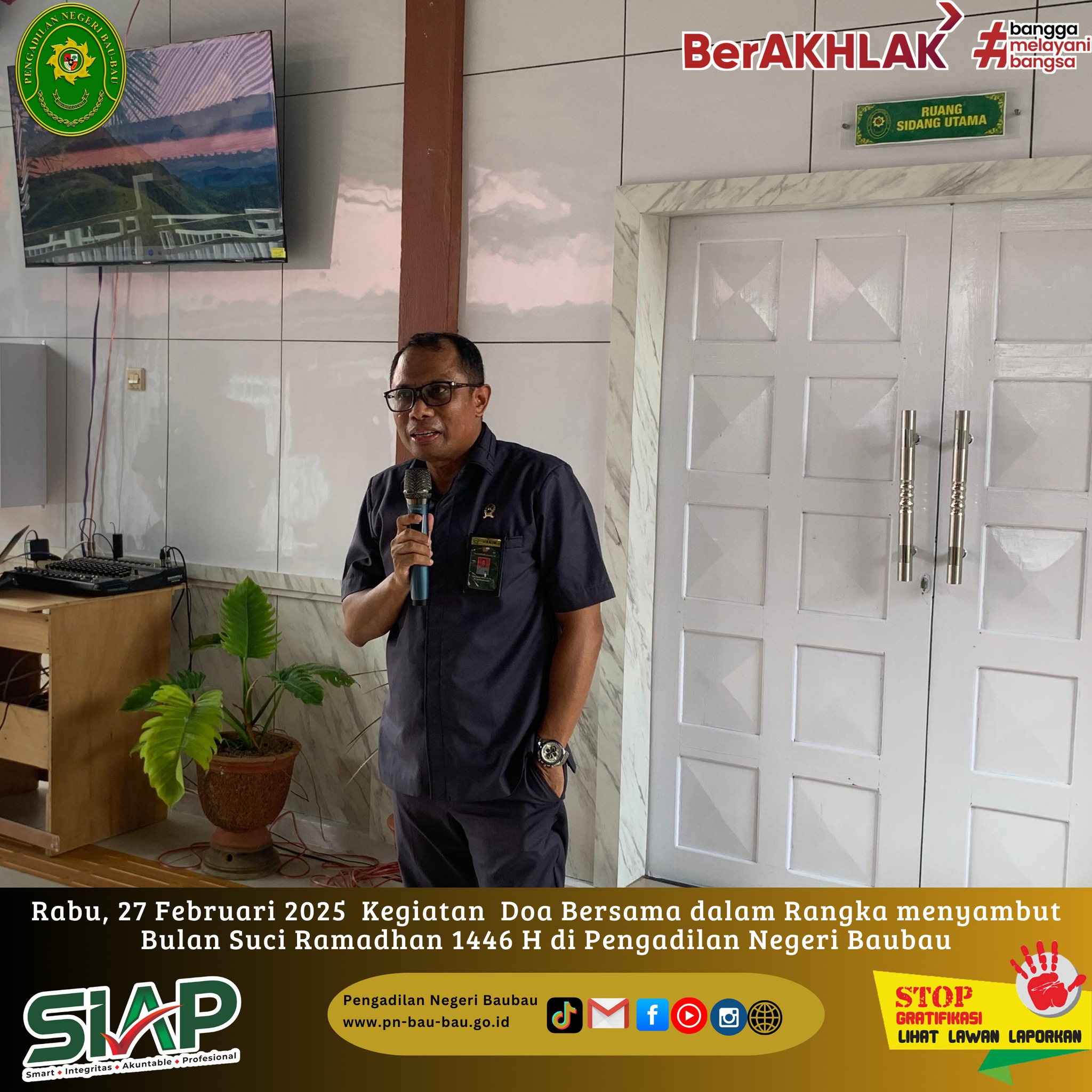 Rabu, 27 Februari 2025 Pelaksanaan Kegiatan Doa Bersama dalam Rangka menyambut Bulan Suci Ramadhan 1446 H di Pengadilan Negeri Baubau.