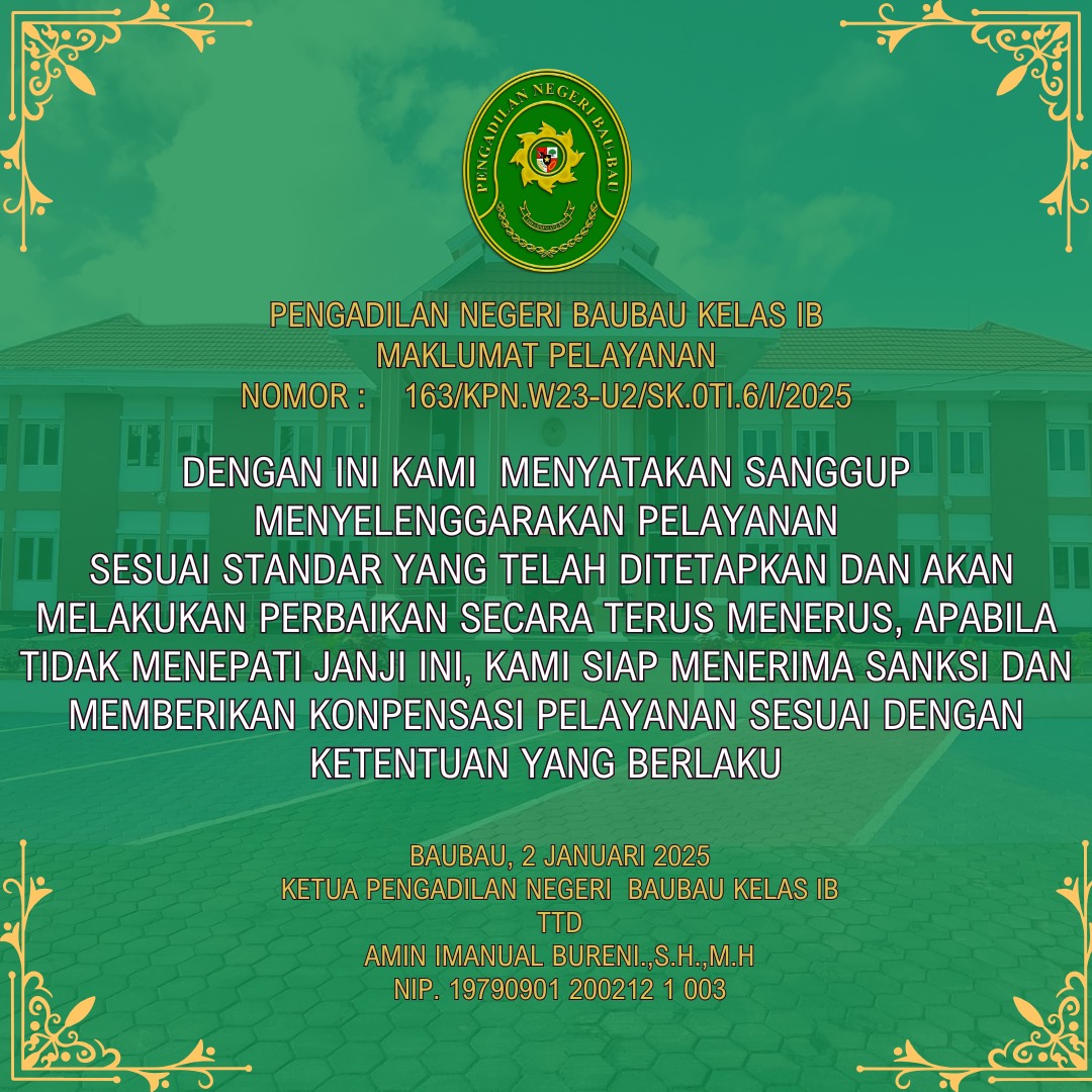 Mahkamah Agung RI telah menerbitkan PERMA Nomor 1 Tahun 2016 tentang Prosedur Mediasi guna mewujudkan mediasi yang efektif, efisien, cepat serta beritikad baik dalam penyelesaian perkara di Pengadilan Negeri Baubau Kelas 1 B