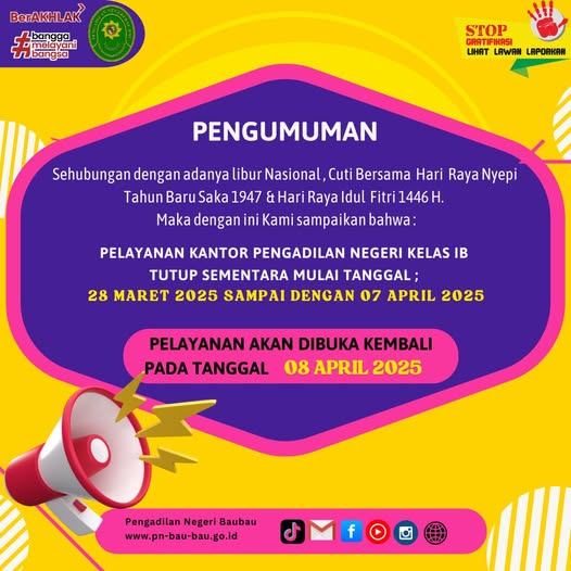 PENGUMUMAN Sehubungan dengan adanya libur Nasional , Cuti Bersama Hari Raya Nyepi Tahun Baru Saka 1947 & Hari Raya Idul Fitri 1446 H.