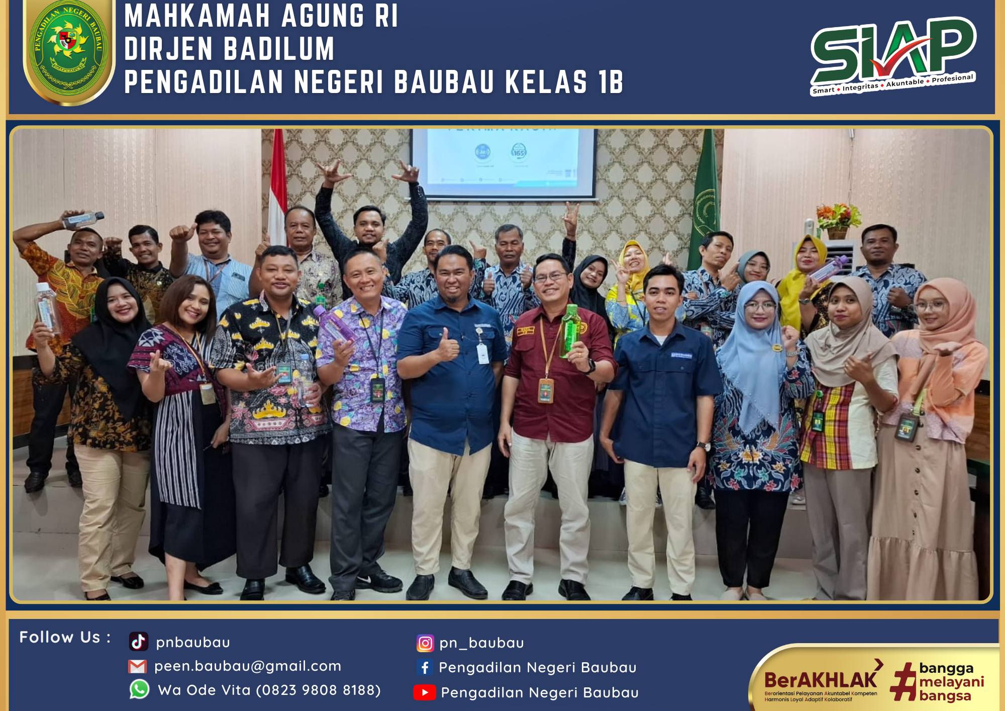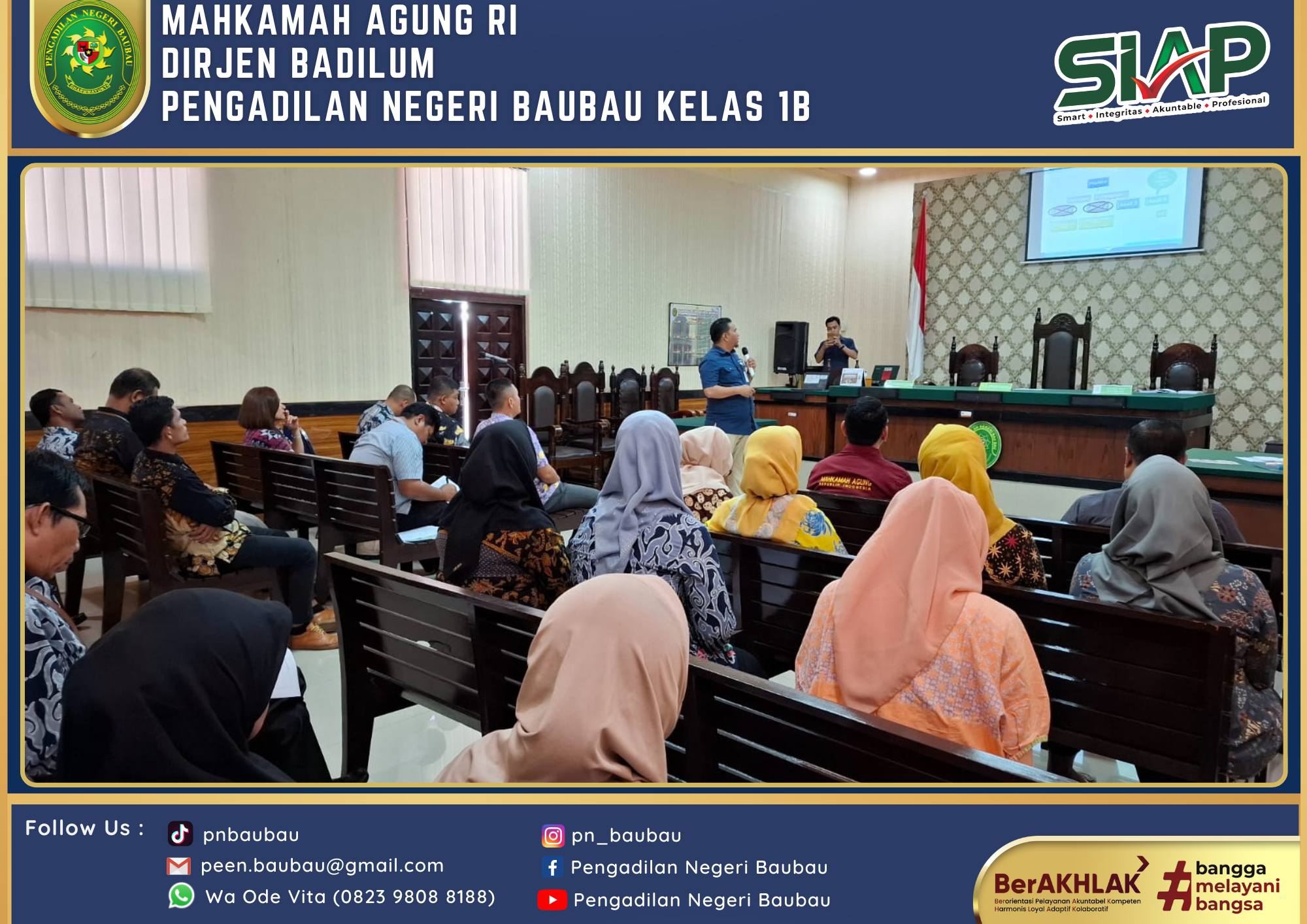 Tim BPJS (Badan Penyelenggara Jaminan Sosial) Kesehatan KC Baubau berkunjung ke Pengadilan Negeri Baubau dalam rangka sosialisasi mengenai BPJS Kesehatan. Sosialisasi tersebut dilaksanakan di ruang sidang Utama Pengadilan Negeri Baubau dan diikuti oleh seluruh aparatur Pengadilan Negeri Baubau pada pukul 09.00 Wita sampai selesai.