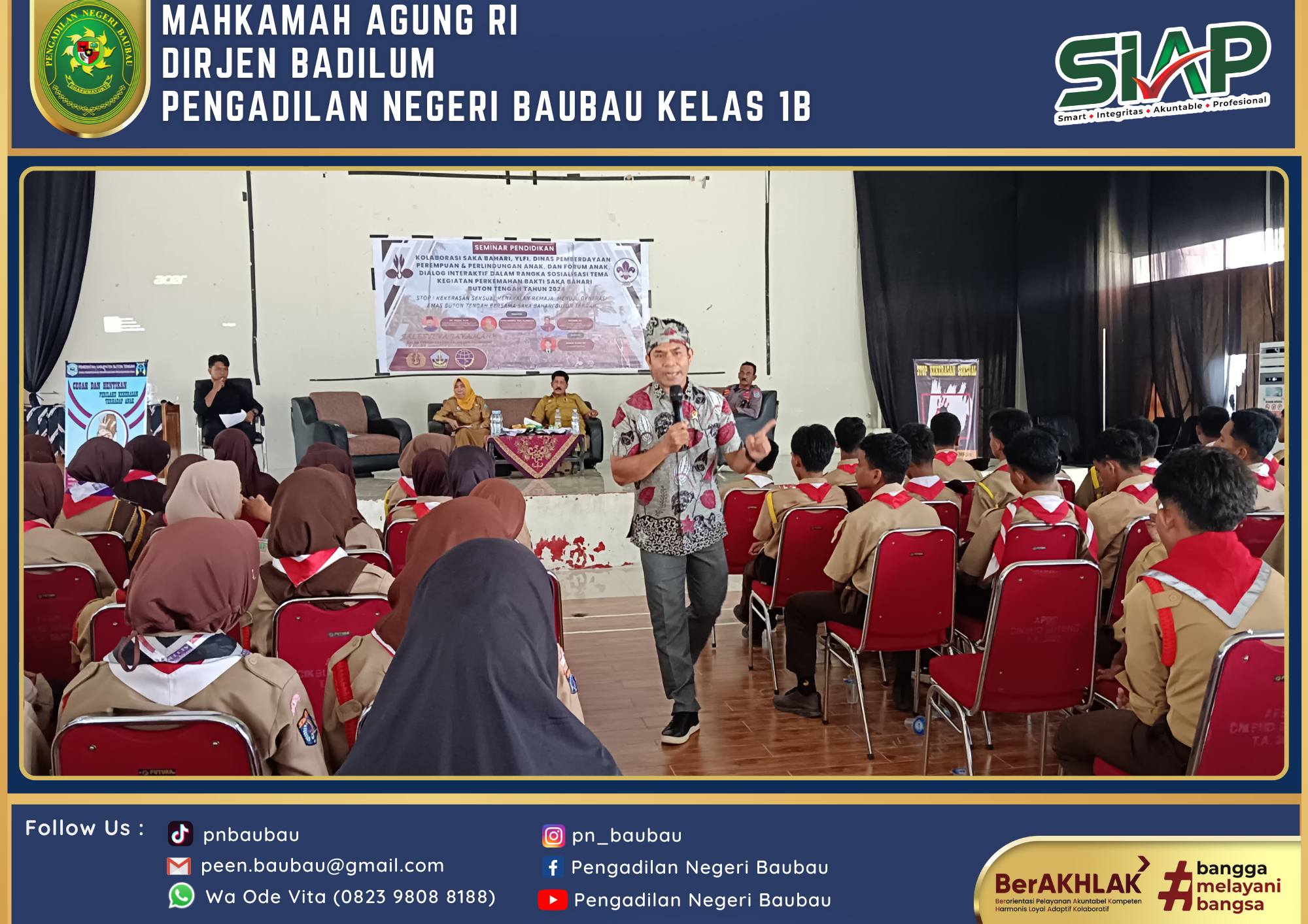 Pengadilan Baubau yang di wakili Bapak Mahmid, S.H Selaku Hakim Anak pada Pengadilan Negeri Baubau Kelas IB menghadiri Kegiatan Pramuka Saka Bahari di Kabupaten Buton Tengah, dalam Kegiatan Perkemahan yang berlangsung selama 3 (tiga) hari tersebut, puncaknya pada hari Senin Tanggal 24 Juni 2024 diselenggerakan seminar Pendidikan yang mengusung Tema : Stop Kekerasan Seksual dan Kenakalan Remaja menuju generasi Emas Buton Tengah. Kegiatan ini terselenggara atas dukungan UPTD PPA Buton Tengah, Yayasan Little Finger Indoneisa (YLFI), yang masing-masing menghadirikan pematerinya.
