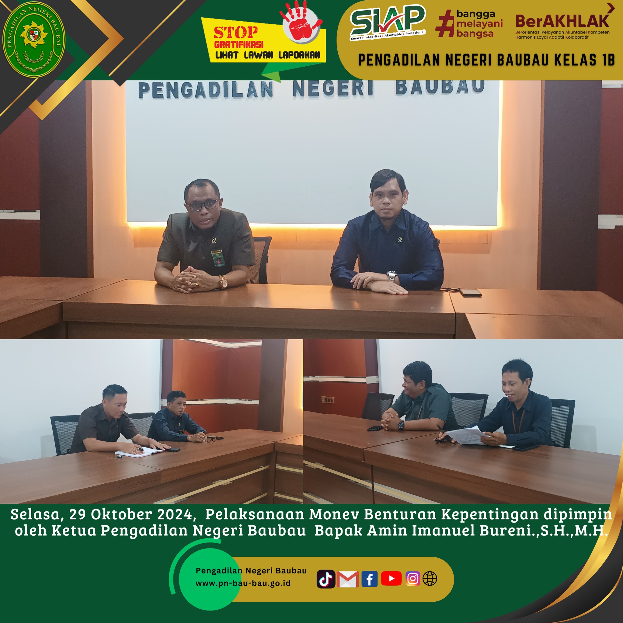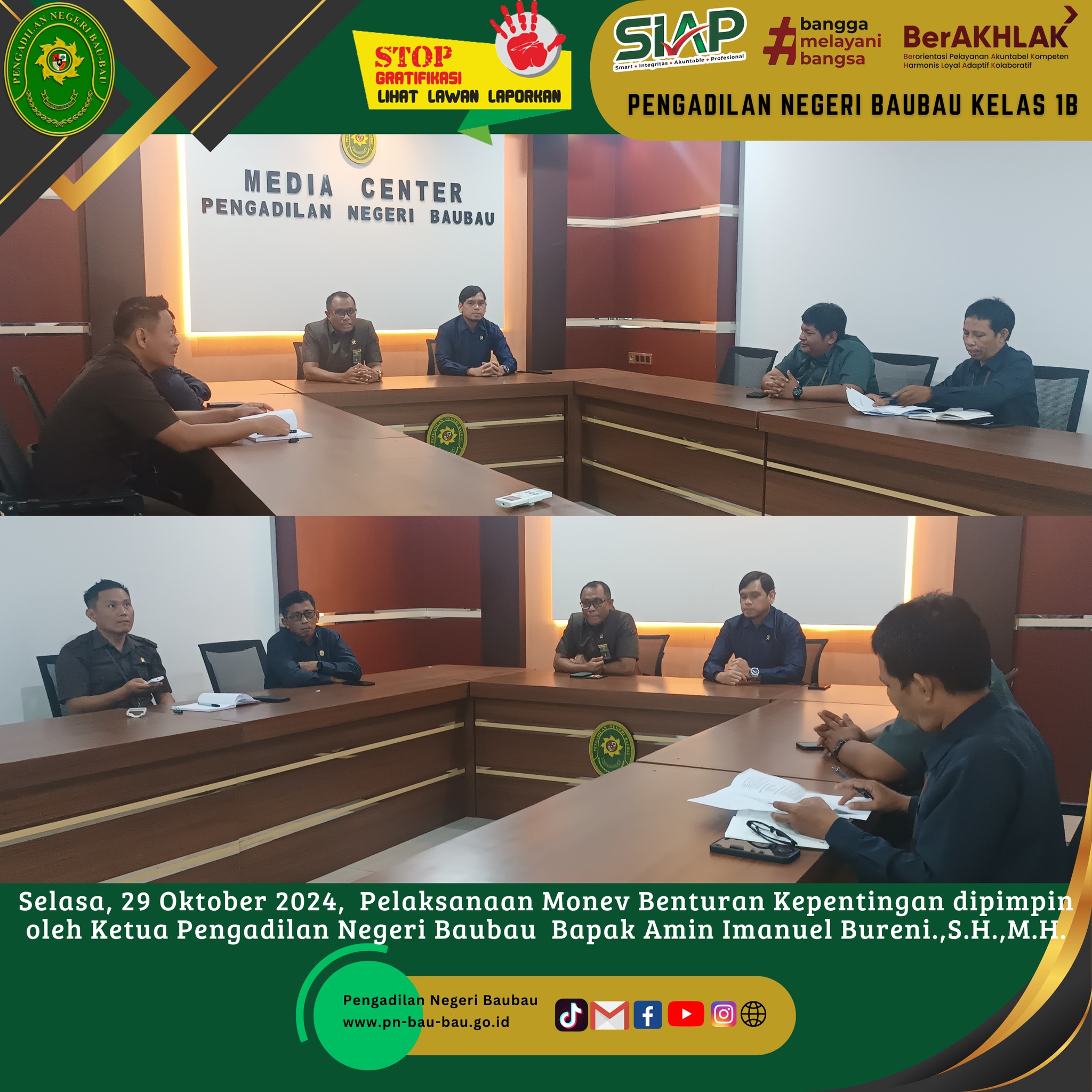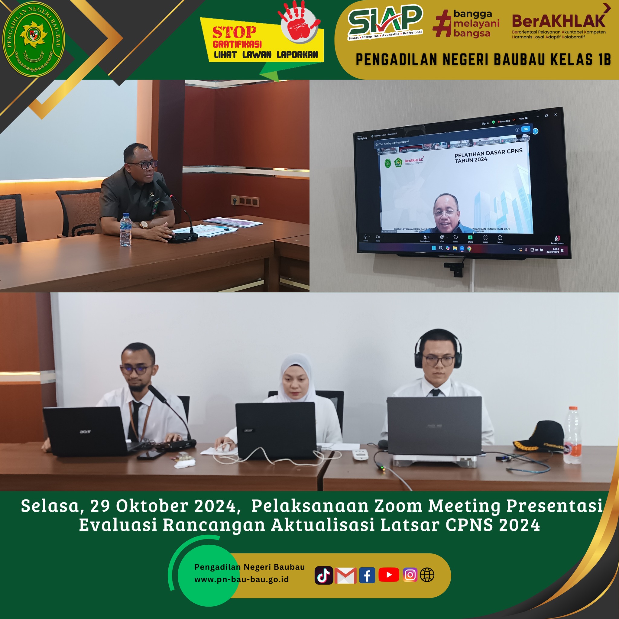 Bapak Amin Imanuel Bureni.,S.H.,M.H selaku Ketua Pengadilan Negeri Baubau yang bertindak sebagai Mentor terhadap 3 (Tiga) Orang CPNS Pengadilan Negeri Baubau yakni Andreas Naga Mas.,S.H., Wa Ode Destikawati Handayani.,S.H.dan Muhammad Firstano.,S.H. yang melakukan Presentasi Evaluasi Rancangan Aktualisasi Latsar CPNS 2024 Mahkamah Agung di Pengadilan Negeri Baubau secara Zoom Meeting pada pukul 13.00 Wita sampai selesai bertempat di Ruang Media Center;