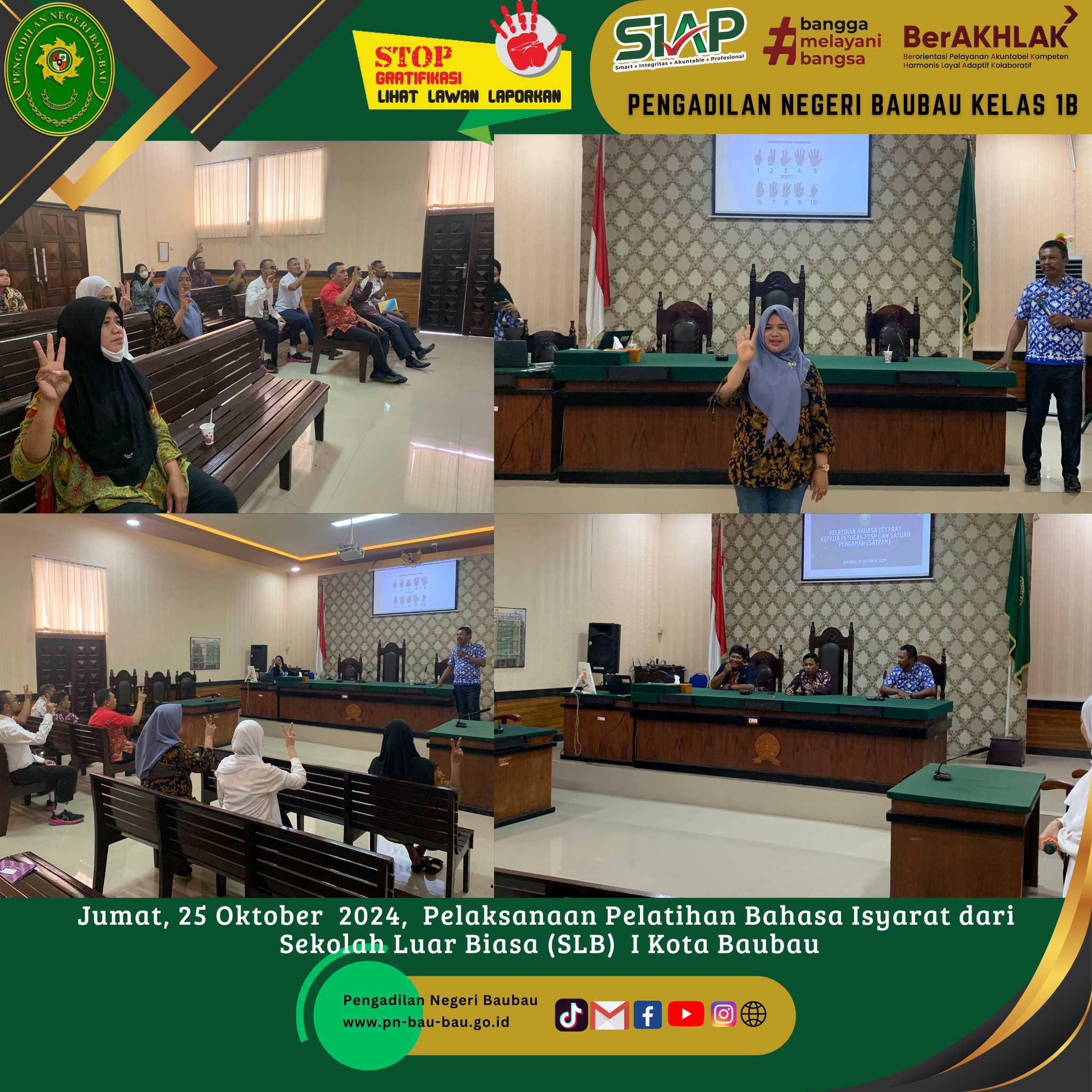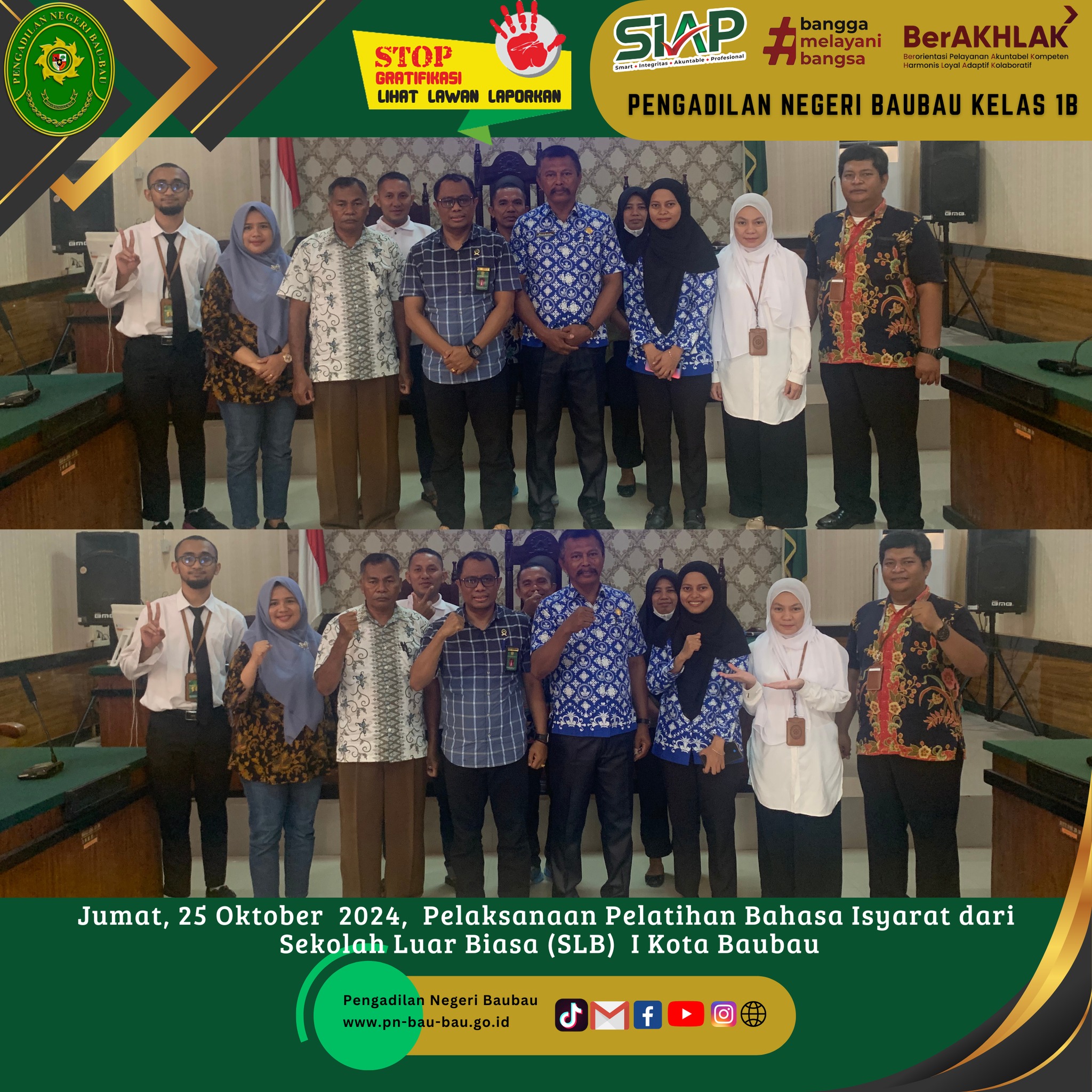 Jumat, 25 Oktober 2024, Telah dilaksanakan Kegiatan Pelatihan Bahasa Isyarat kepada Petugas PTSP dan Satuan Pengaman (PTSP) oleh Bapak Masrato.,S.Pd Kepala Sekolah Luar Biasa Kota Baubau.