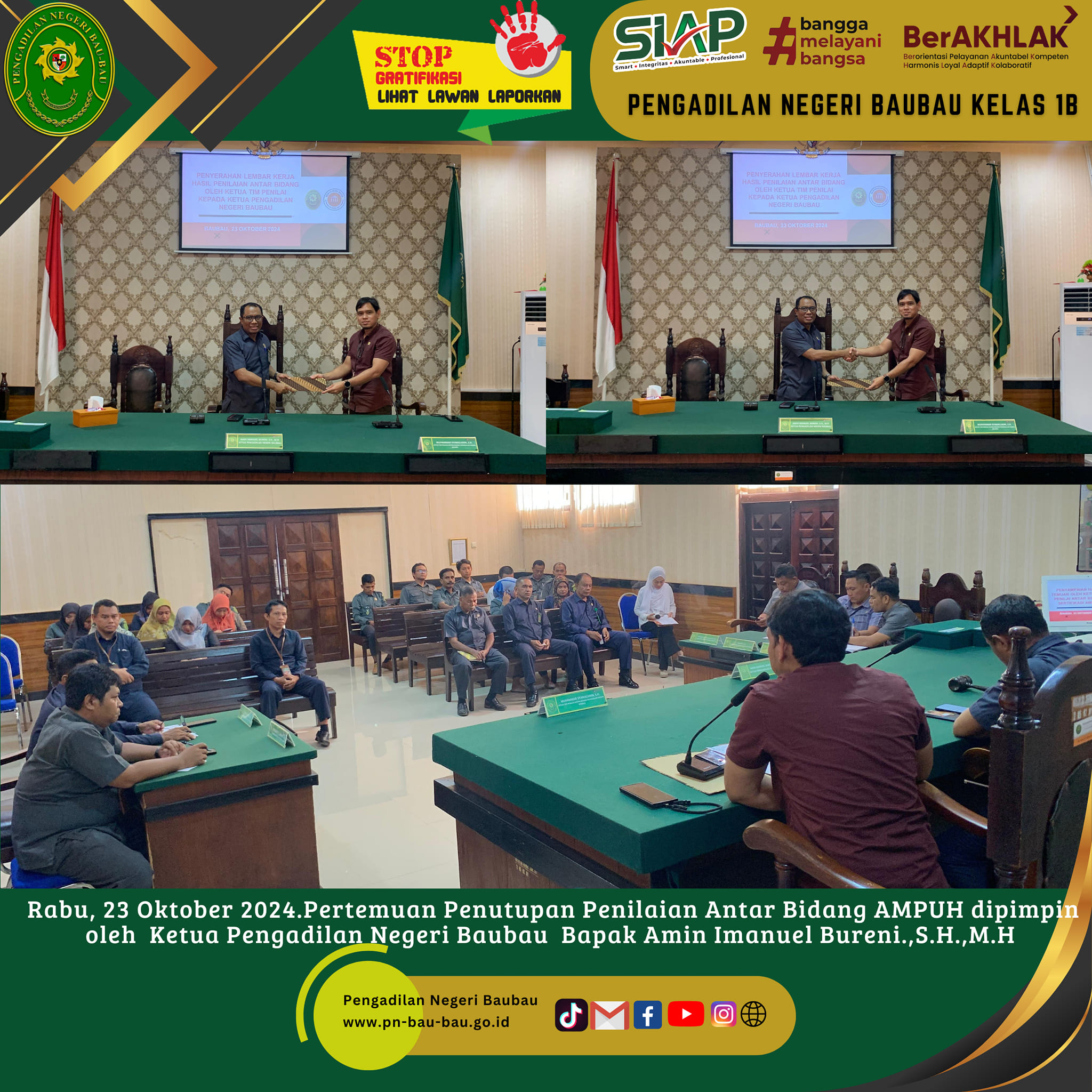 Rabu, 23 Oktober 2024, egiatan Pertemuan Penutupan Penilaian Antar Bidang Dokumen Sertifikasi Mutu Pengadilan Unggul dan Tangguh dipimpin oleh Ketua Pengadilan Negeri Baubau Bapak Amin Imanuel Bureni., S. H.
