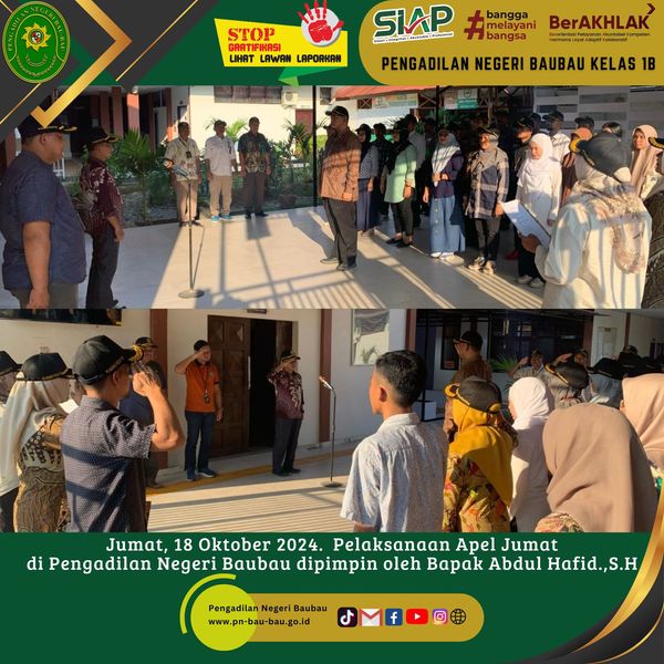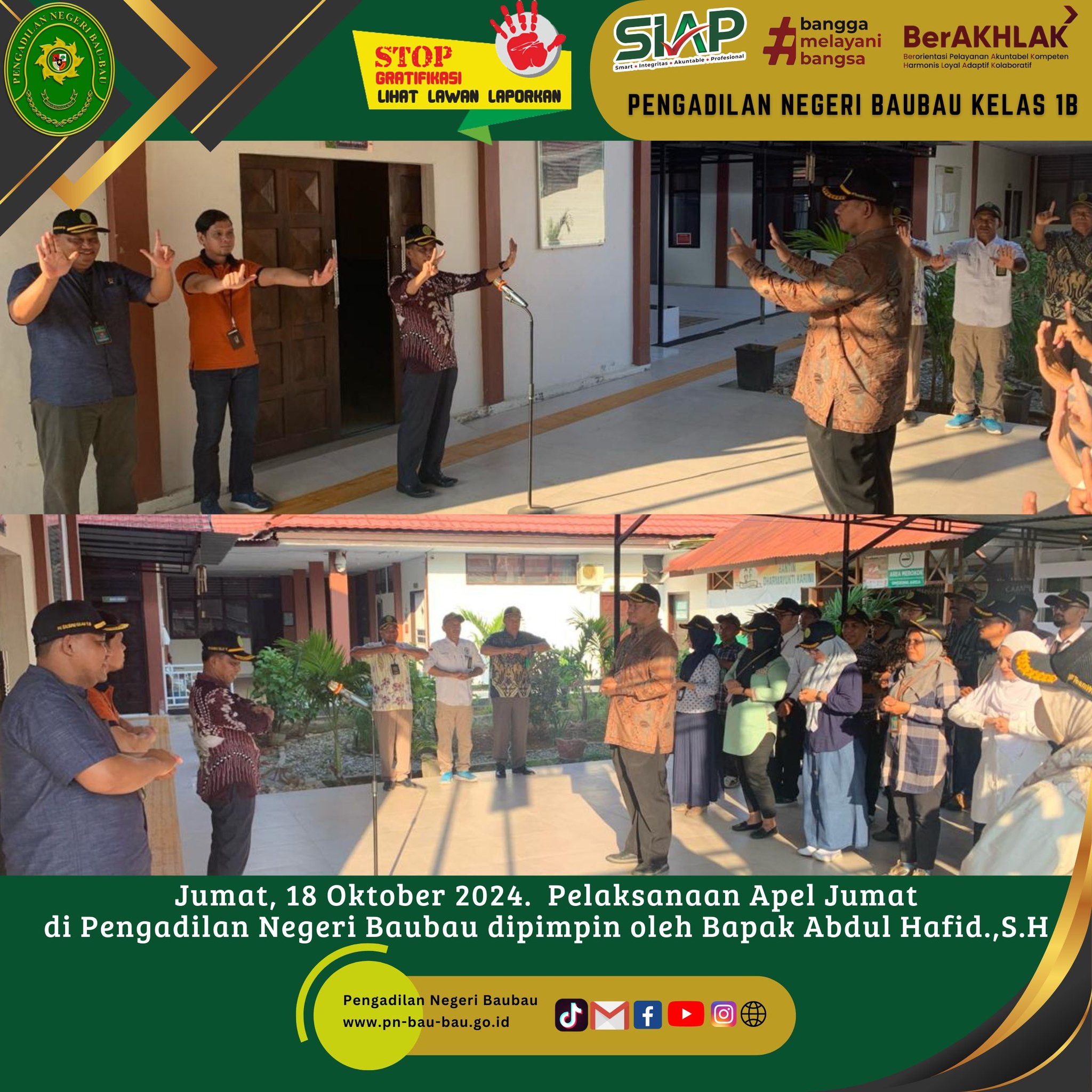Jumat, 18 Oktober 2024 Pelaksanaan Apel Jumat Sore di Pengadilan Negeri Baubau dipimpin oleh Bpk Abdul Hafid .,S.H.
