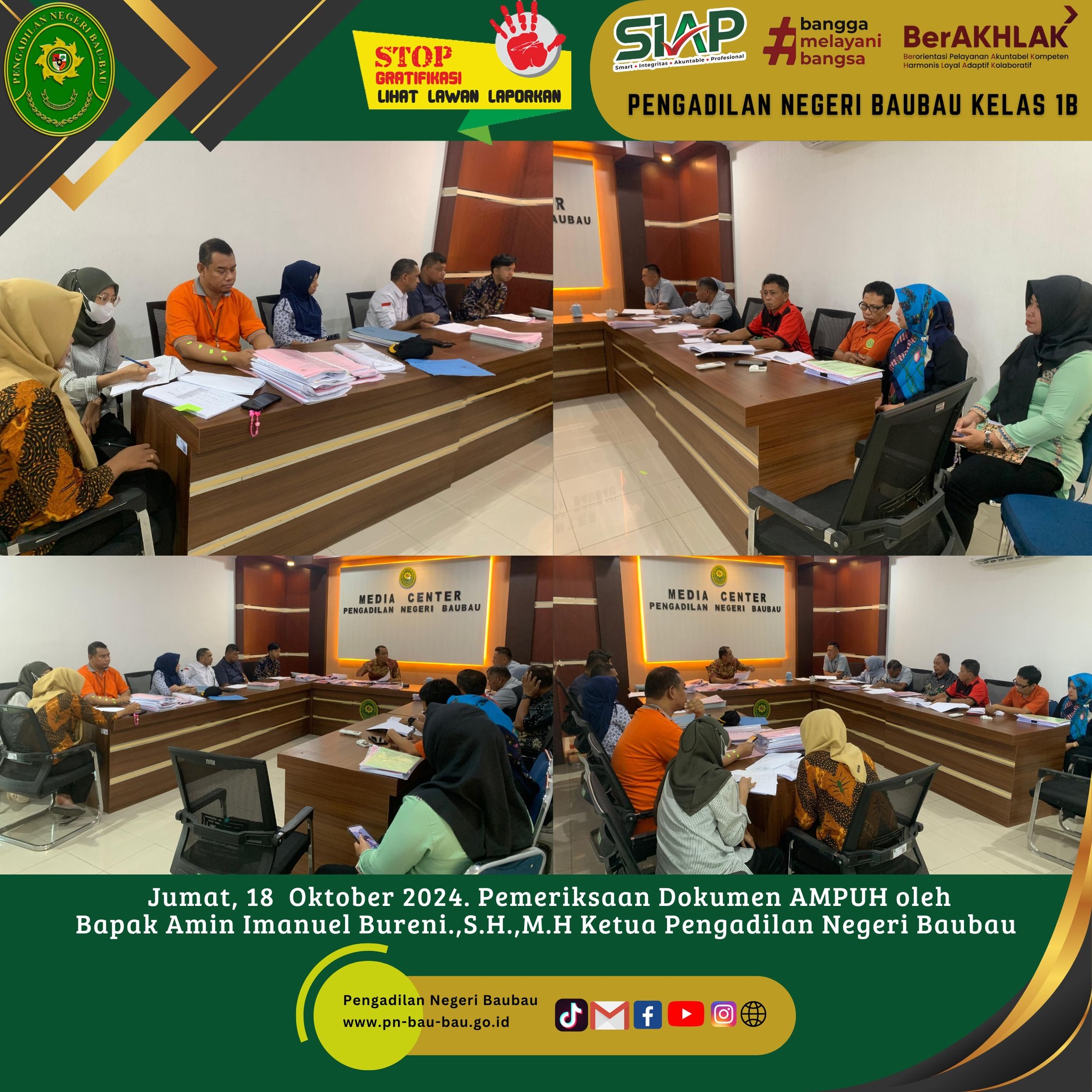 Bertempat di Ruang Media Center pukul 09.00 Wita sampai selesai telah dilaksanakan Kegiatan Pemeriksaan terhadap Dokumen AMPUH oleh Bapak Amin Imanuel Bureni.,S.H.,M.H Ketua Pengadilan Negeri Baubau.