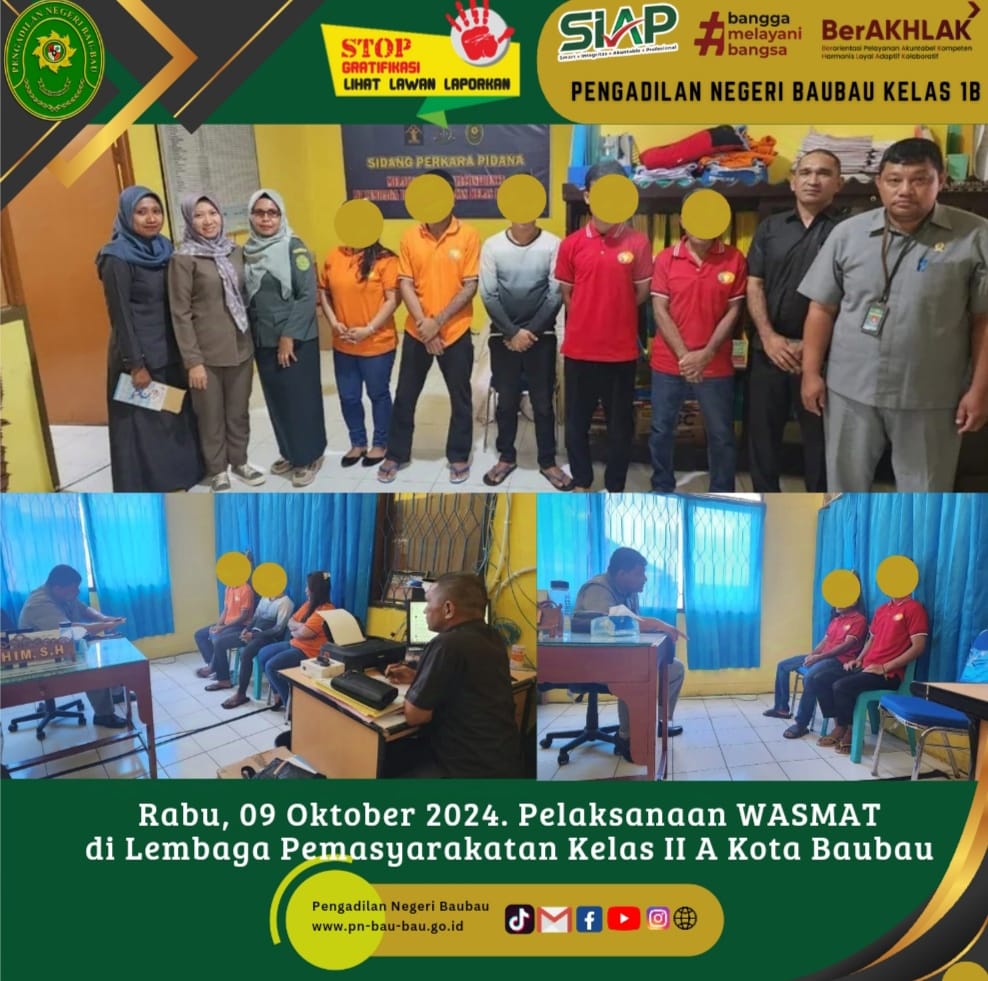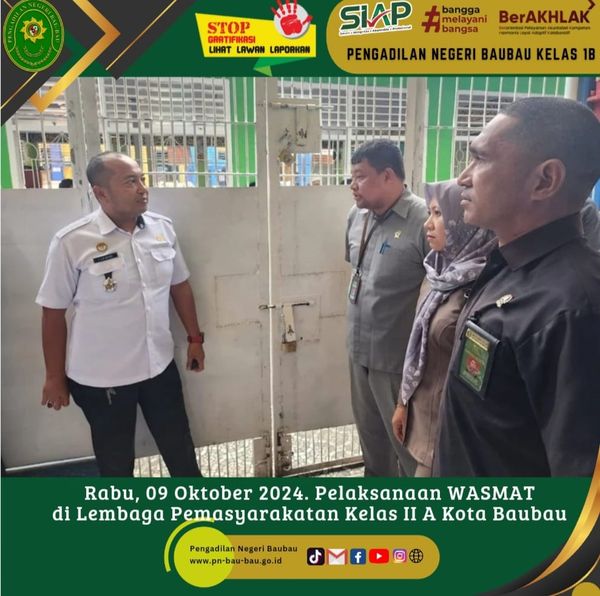 Pada Hari Rabu, 09 Oktober 2024 telah dilaksanakan Kegiatan Pelaksanaan Pengawasan dan Pengamatan (WASMAT) oleh Hakim Pengadilan Negeri Baubau Bapak Rachmat S.H.i La Hasan.,S.H,M.H. dan Staff Kepaniteraan Pidana di Lembaga Pemasyarakatan Kelas IIA Baubau.