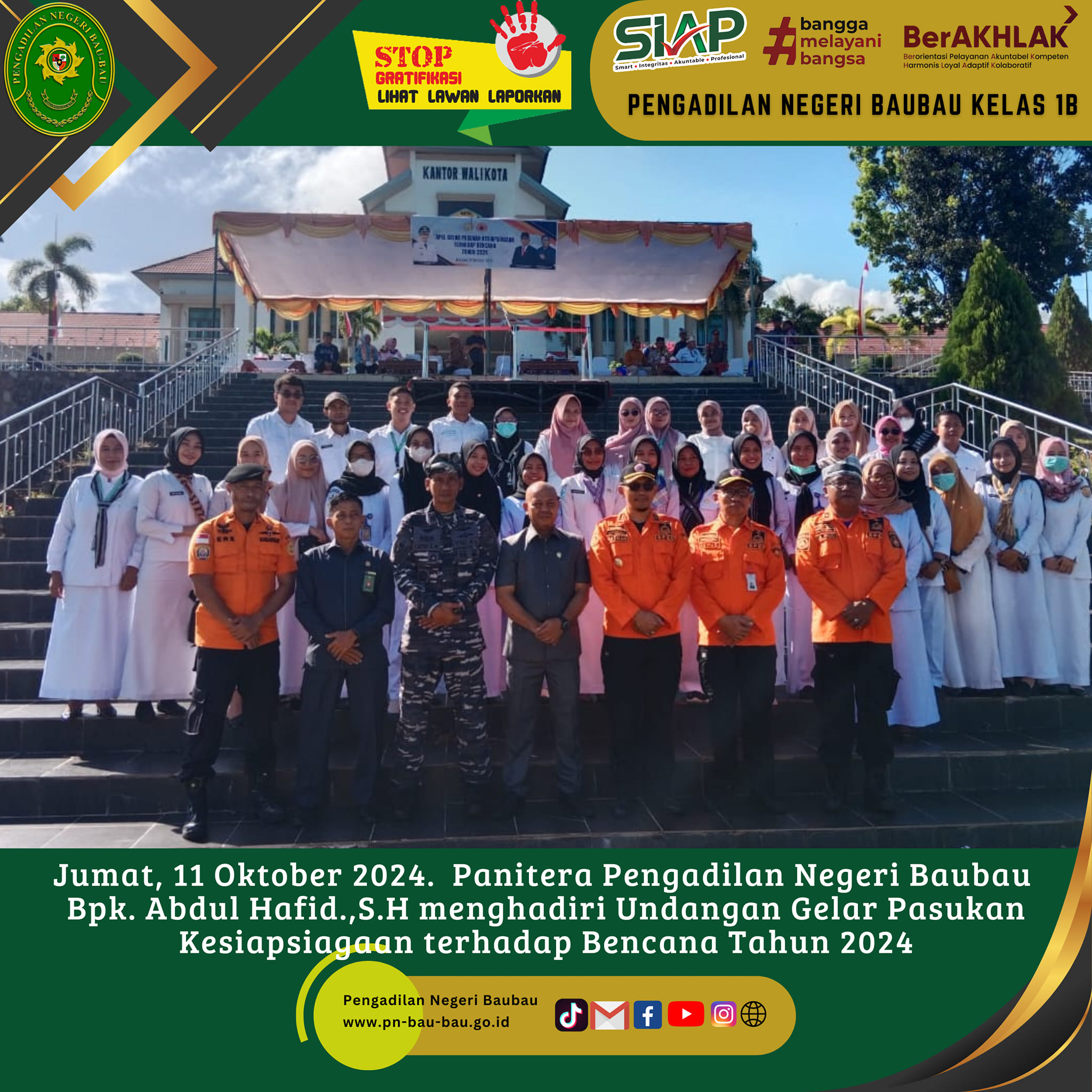 Jumat, 11 Oktober 2024 Panitera Pengadilan Negeri Baubau Bapak Abdul Hafid.,S.H menghadiri Undangan Gelar Pasukan Kesiapsiagaan terhadap Bencana Tahun 2024