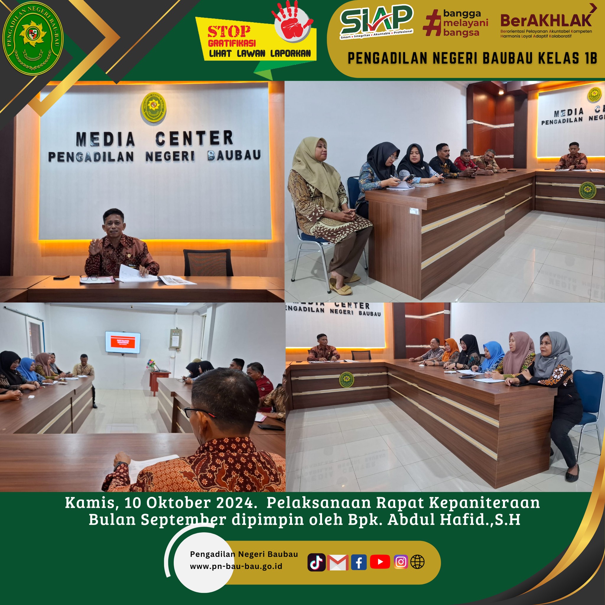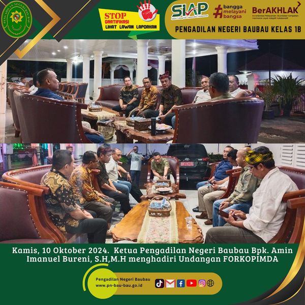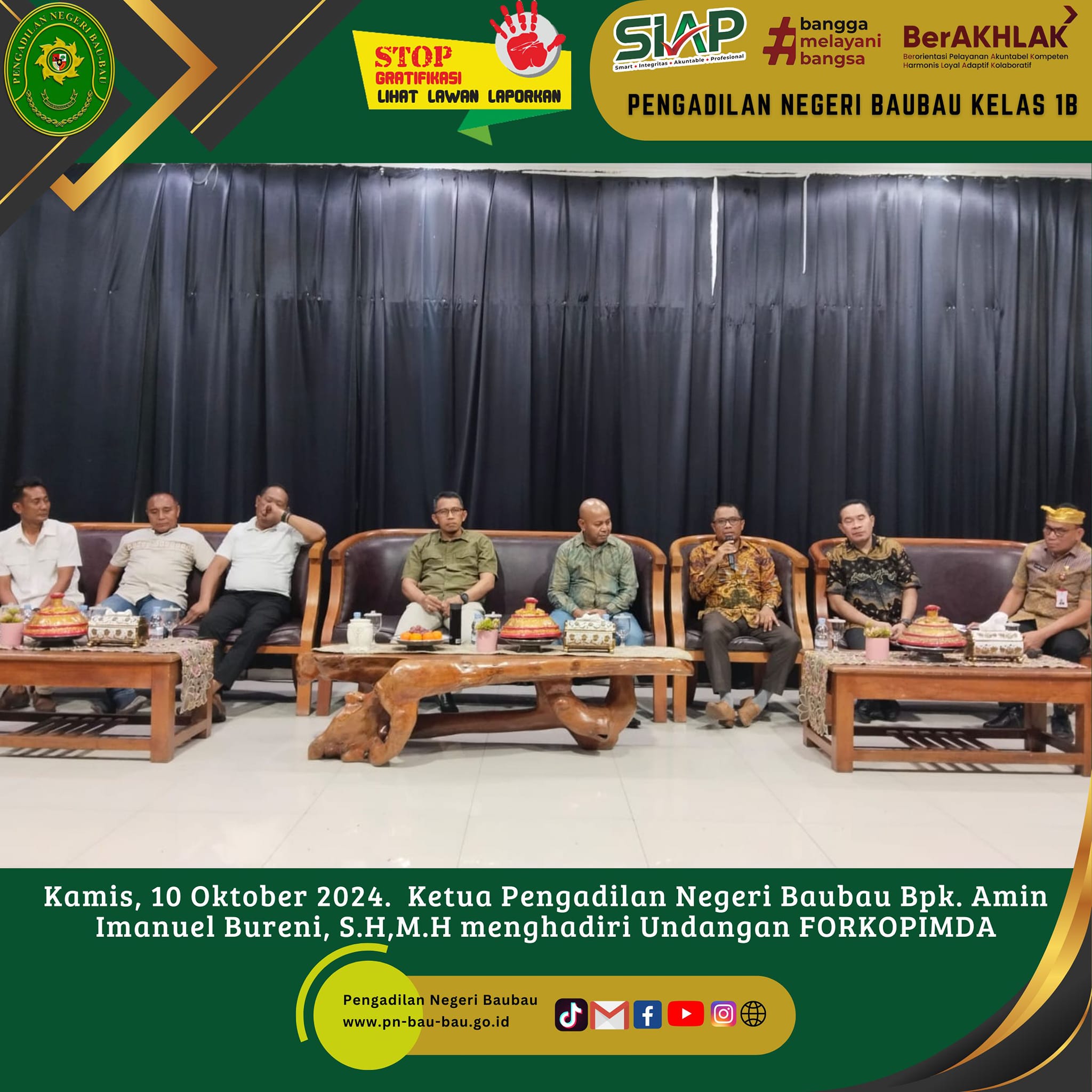 Kamis, 10 Oktober 2024 Ketua Pengadilan Negeri Baubau Bapak Amin Imanuel Bureni, S.H., M.H menghadiri Rapat FORKOPIMDA Kota Baubau dalam Rangka mendukung Tugas-tugas Umum Pemerintahan, Pembangunan, dan Pembinaan Kemasyarakatan