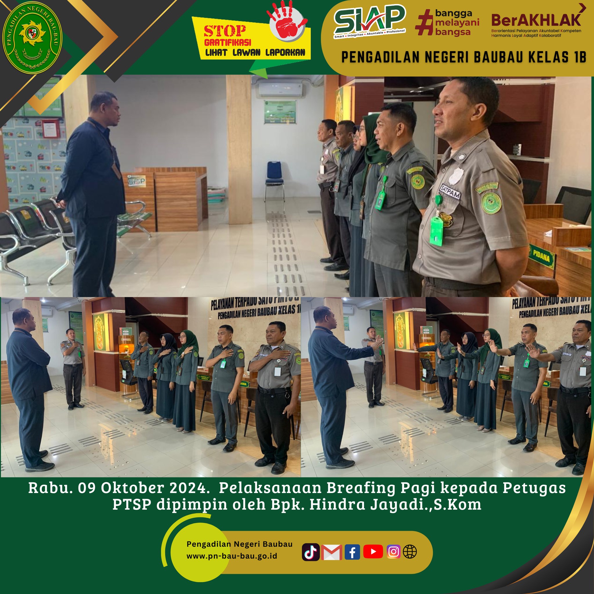 Rabu, 09 Oktober 2024 Telah dilaksanakan briefing pagi petugas PTSP yang dipimpin oleh Bapak Hindra Jayadi, S.Kom. selaku Kepala Sub Bagian Umum dan Keuangan