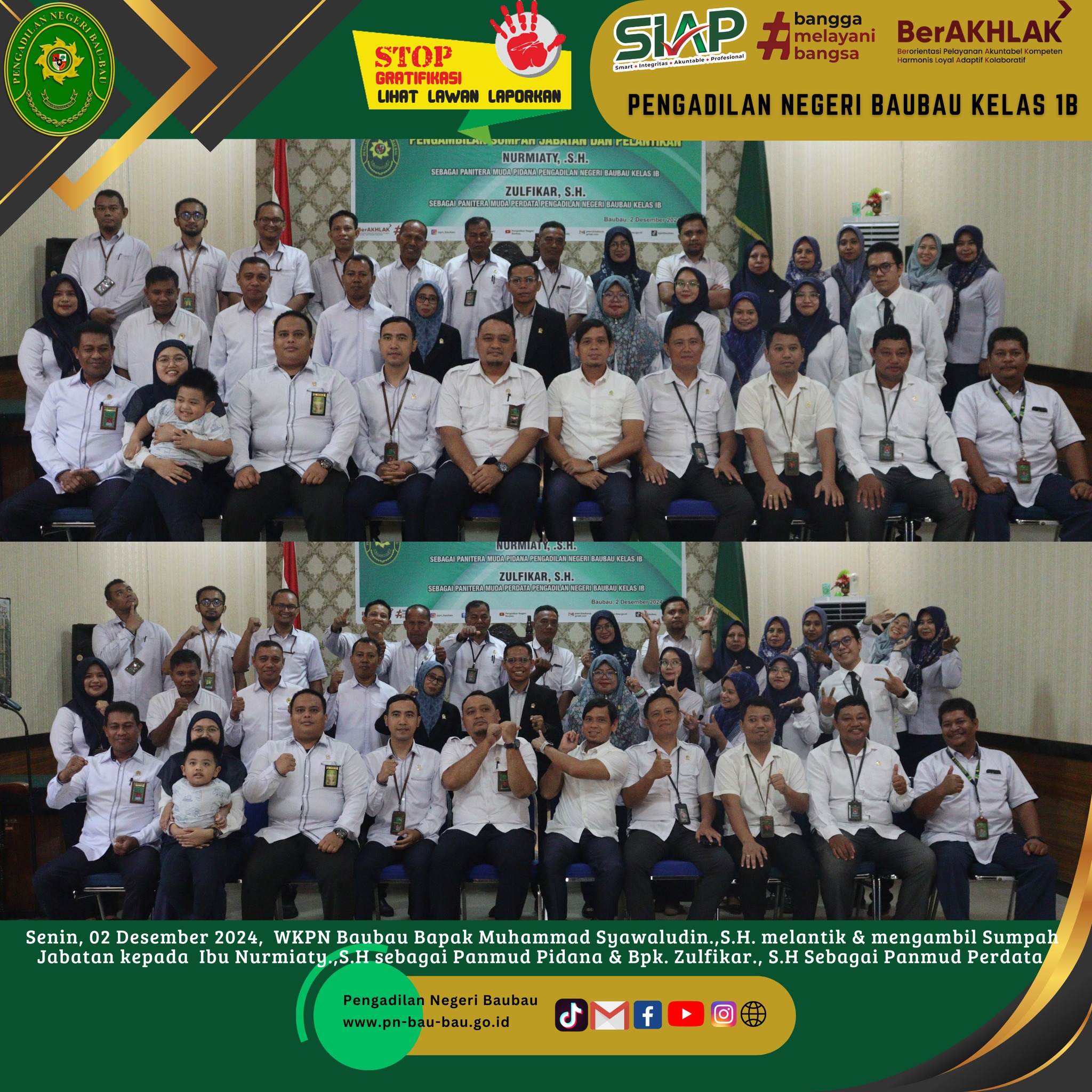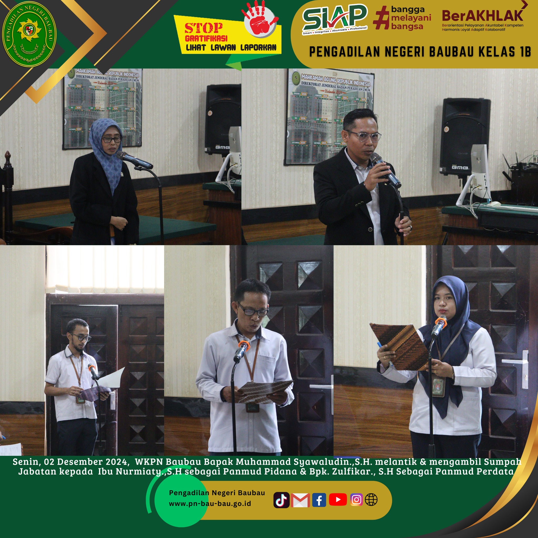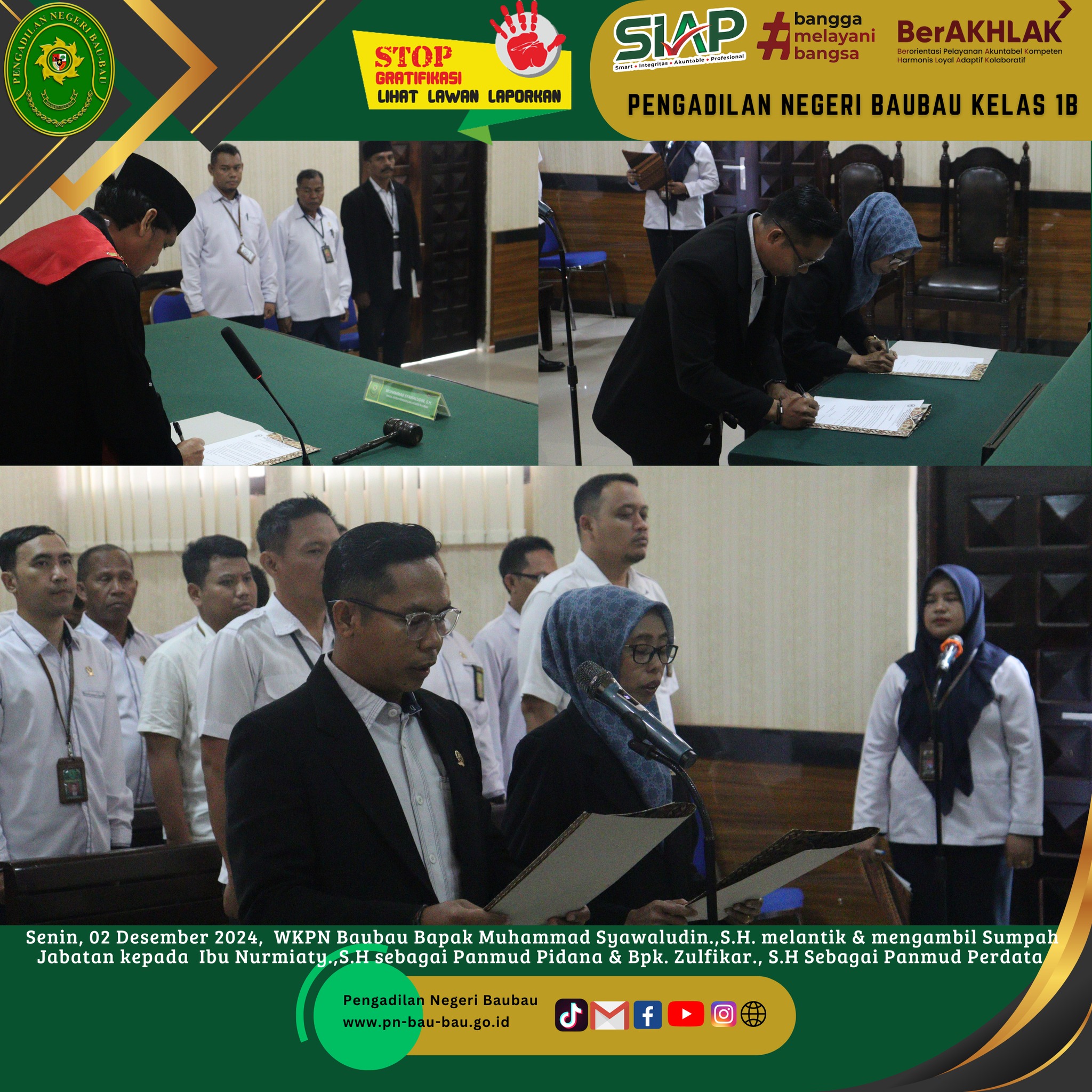 Bertempat di Ruang Sidang Utama telah dilaksanakan Kegiatan Pelantikan dan Pengambilan Sumpah Jabatan Ibu Nurmiaty.,S.H sebagai Panitera Muda Pidana dan Bapak Zulfikar.,S.H sebagai Panitera Muda Perdata pada Pengadilan Negeri Baubau yang sebelumnya masing - masing menjabat sebagai Panitera Muda Perdata di Pengadilan Negeri Pasarwajo dan Panitera Muda Pidana di Pengadilan Negeri Unaaha oleh Wakil Ketua Pengadilan Negeri Baubau Kelas IB Bapak Muhammad Syawaludin.,S.H berdasarkan Hasil Rapat Promosi / Mutasi dan Pindah Tugas Tenaga Kepaniteraan Mahkamah Agung RI dan Badan Peradilan Umum Nomor 1105/DJU/SK/KP4.1/3/X/2024 Tentang Promosi dan Mutasi Kepaniteraan di Lingkungan Peradilan Umum Tanggal 18 Oktober 2024.