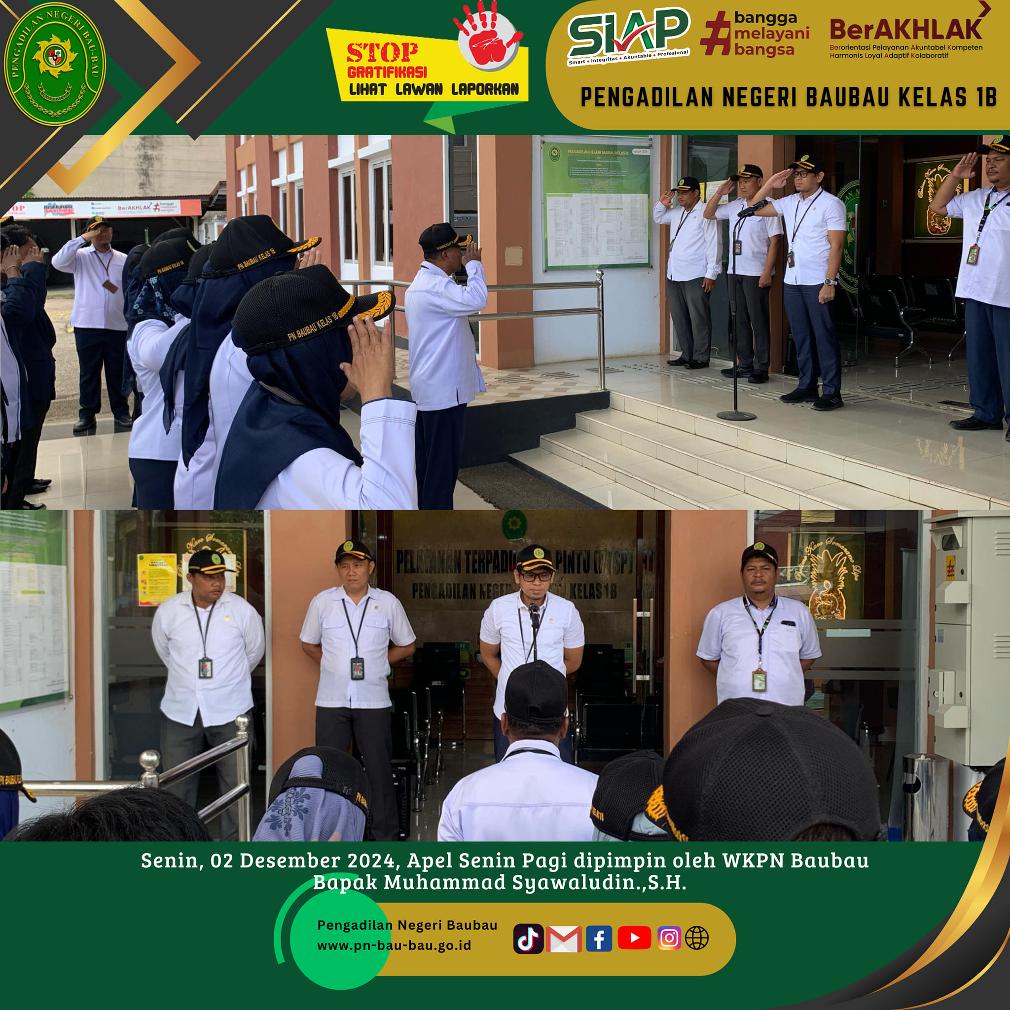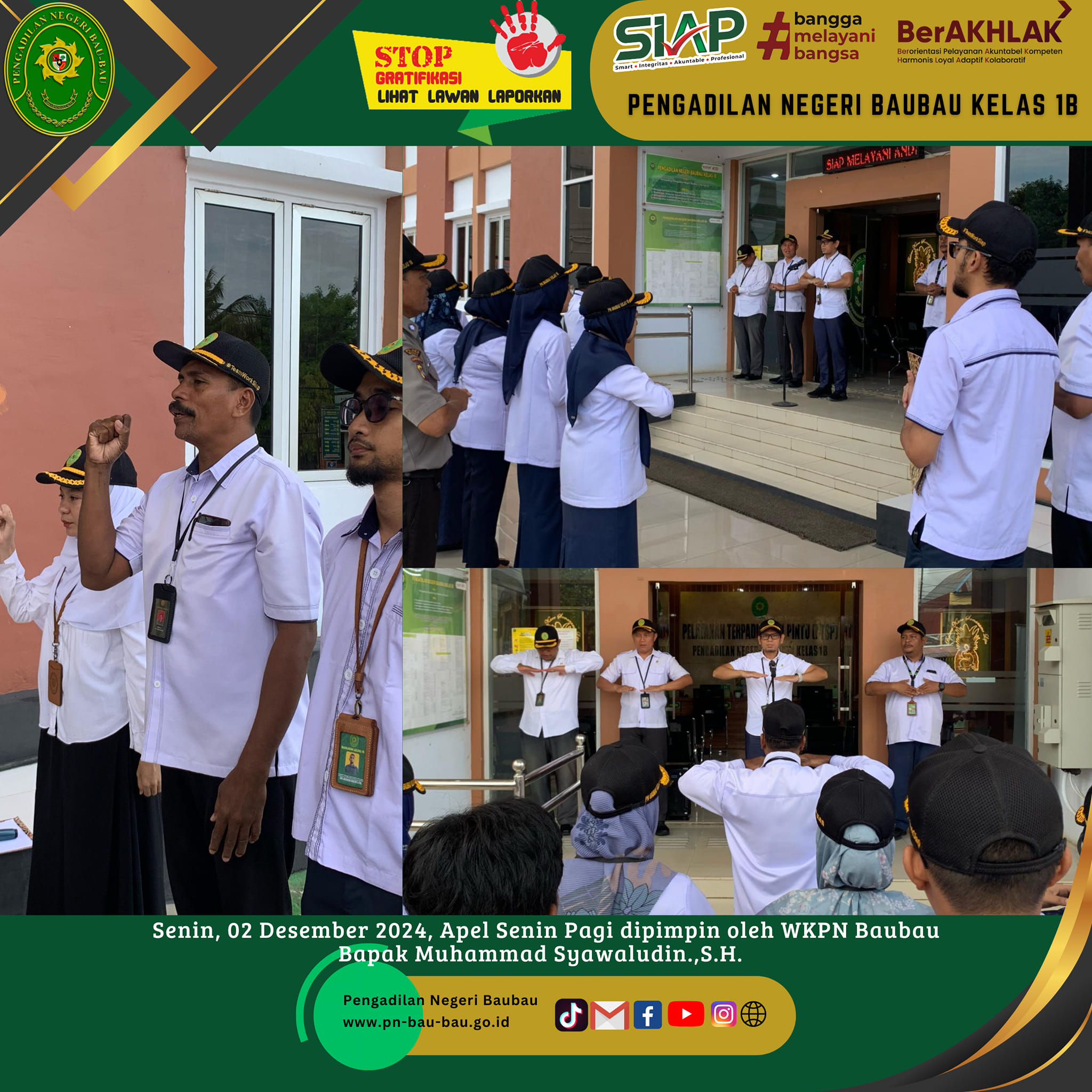 Kegiatan ini dilaksanakan pada pukul 09.00 Wita sampai selesai dan dihadiri oleh Para Hakim, Panitera, Sekretaris, Para Panmud, Para Kasub, PP,JS/JSP, Staf, PPNPN Pengadilan Negeri Baubau dan Pasarwajo.