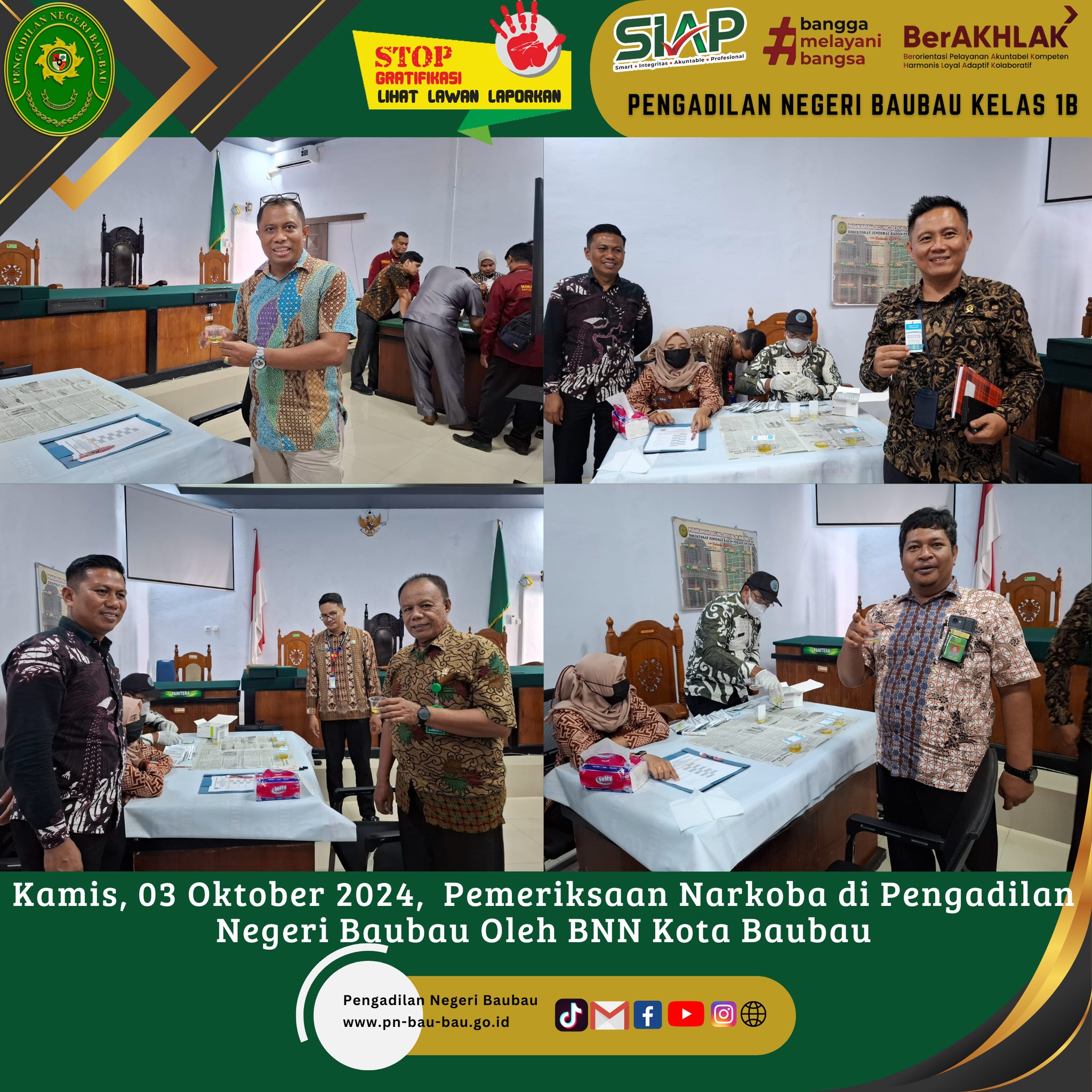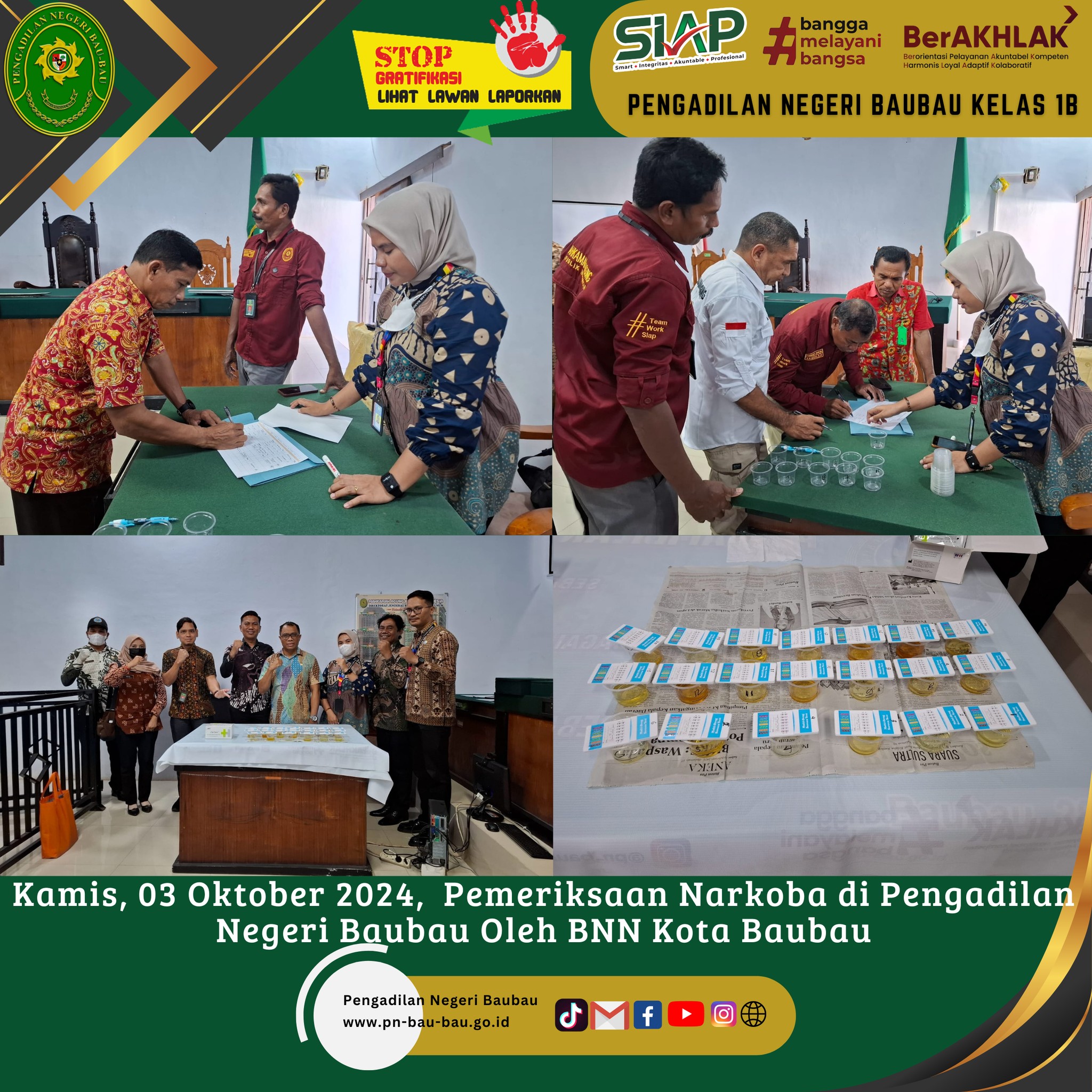 Pemeriksaan Narkoba di Pengadilan Negeri Baubau Oleh Badan Narkotika Nasional (BNN) Kota Baubau dengan menggunakan alat Drug of Abuse (DoA) Test dengan sampel urine kepada Ketua, Wakil ketua, Hakim, Panmud, Kasub, Staf serta serta PPNPN Pengadilan Negeri Baubau Kerjasama antara Pengadilan Negeri Baubau Kelas 1B dengan BNN Kota Baubau.
