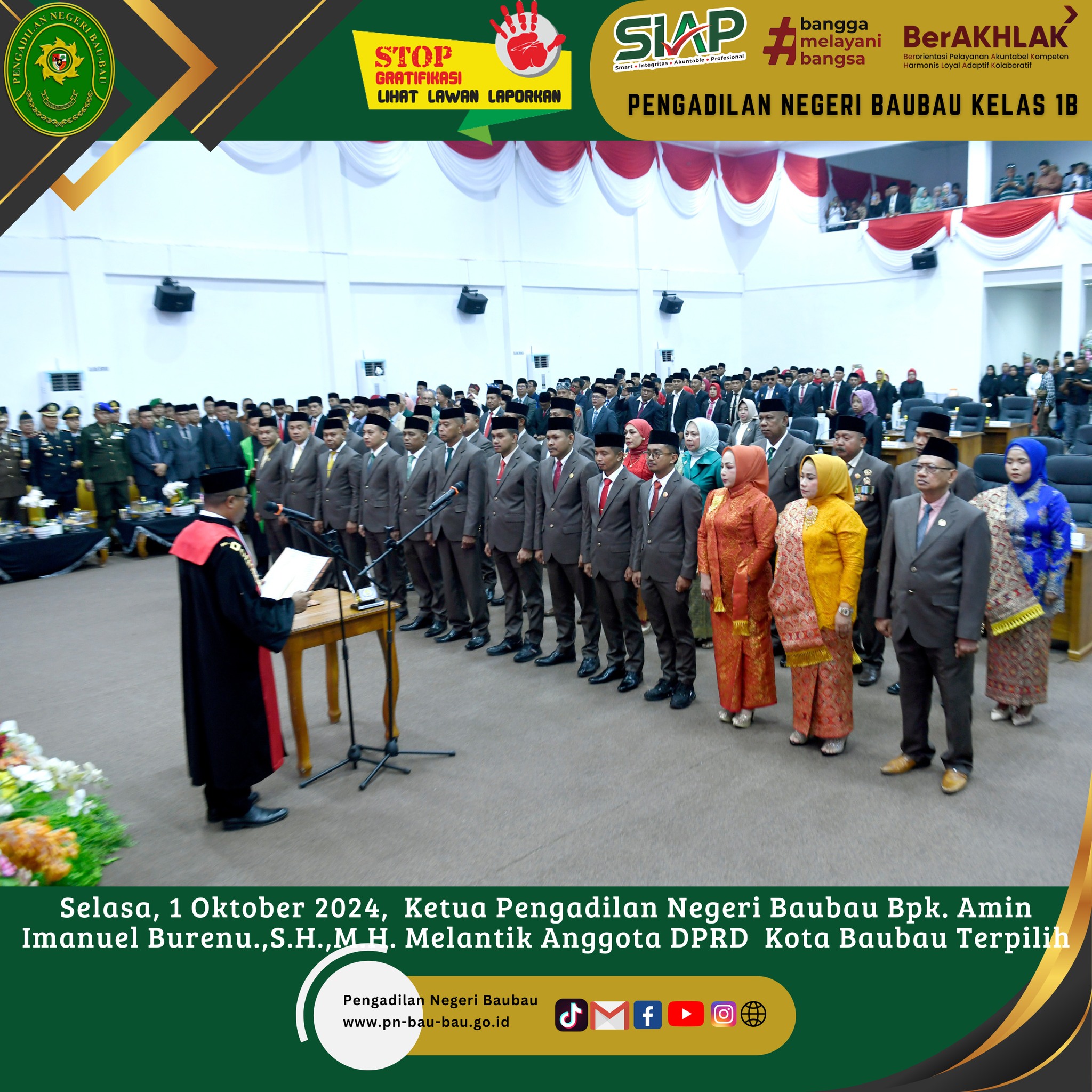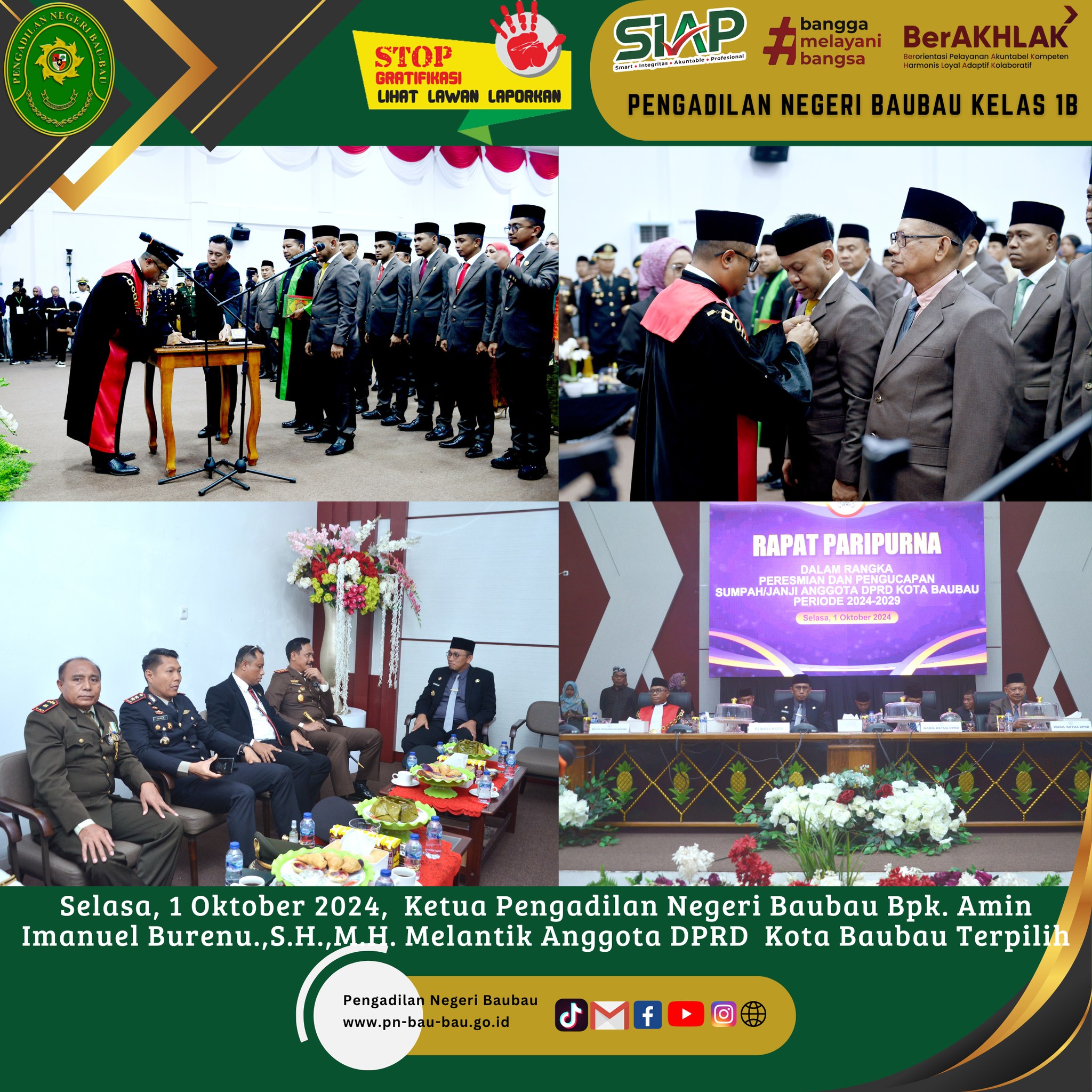 Ketua Pengadilan Negeri Baubau Bpk. Amin Imanuel Bureni.,S.H.,M.H. Melantik Anggota DPRD Kota Baubau Terpilih dalam Rapat Paripurna Dewan Perwakilan Daerah Kota Baubau Masa Bakti 2024-2029 bertempat di Gedung DPRD Kota Baubau.
