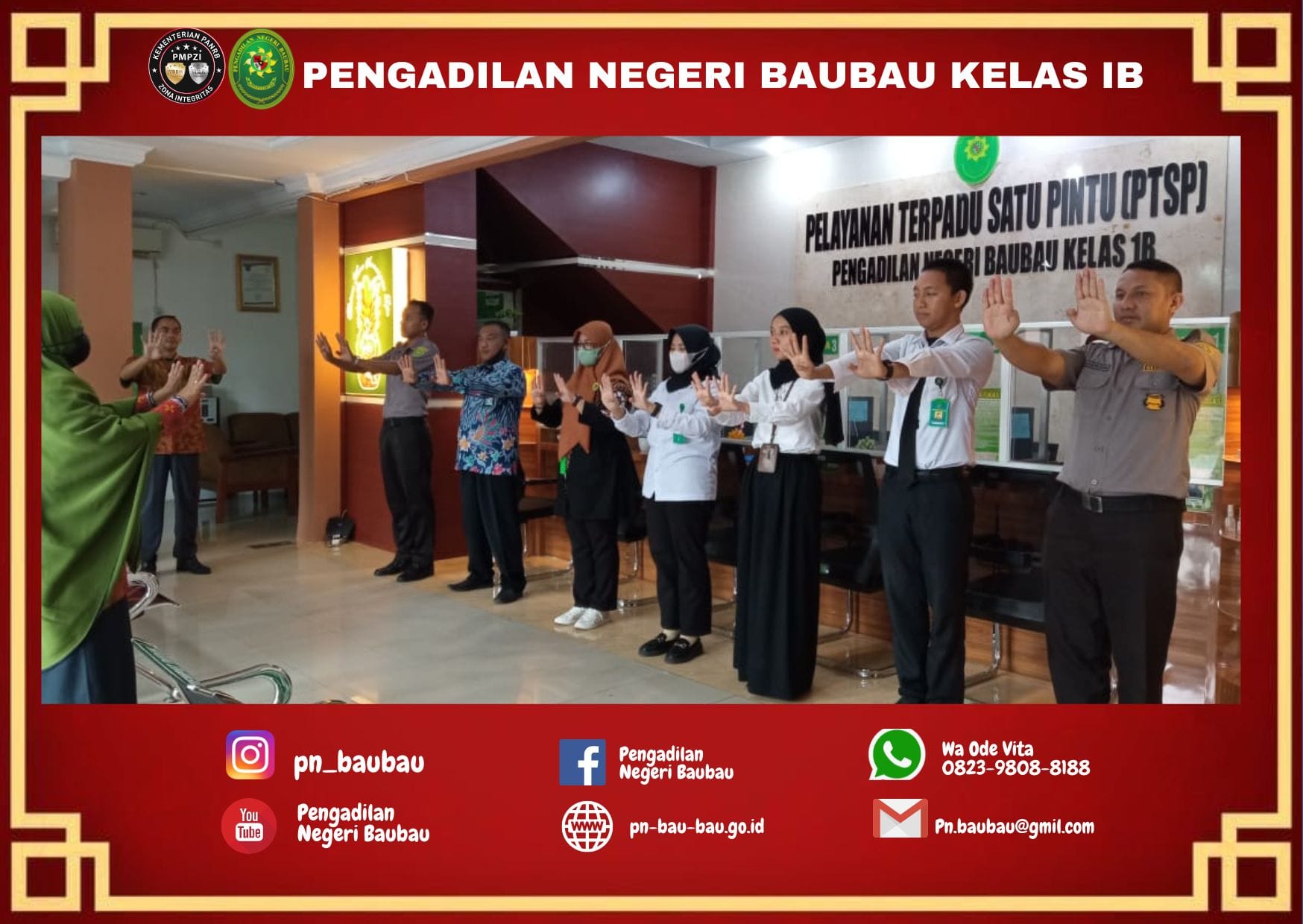 Bertempat di Ruang Pelayanan Terpadu Satu Pintu (PTSP) Pengadilan Negeri Baubau, pagi ini telah diadakan “Briefing Pagi” kepada petugas PTSP. Tim Supervisi hari ini dilaksanakan oleh Ibu Ningsih, S.E Sekretaris Pengadilan Negeri Baubau.