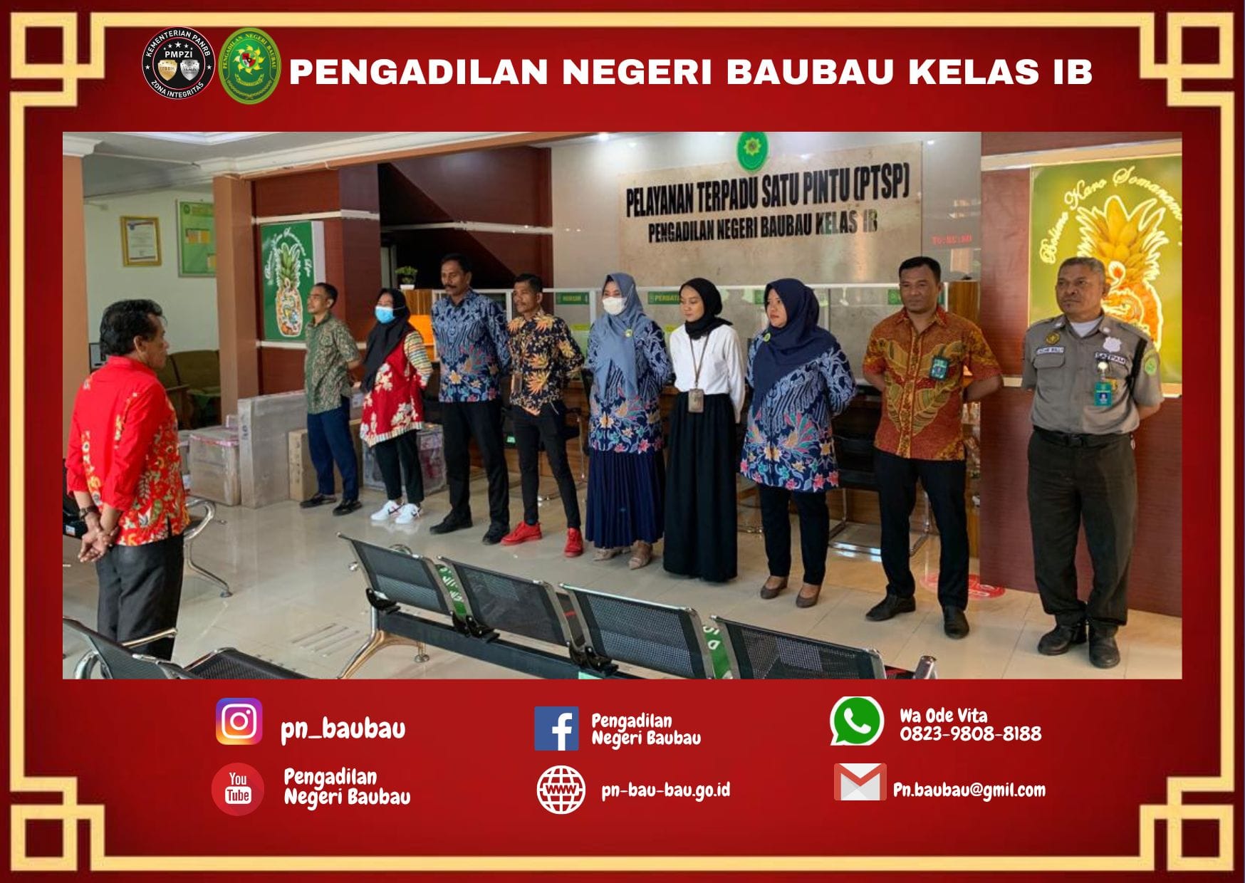 Bertempat di Ruang Pelayanan Terpadu Satu Pintu (PTSP) Pengadilan Negeri Baubau, pagi ini telah diadakan “Briefing Pagi” kepada petugas PTSP. Tim Supervisi hari ini dilaksanakan oleh Panmud Perdata, Bapak L.M Suryadi, S.H.
