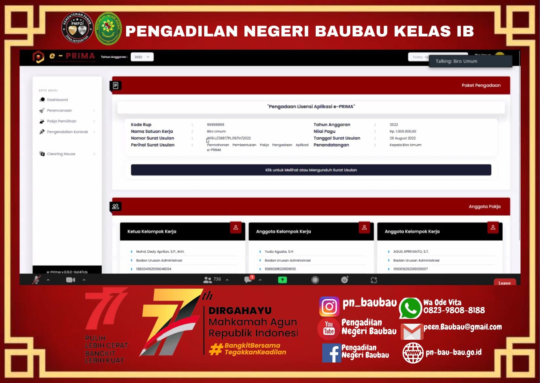 Kasub. Perencanaan, TI, dan Pelaporan Ibu Hanila S.E. dan Operator Bapak Achmad Musthofa, S.Kom mengikuti Sosialisasi Aplikasi E-Prima (Electronic Procurement Implementation Management and Accountability). Aplikasi E-Prima ini adalah inovasi terbaru dari Mahkamah Agung Republik Indonesia yang membantu Unit Kerja Pengadaan Barang dan Jasa (UKPBJ) dalam mengelola atau memanajemen pelaksanaan pengadaan barang dan jasa yang terstruktur, jelas, logis serta berbasis kinerja. Kemampuan aplikasi ini meliputi manajemen layanan pengadaan, manajemen pembinaan Sumber Daya Manusia dan Kelembagaan, manajemen layanan secara elektronik, dan manajemen layanan pendampingan, konsultasi dan bimbingan teknis.