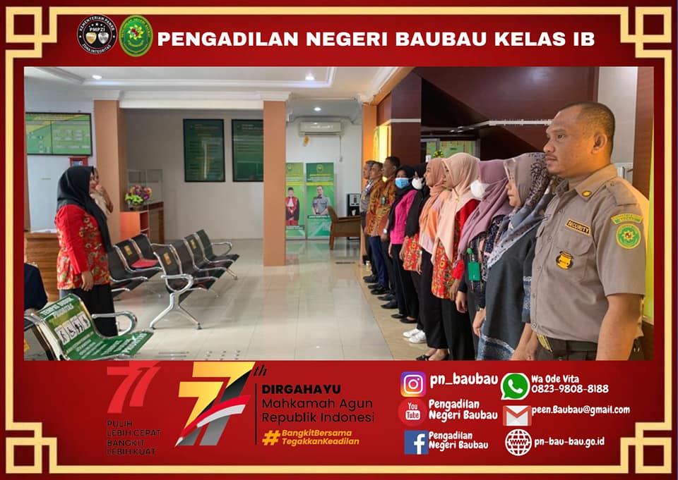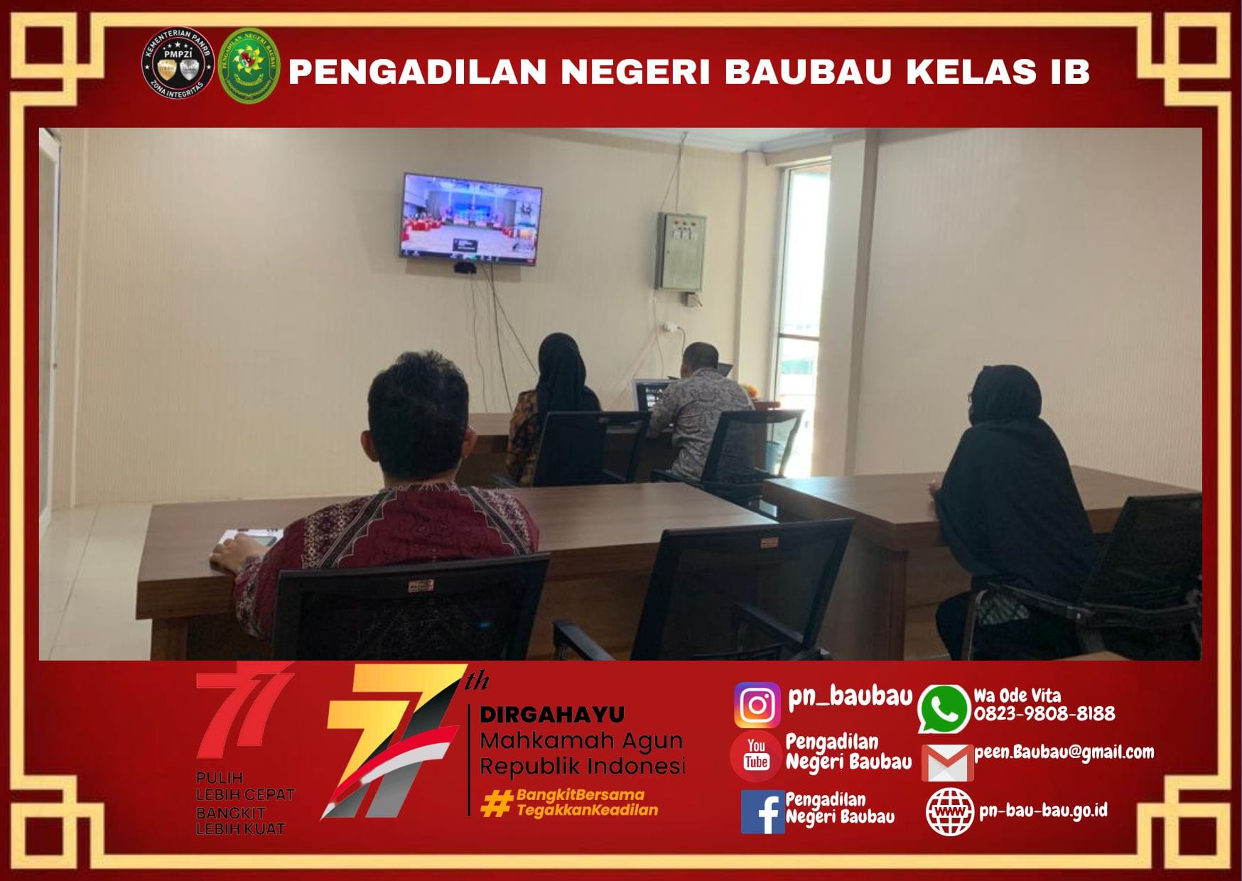 Bertempat di Ruang Media Center, Para Hakim, Panitera, & Sekretaris mengikuti Pembinaan Bidang Teknis & Administrasi Yudisial serta Pengawasan oleh Pimpinan Mahkamah Agung secara daring yang diselenggarakan oleh Wakil Ketua Mahkamah Agung Bidang Non Yudisial.