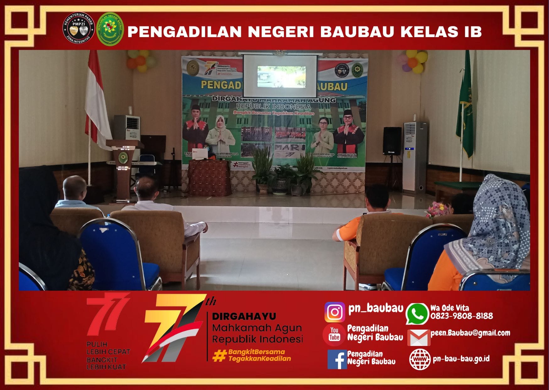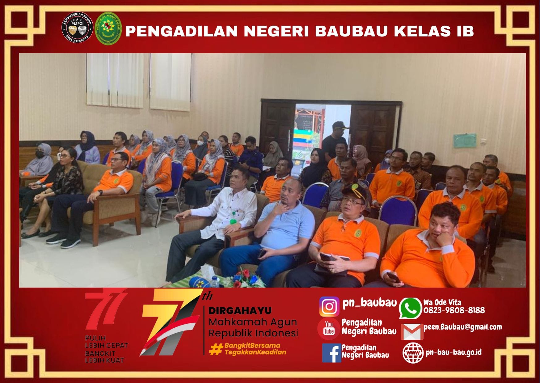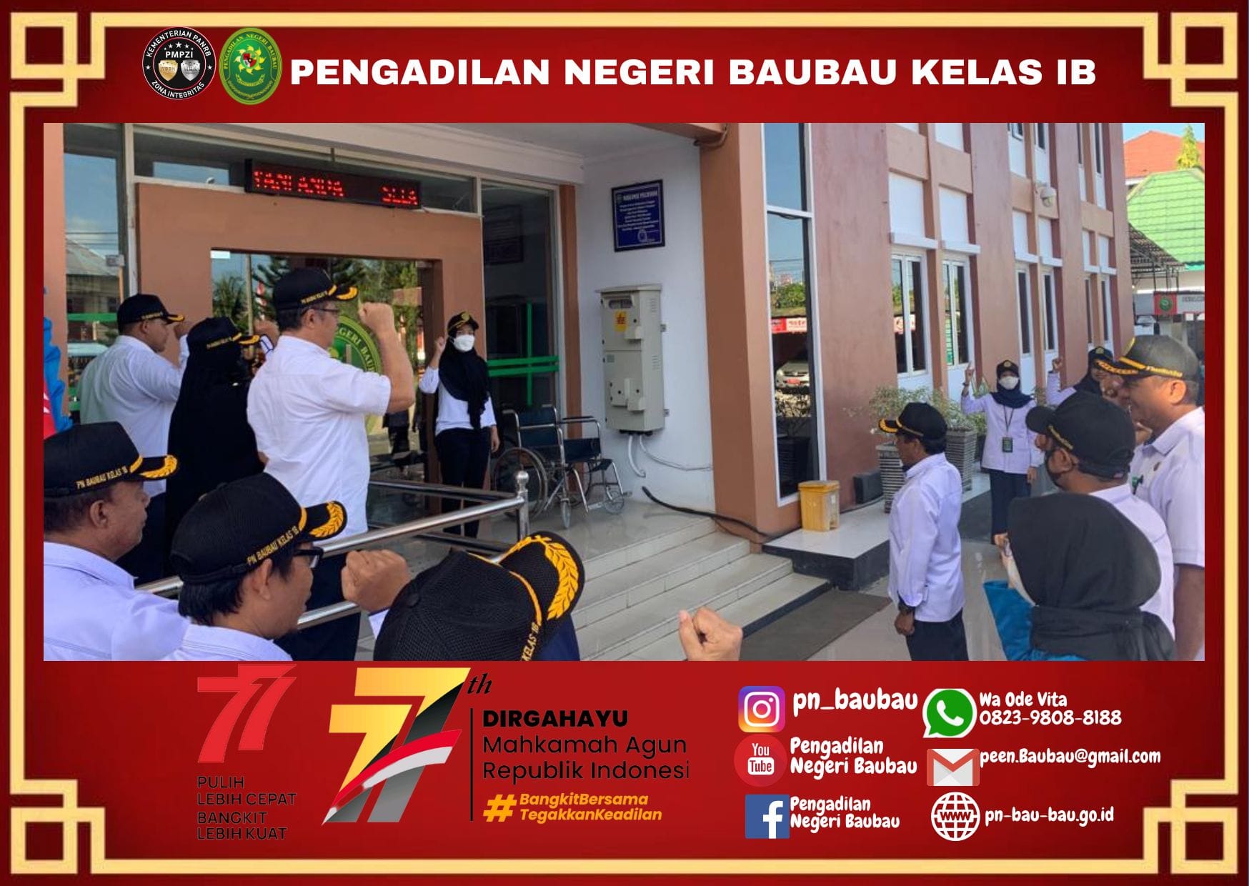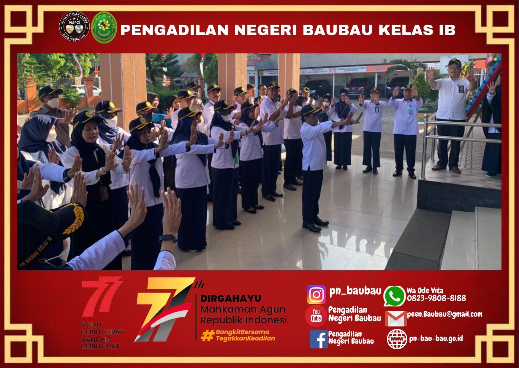 Pengadilan Negeri Baubau melaksanakan kegiatan Apel Pagi. yang diikuti oleh Hakim, Panitera, Sekretaris, Panitera Muda, Kepala Sub Bagian, Panitera Pengganti, JS/JSP, Pelaksana, dan CPNS.