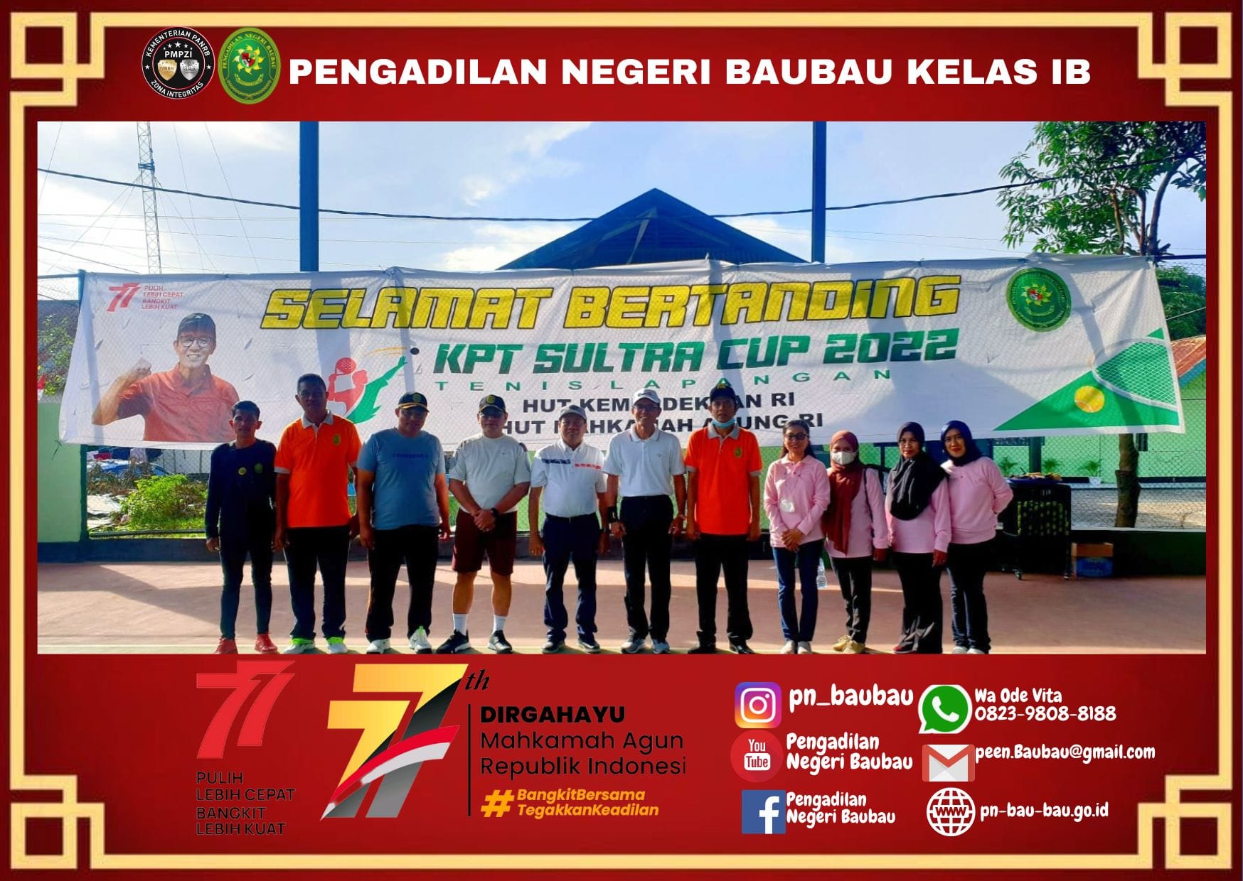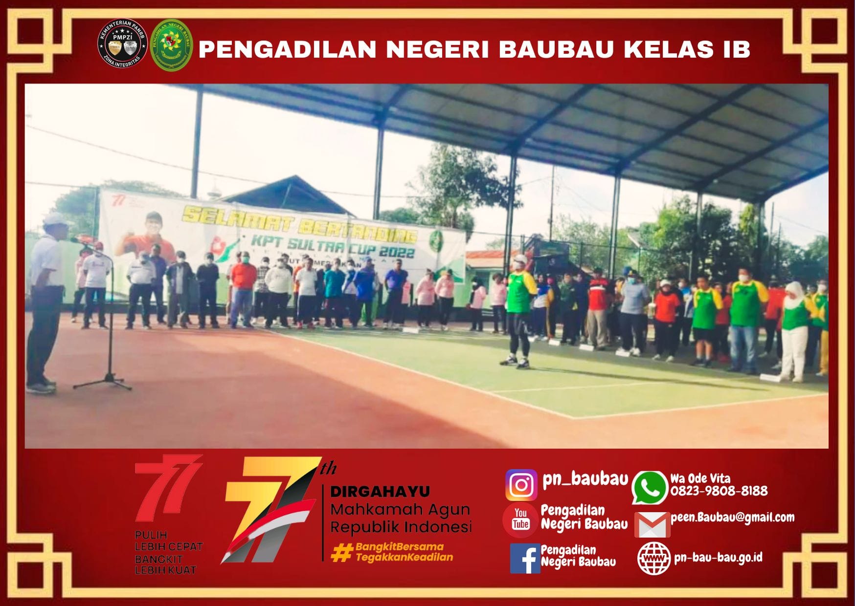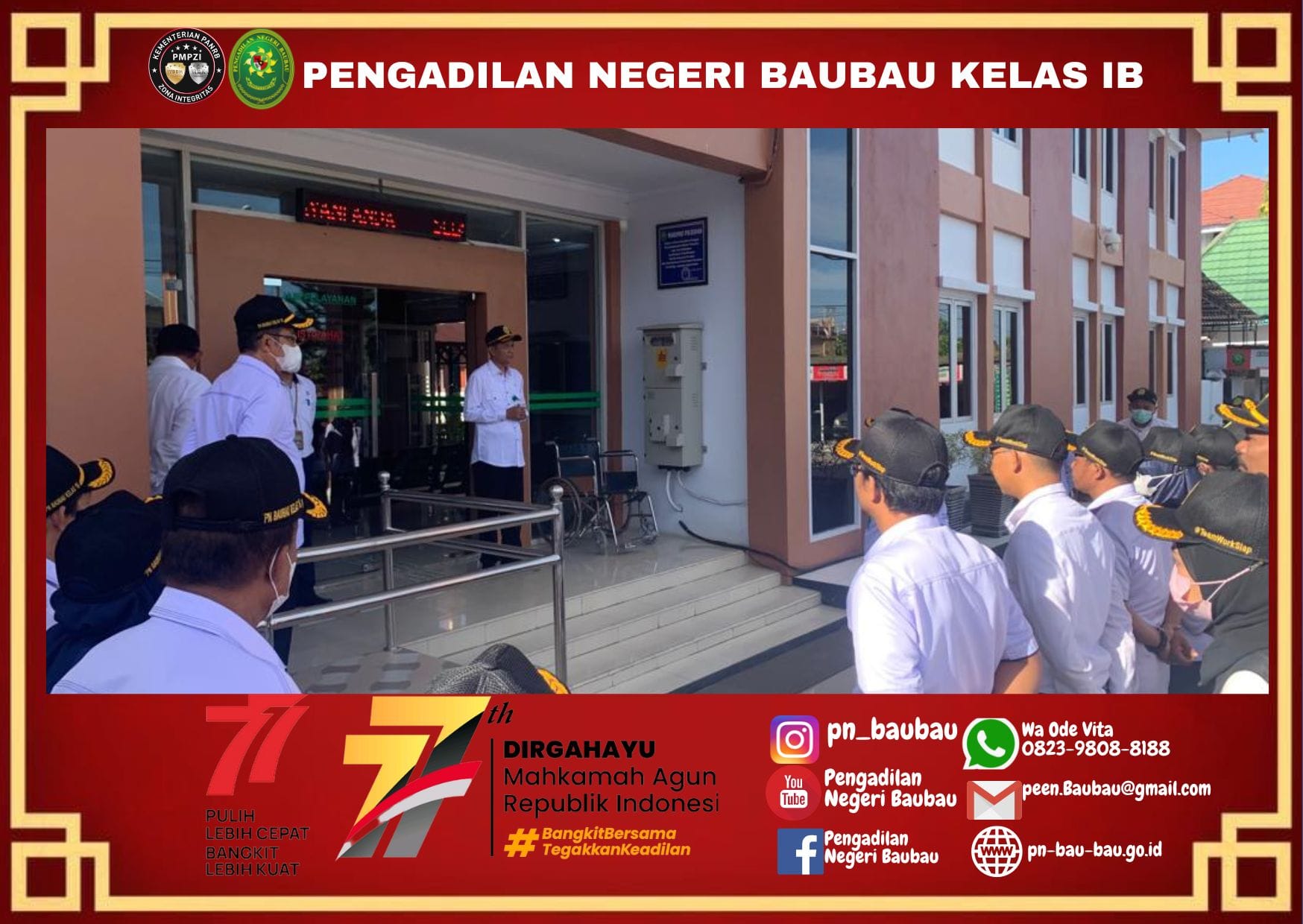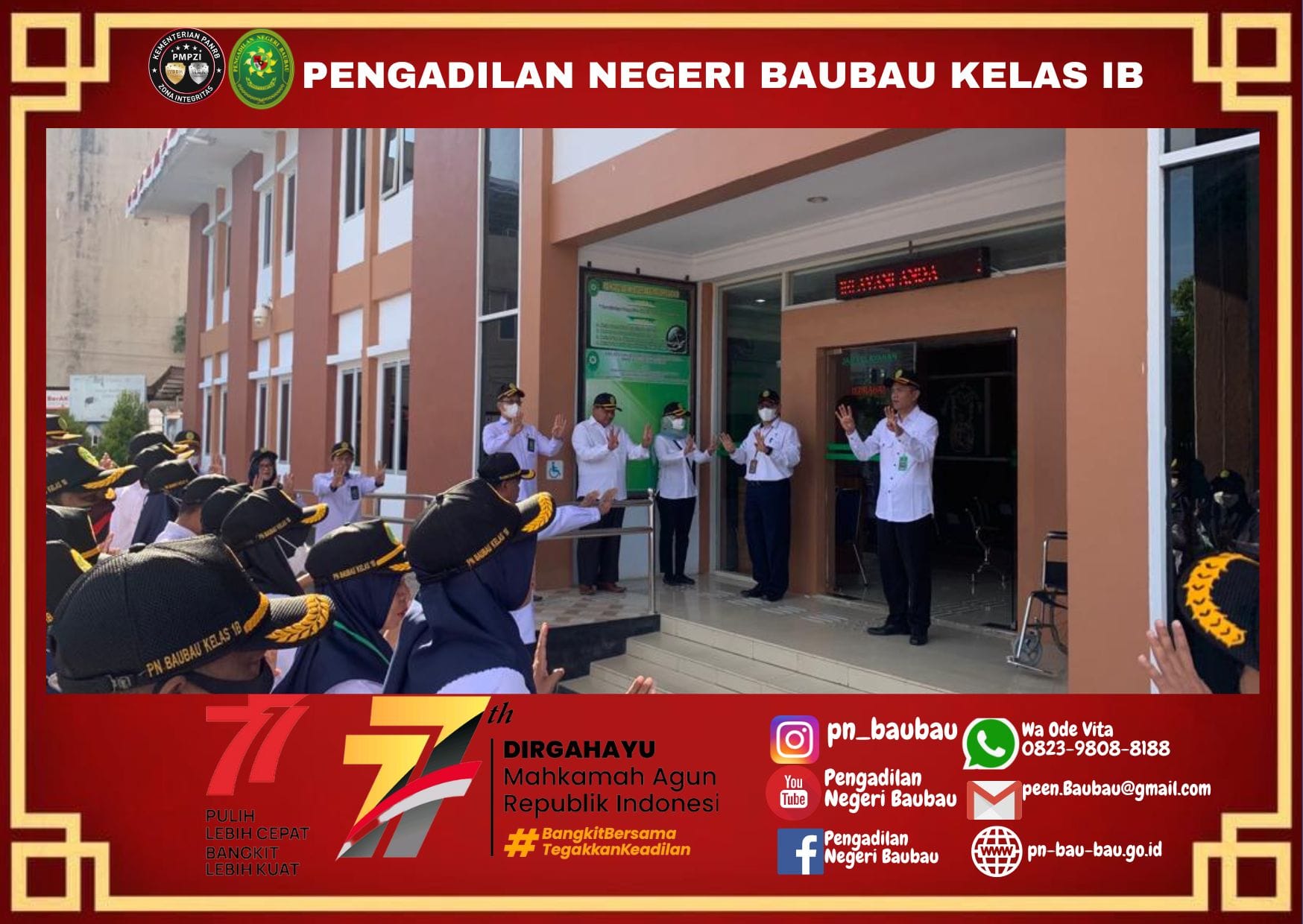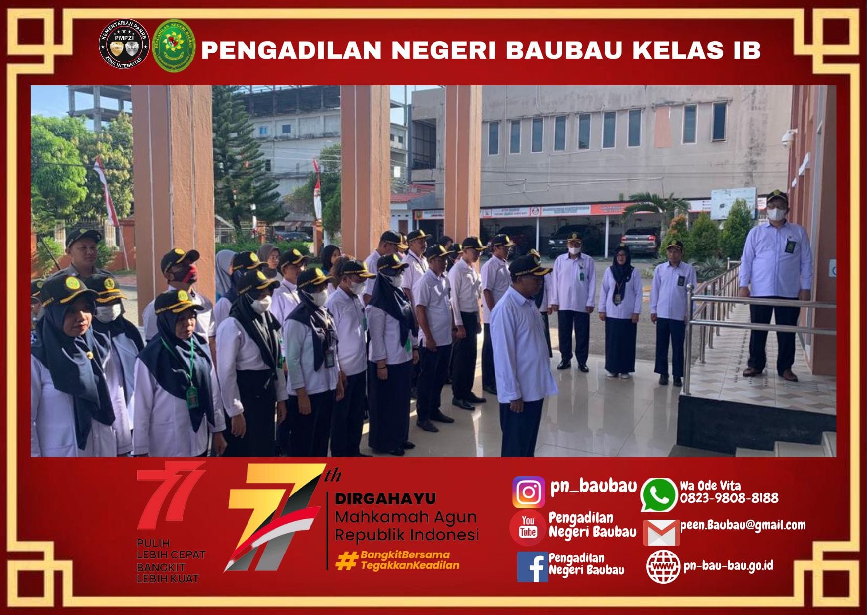 Pengadilan Negeri Baubau melaksanakan kegiatan Apel Pagi. yang diikuti oleh Hakim, Panitera, Sekretaris, Panitera Muda, Kepala Sub Bagian, Panitera Pengganti, JS/JSP, Pelaksana, dan CPNS.