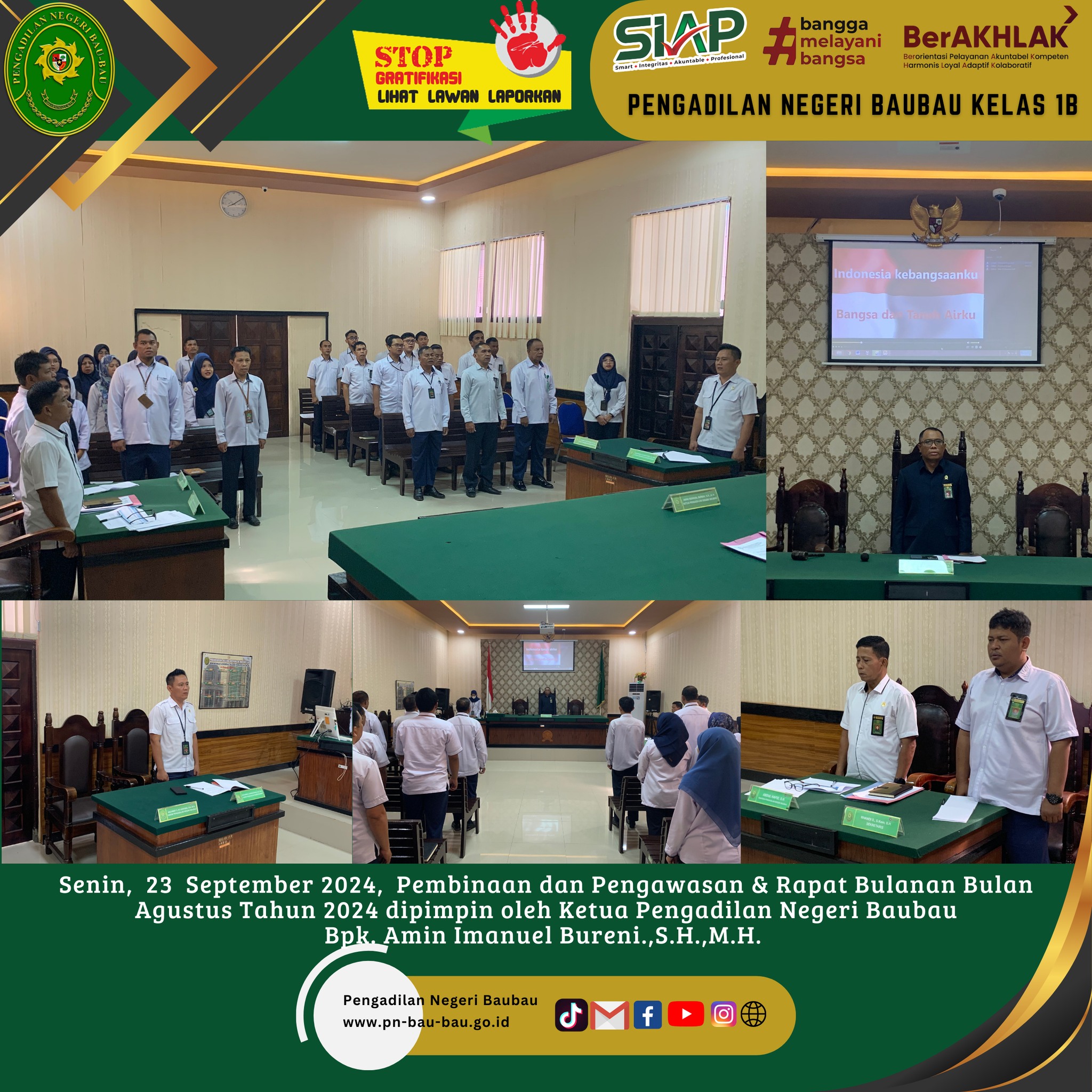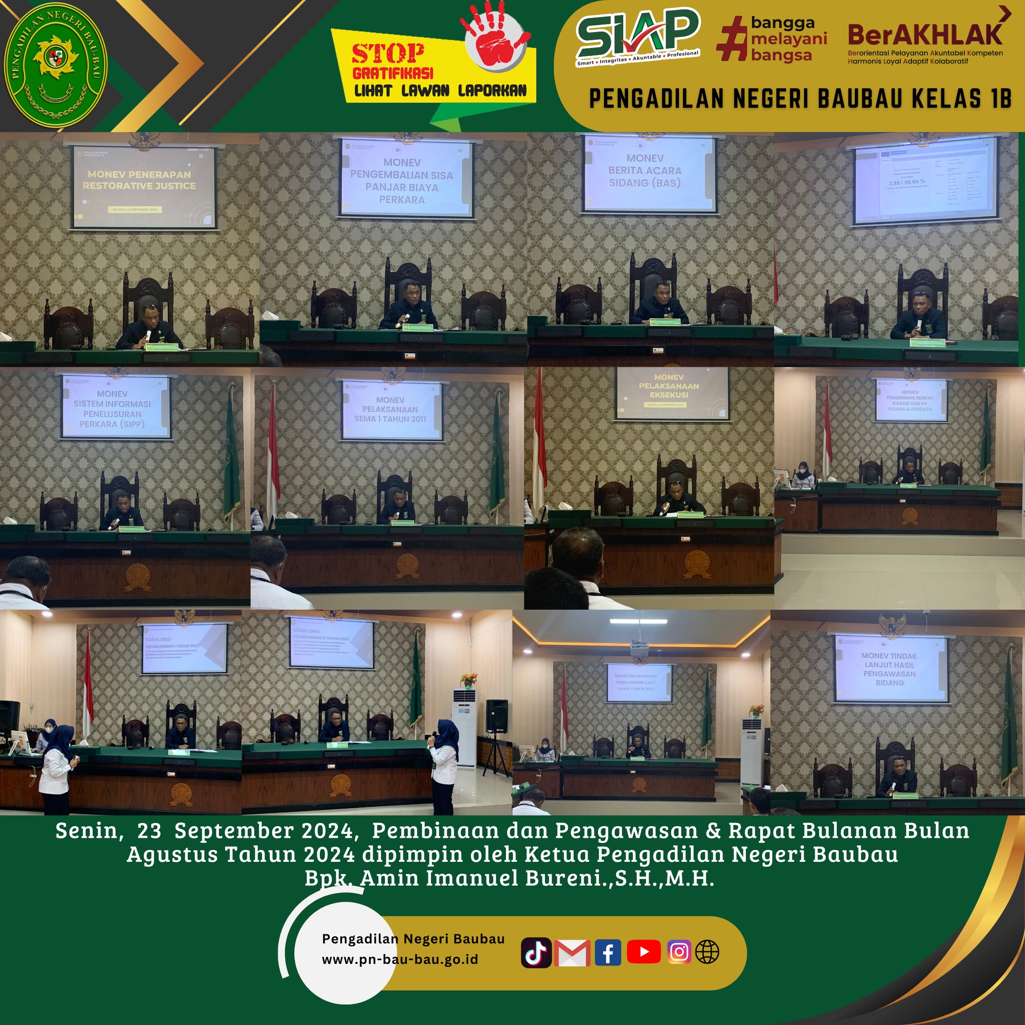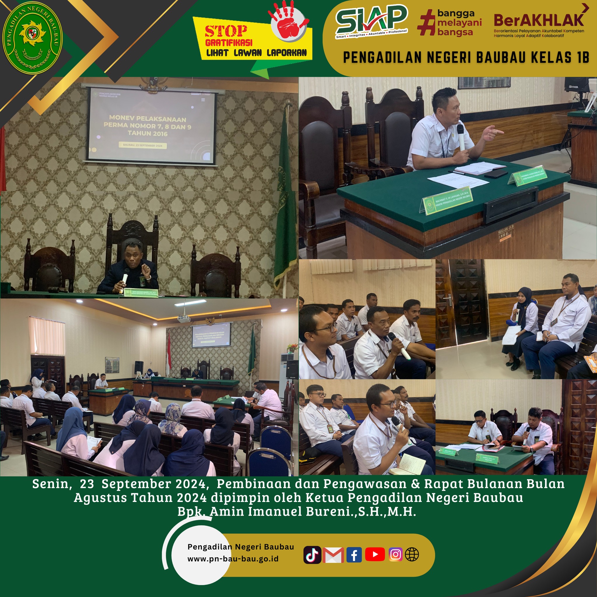 Bertempat di Ruang Sidang Utama telah dilaksanakan Rapat Bulanan, Pembinaan dan Pengawasan Periode Bulan Agustus Tahun 2024 yang dipimpin langsung oleh Ketua Pengadilan Negeri Baubau Bpk Amin Imanuel Bureni., S.H., M.H.
