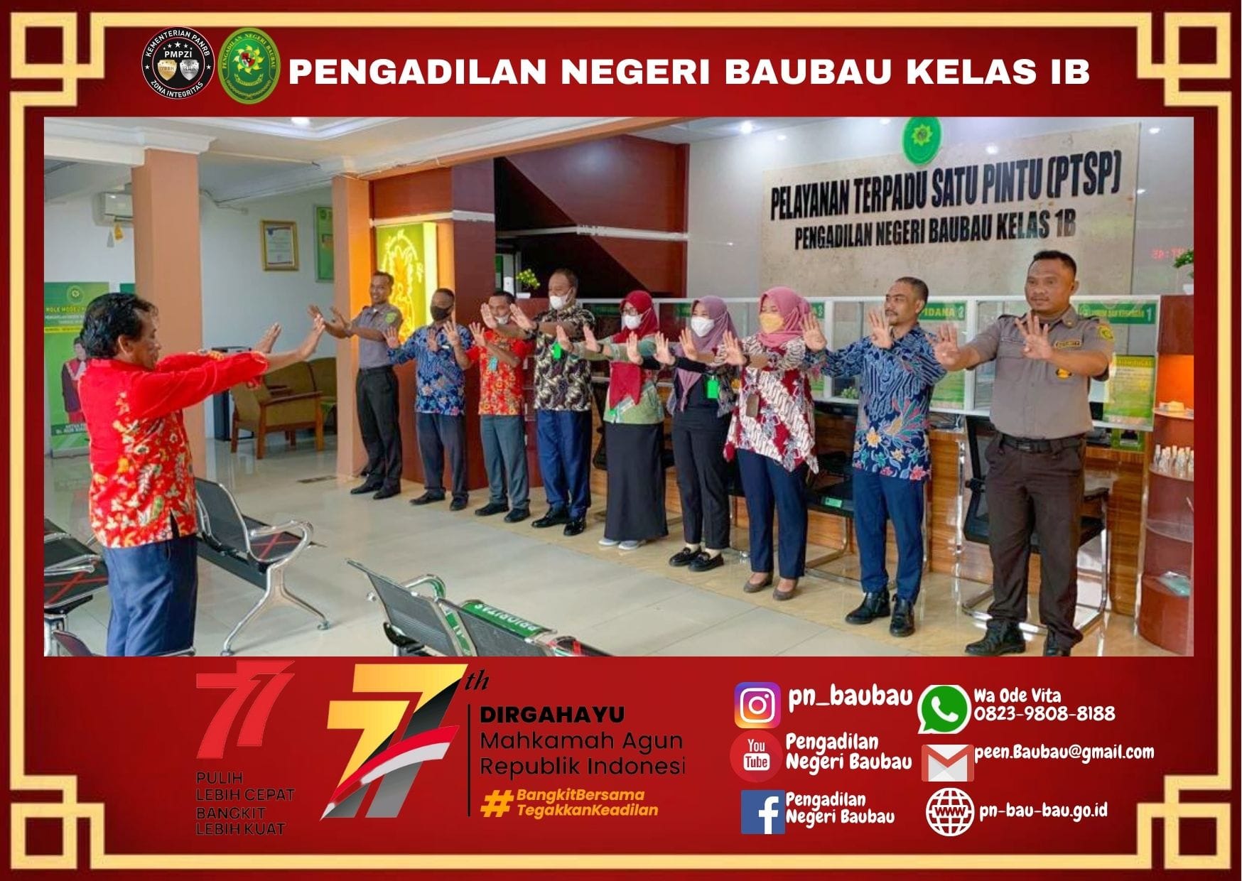 Bertempat di Ruang Pelayanan Terpadu Satu Pintu (PTSP) Pengadilan Negeri Baubau, pagi ini telah diadakan “Briefing Pagi” kepada petugas PTSP. Tim Supervisi hari ini dilaksanakan oleh Panitera, Bapak Abdul Kadir, S.H., M.H.