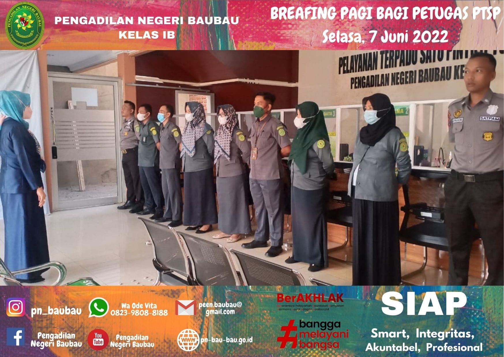 Bertempat di Ruang Pelayanan Terpadu Satu Pintu (PTSP) Pengadilan Negeri Baubau, pagi ini telah diadakan “Briefing Pagi” kepada petugas PTSP. Tim Supervisi hari ini dilaksanakan oleh Kasubag. Umum & Keuangan, Ibu Kamariah Zain
