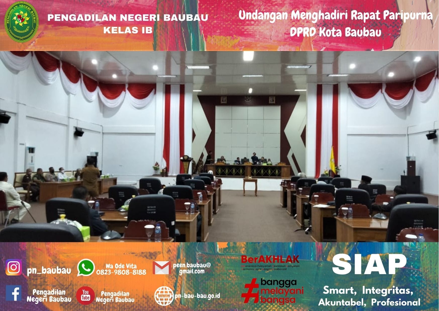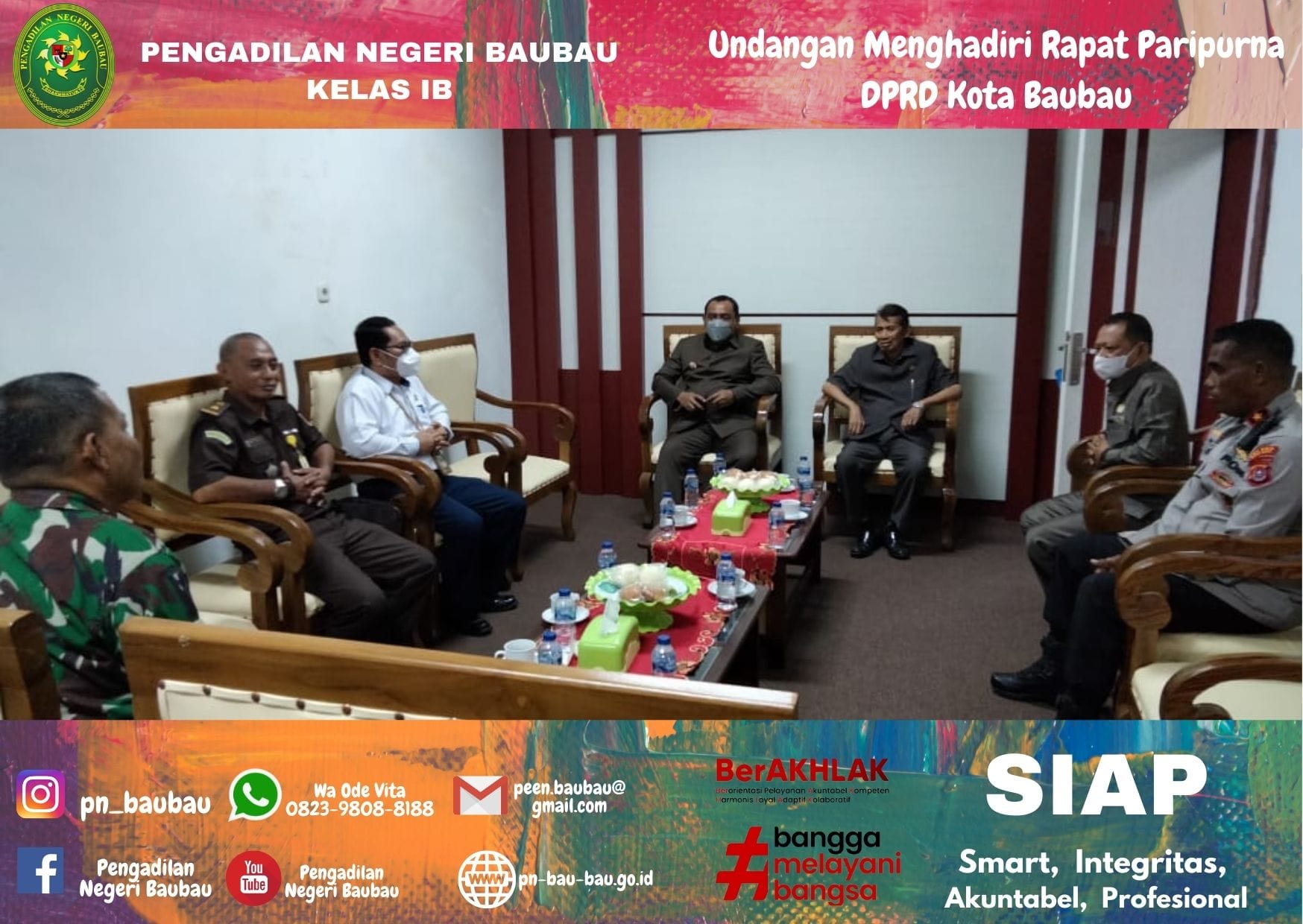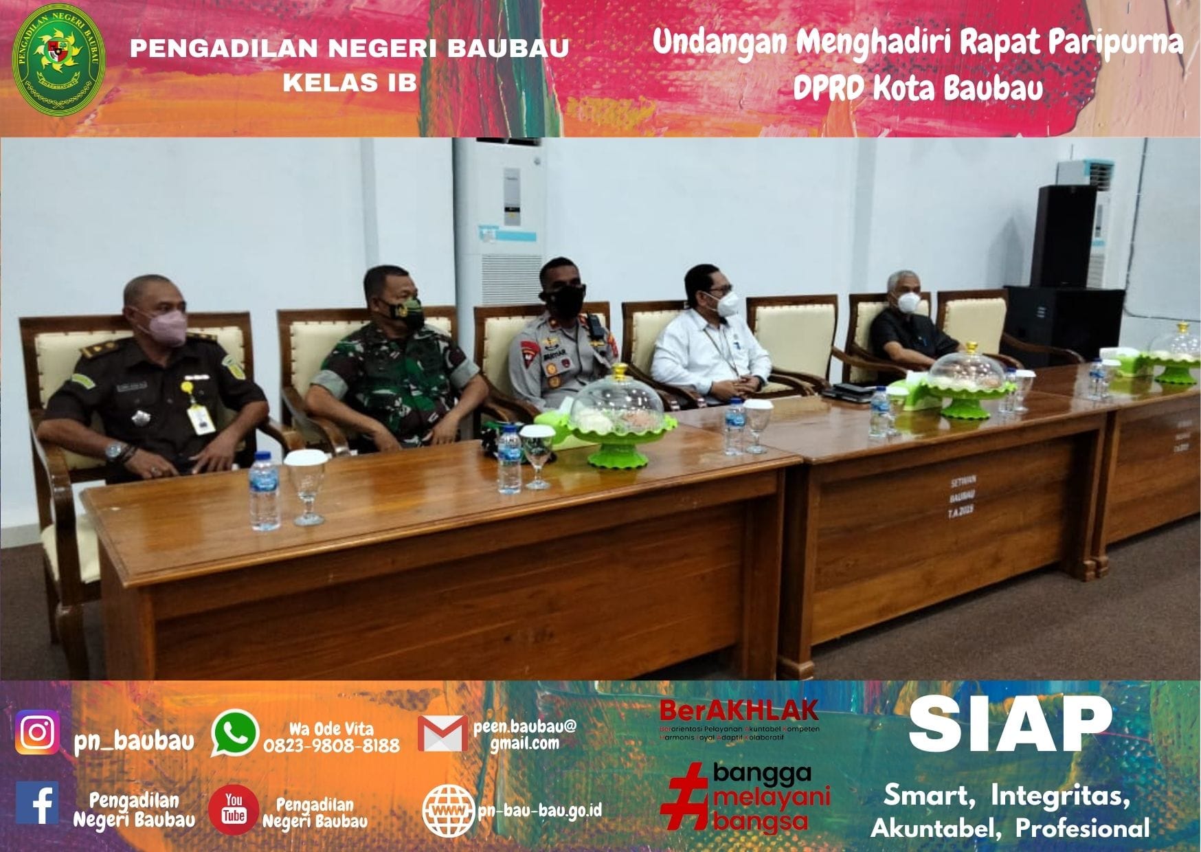 Pada Pukul 10.00 Wita. Wakil Ketua Pengadilan Negeri Baubau Bapak Johanis Dairo Malo, S.H., M.H menghadiri Undangan Rapat Paripurna Anggota DPRD Kota Baubau dengan Agenda Penutupan Masa Sidang II (Februari sd Mei) dan Pembukaan Masa Sidang III (Juli sd September) Tahun Sidang 2021-2022 dan Persetujuan Bersama antara Pemerintah dan DPRD Kota Baubau terhadap Raperda tentang Retribusi Persetujuan Bangunan Gedung. Rapat diselenggarakan di Ruang Rapat DPRD Kota Baubau.