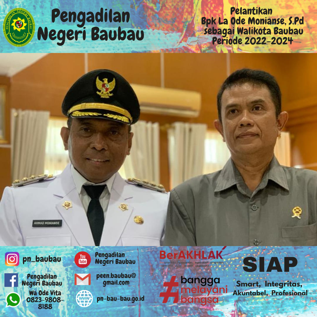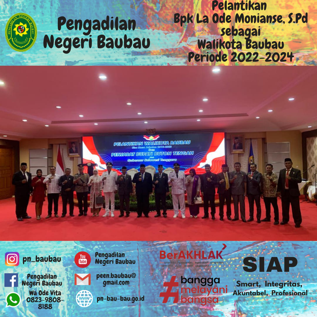 Ketua Pengadilan Negeri Baubau, Bapak Dr. Nur Kholis, S.H., M.H menghadiri Acara pelantikan Bapak La Ode Ahmad Monianse, S.Pd sebagai Walikota Baubau periode 2022-2024 oleh Gubernur Sulawesi Tenggara Bapak H. Ali Mazi, S.H. Kegiatan berlangsung di Rumah Jabatan (Rujab) Gubernur di Kota Kendari, Provinsi Sulawesi Tenggara.