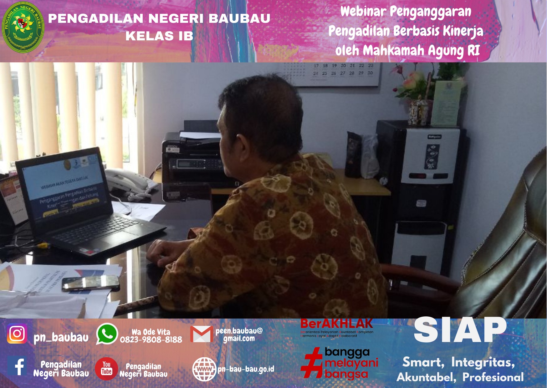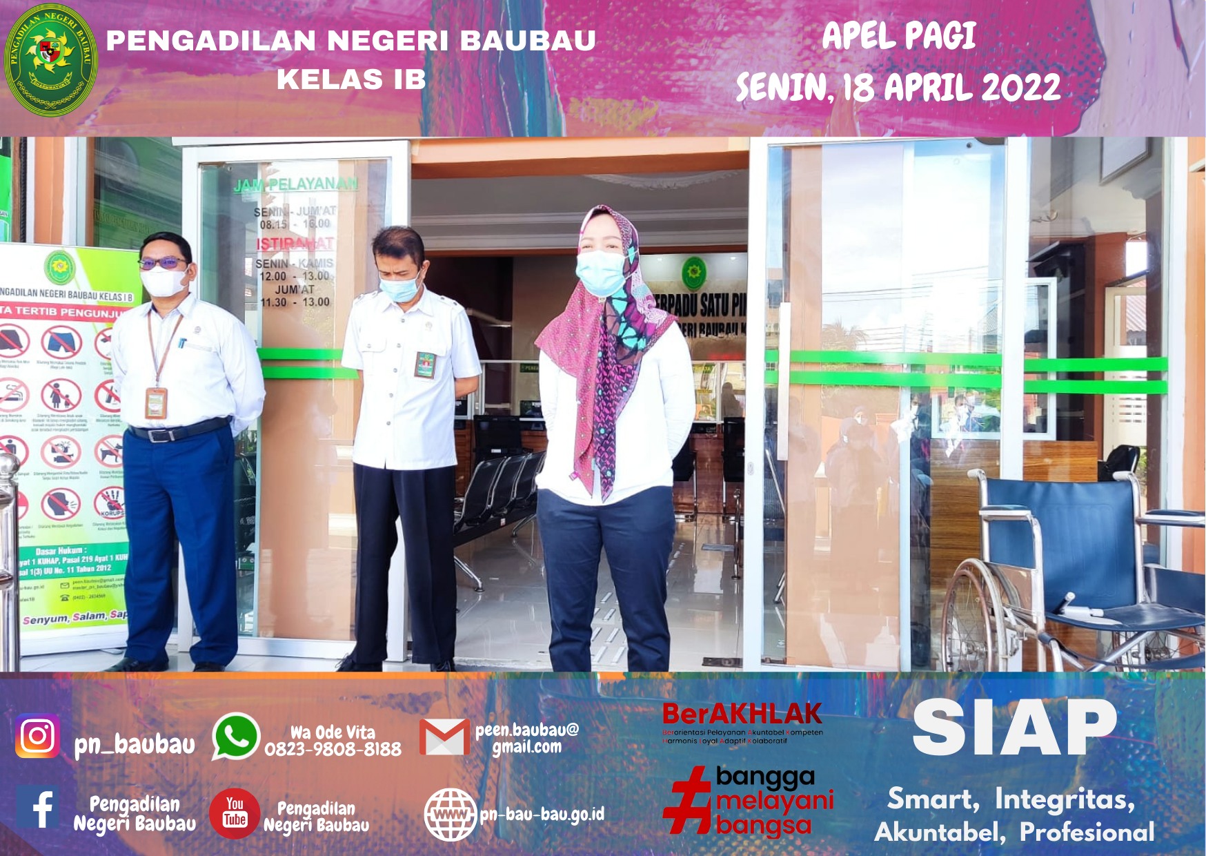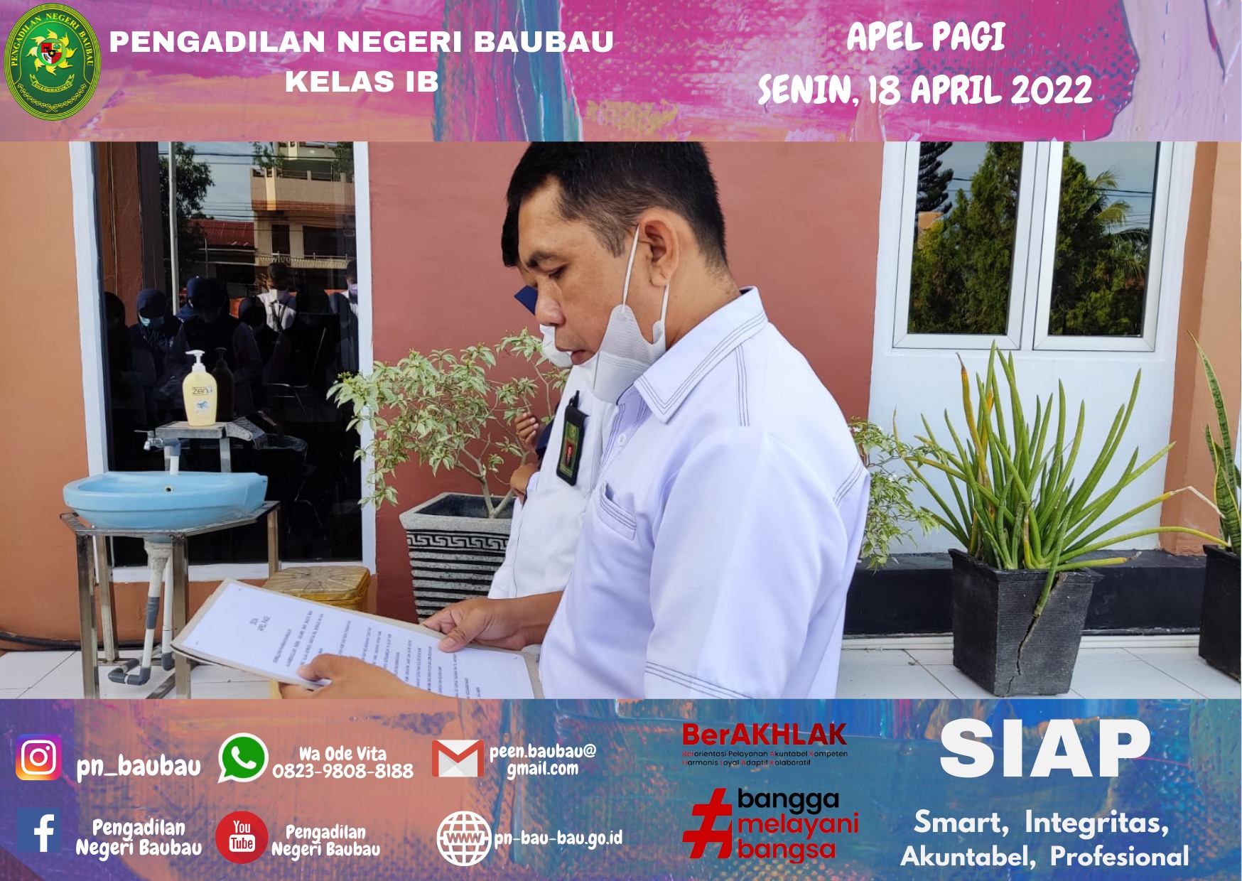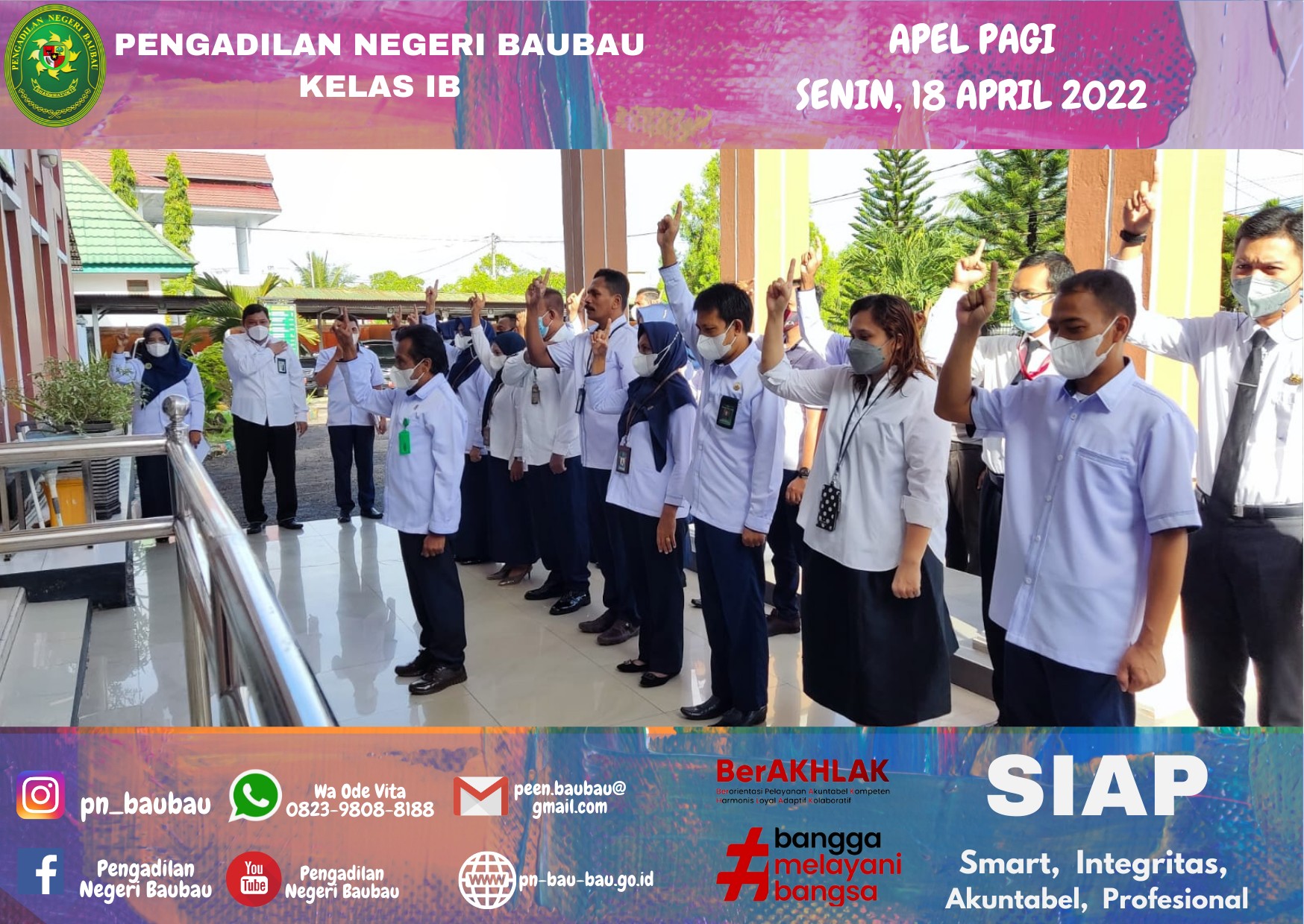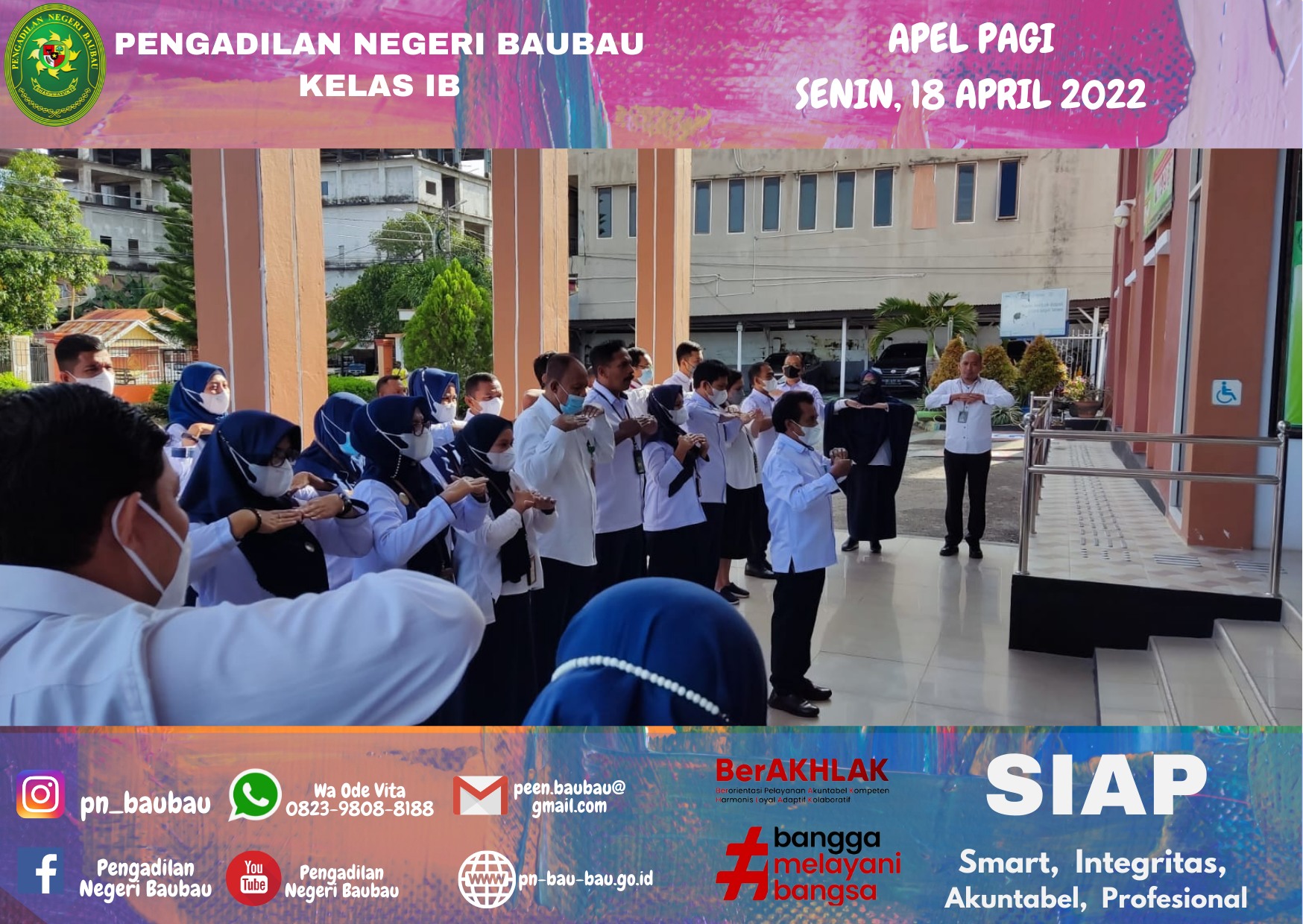 Pelaksana Apel Pagi, Bapak La Ode Muhammad Suryadi, S.H, sebagai Pemimpin Apel, Bapak Rachmat SHi Lahasan, S.H., M.H sebagai Pembaca 8(Delapan) Nilai Utama Mahkamah Agung RI, Yel-yel Mahkamah Agung serta Yel-yel Pengadilan Negeri Baubau.