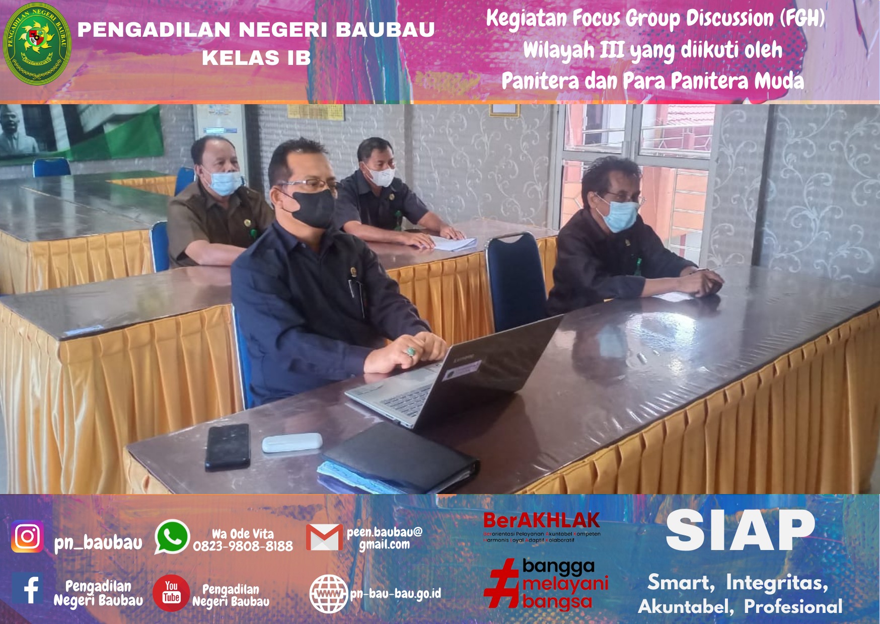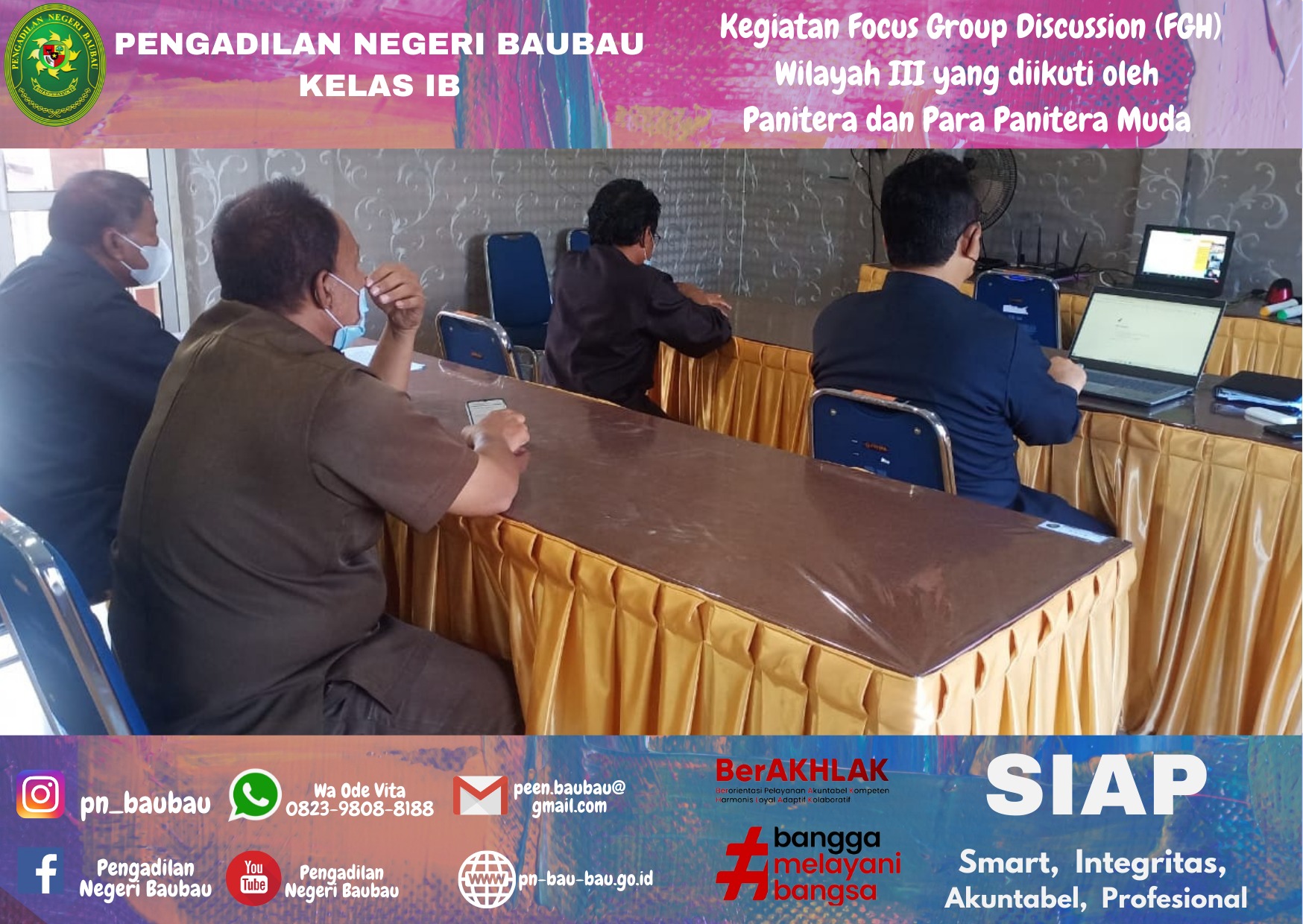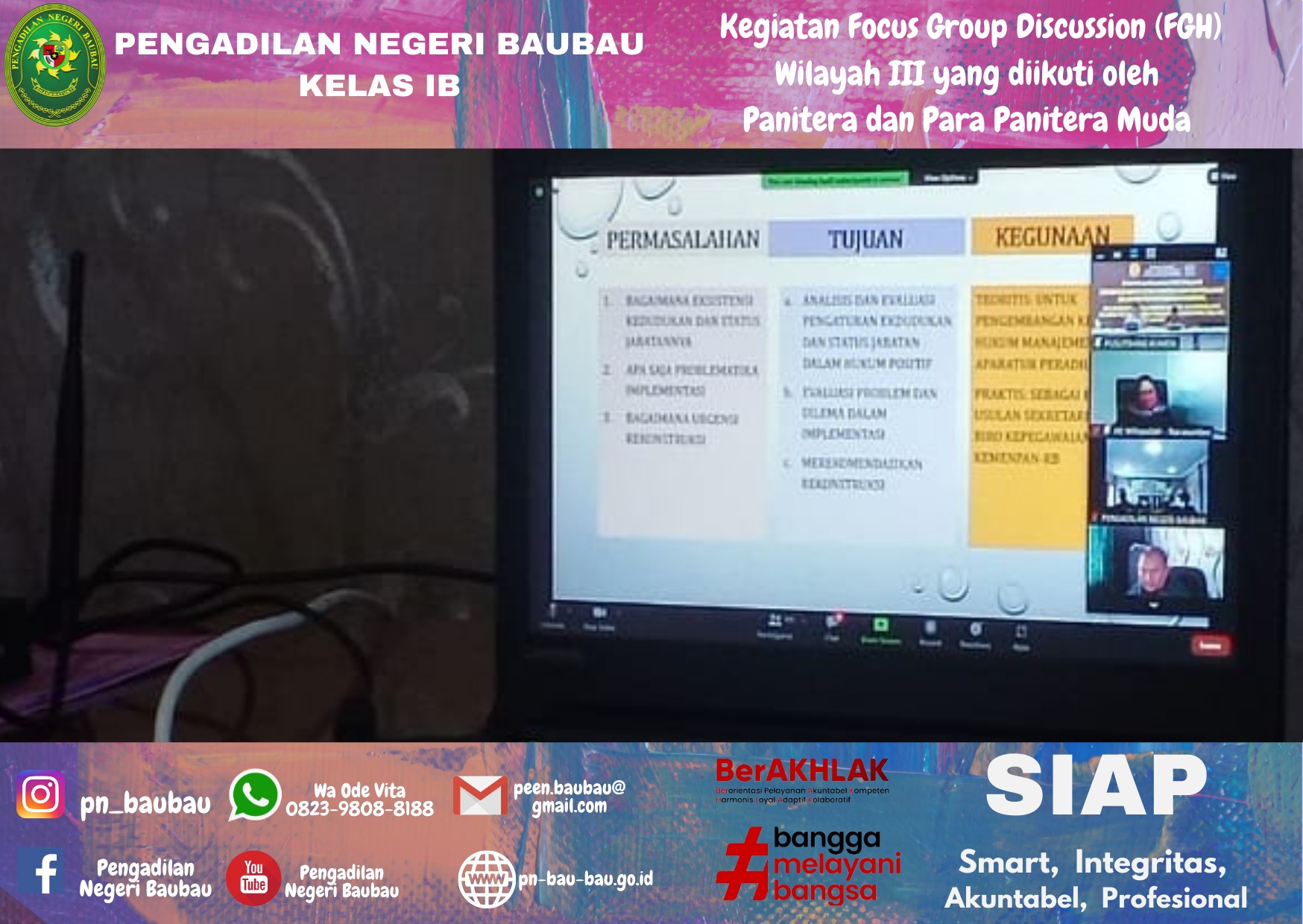 Bertempat di Ruang Rapat Pengadilan Negeri Baubau, Panitera, Panitera Muda Perdata, Panitera Muda Pidana, Panitera Muda Hukum mengikuti Kegiatan Fokus Group Discussion (FGD) dengan Tema "KEDUDUKAN DAN STATUS JABATAN PANITERA DAN PANMUD DALAM SISTEM KEPEGAWAIAN NASIONAL" PERADILAN UMUM". Kegiatan ini diselenggakan oleh Pusat Pendidikan dan Pelatihan Mahkamah Agung RI secara Zoom Meeting.