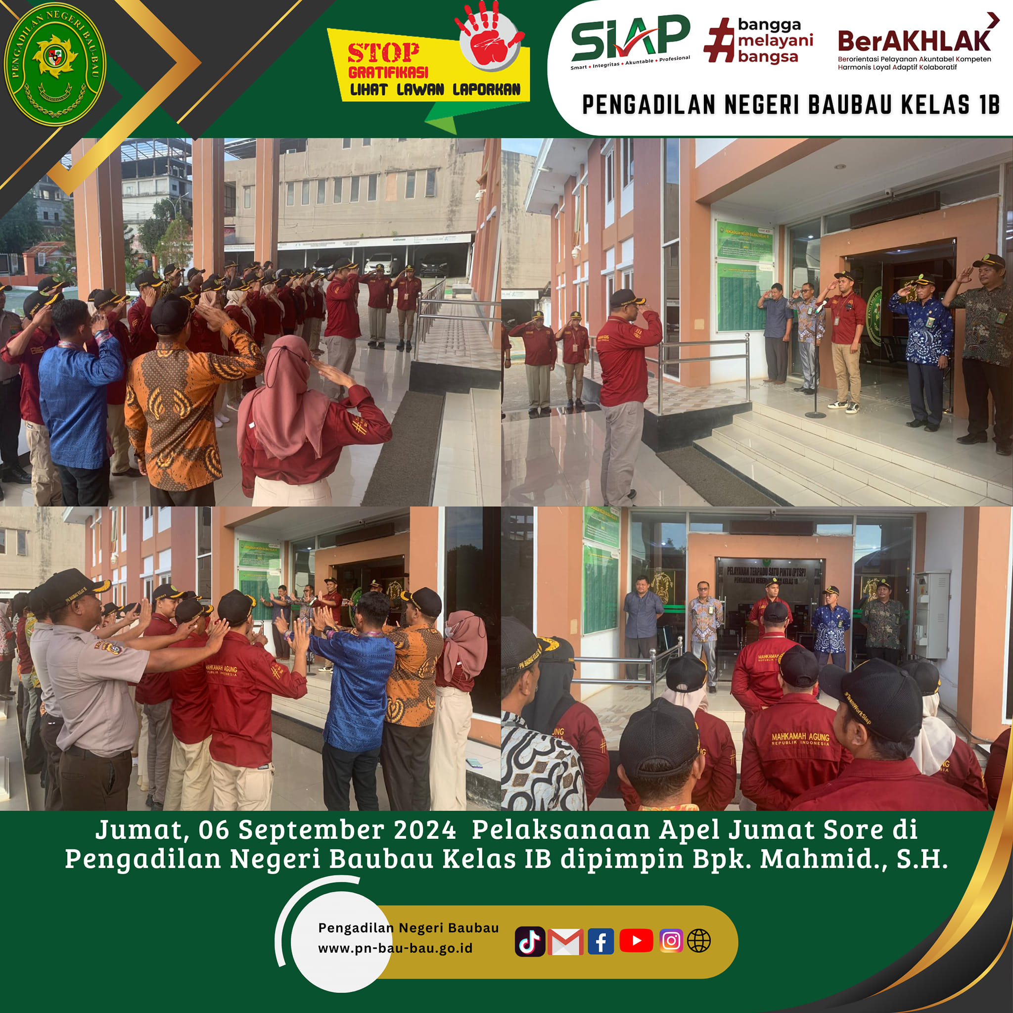 Pelaksanaan Apel Jumat Sore yang dipimpin langsung oleh Bapak Mahmid, S.H., Selaku Hakim pada Pengadilan Negeri Baubau Kelas IB.