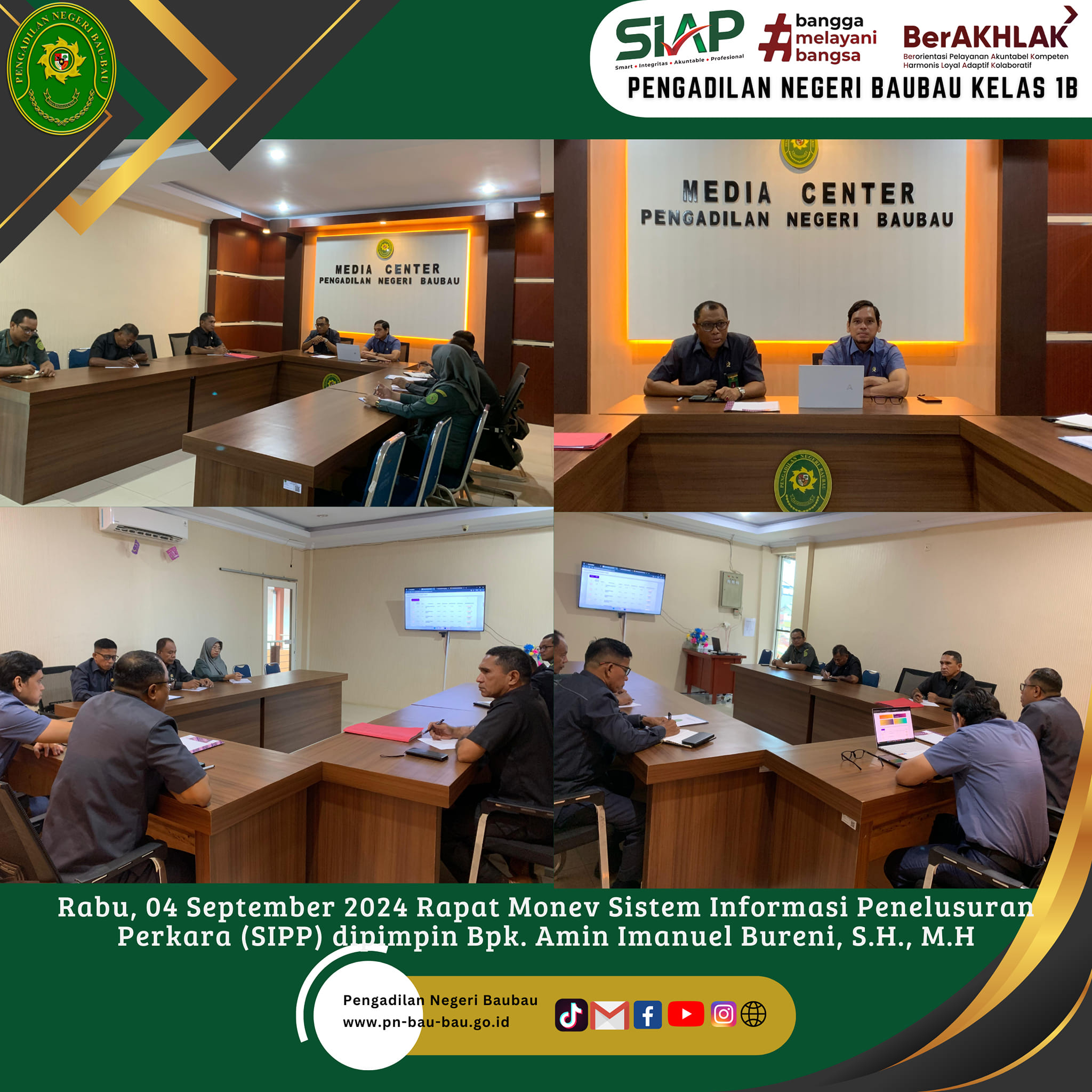 Bertempat di Ruang Media Center, Ketua Pengadilan Negeri Baubau Bpk Amin Imanuel Bureni., S.H., M.H memimpin langsung Rapat Monitoring dan Evaluasi SIPP periode Bulan September didampingi oleh Wakil Ketua Pengadilan Negeri Baubau Bpk. Muhammad Syawaludin,S.H pada pukul 08.00 Wita sampai selesai. Rapat dihadiri oleh seluruh Tim Monev Pelaksana Monev Keakuratan dan Kualitas Data SIPP Pengadilan Negeri Baubau.
