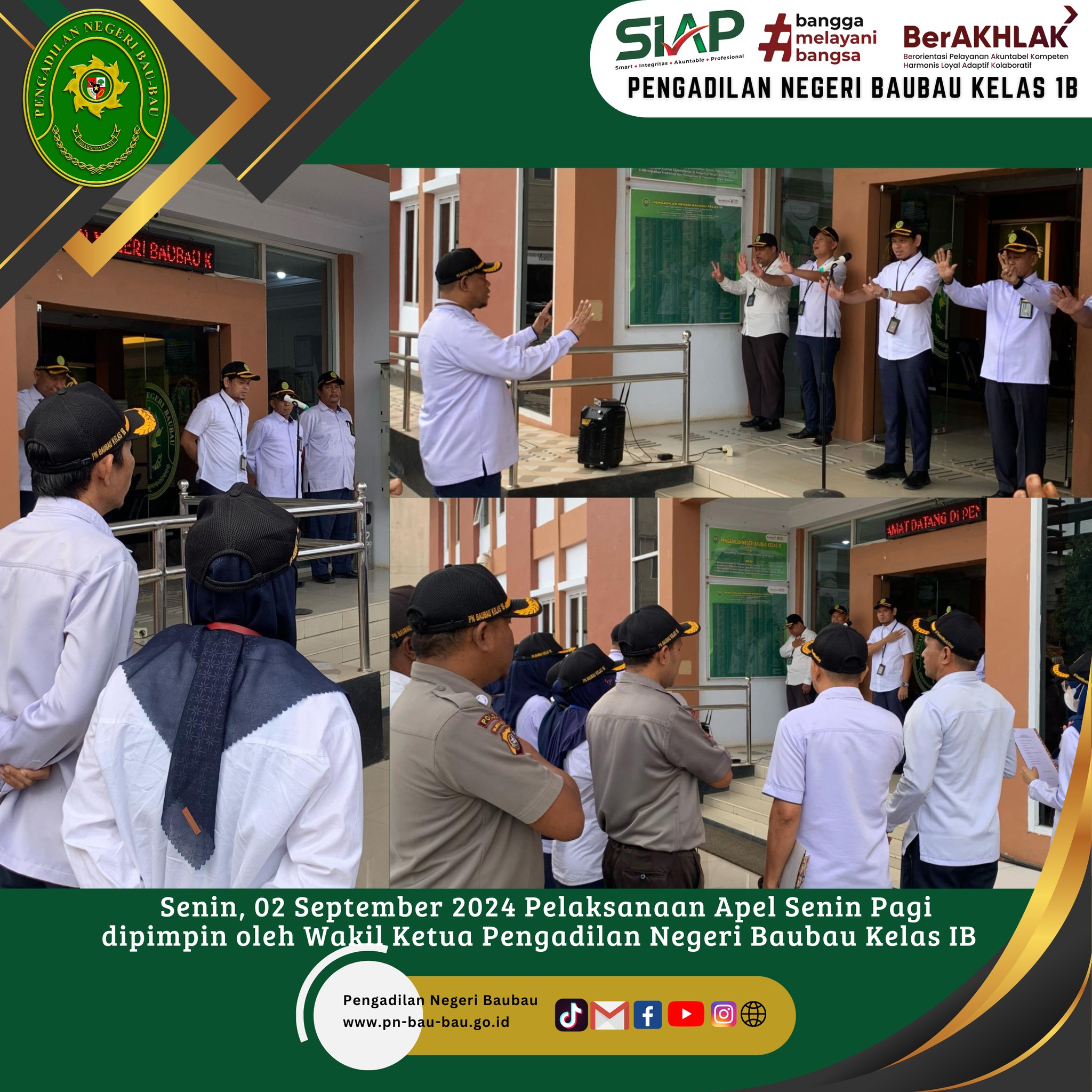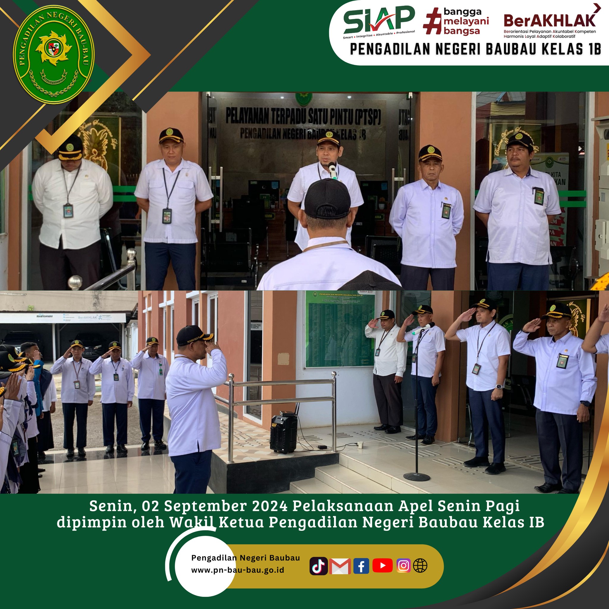 Senin, 02 September 2024 Pelaksanaan Apel Senin Pagi yang dipimpin langsung oleh YM. Bapak Muhammad Syawaludin, S.H., Selaku Wakil Ketua Pengadilan Negeri Baubau Kelas IB.