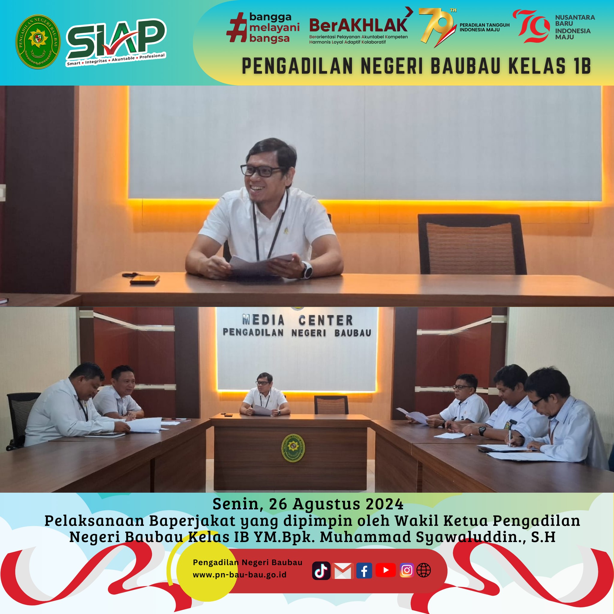 Bertempat di Media Center, Tim Baperjakat Pengadilan Negeri Baubau Kelas IB mengadakan rapat terbatas. Rapat baperjakat dipimpin langsung oleh Ketua Baperjakat YM.Bpk. Muhammad Syawaludin., S.H Wakil Ketua Pengadilan Negeri Baubau