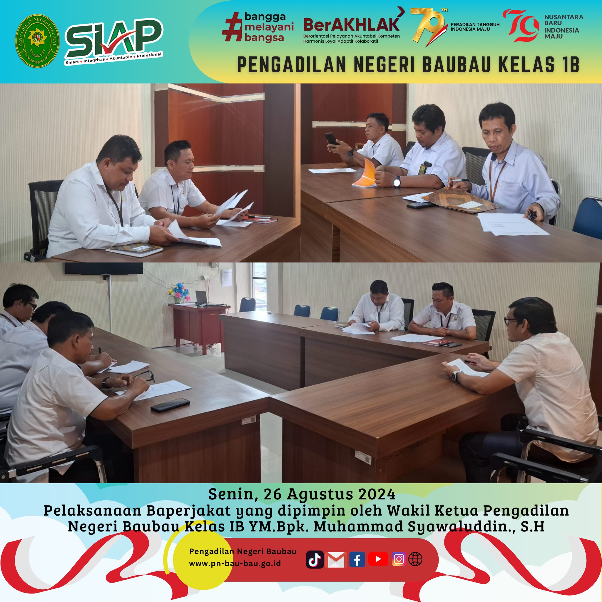 Bertempat di Media Center, Tim Baperjakat Pengadilan Negeri Baubau Kelas IB mengadakan rapat terbatas. Rapat baperjakat dipimpin langsung oleh Ketua Baperjakat YM.Bpk. Muhammad Syawaludin., S.H Wakil Ketua Pengadilan Negeri Baubau . Rapat dibuka secara khidmat dan bersifat rahasia. Rapat dihadiri dari hakim, sekretaris, panitera, dan Kasub. Kepegawaian Organisasi & Tata Laksana. Kegiatan Baperjakat dilaksanakan pada Pukul 14.00 Wita sampai selesai.