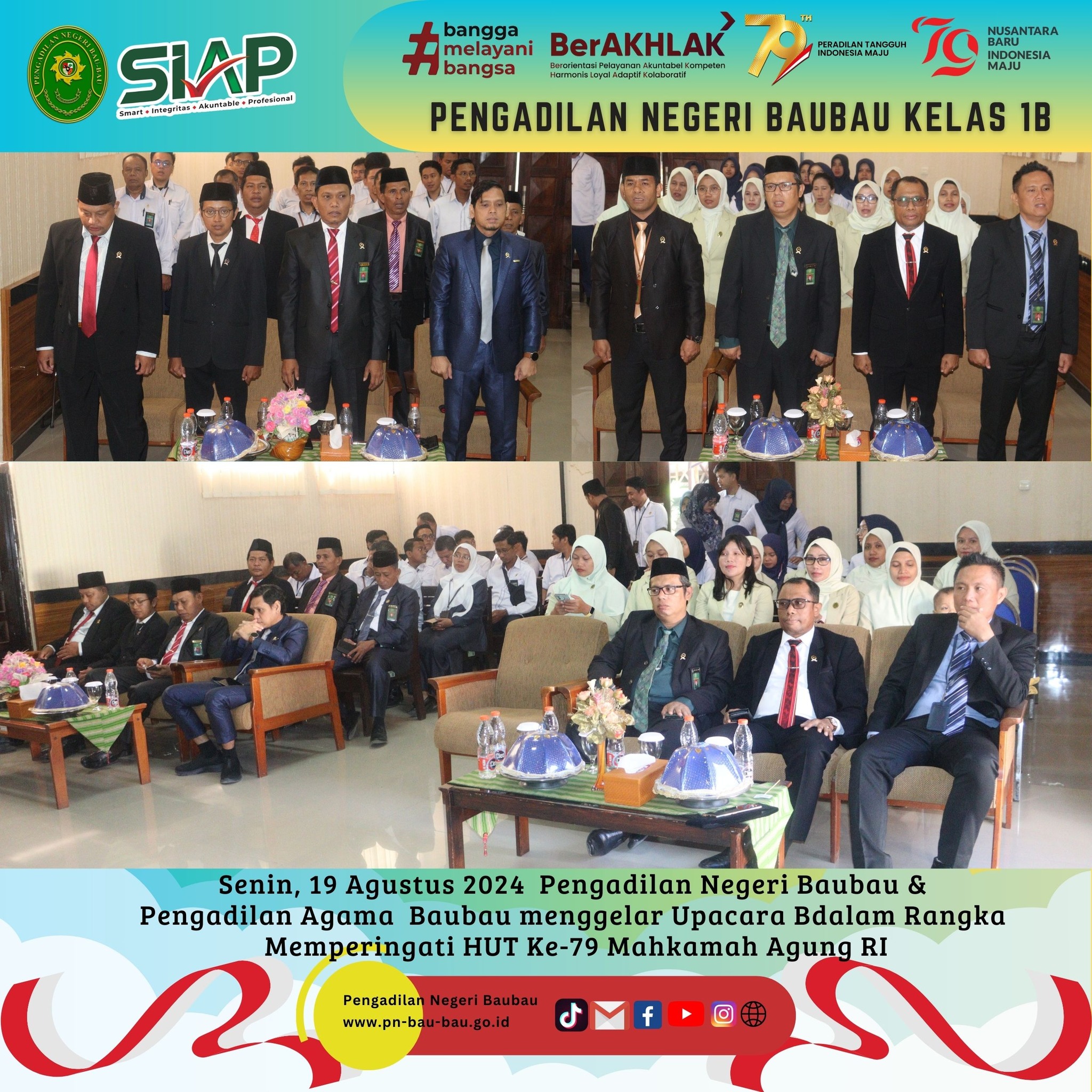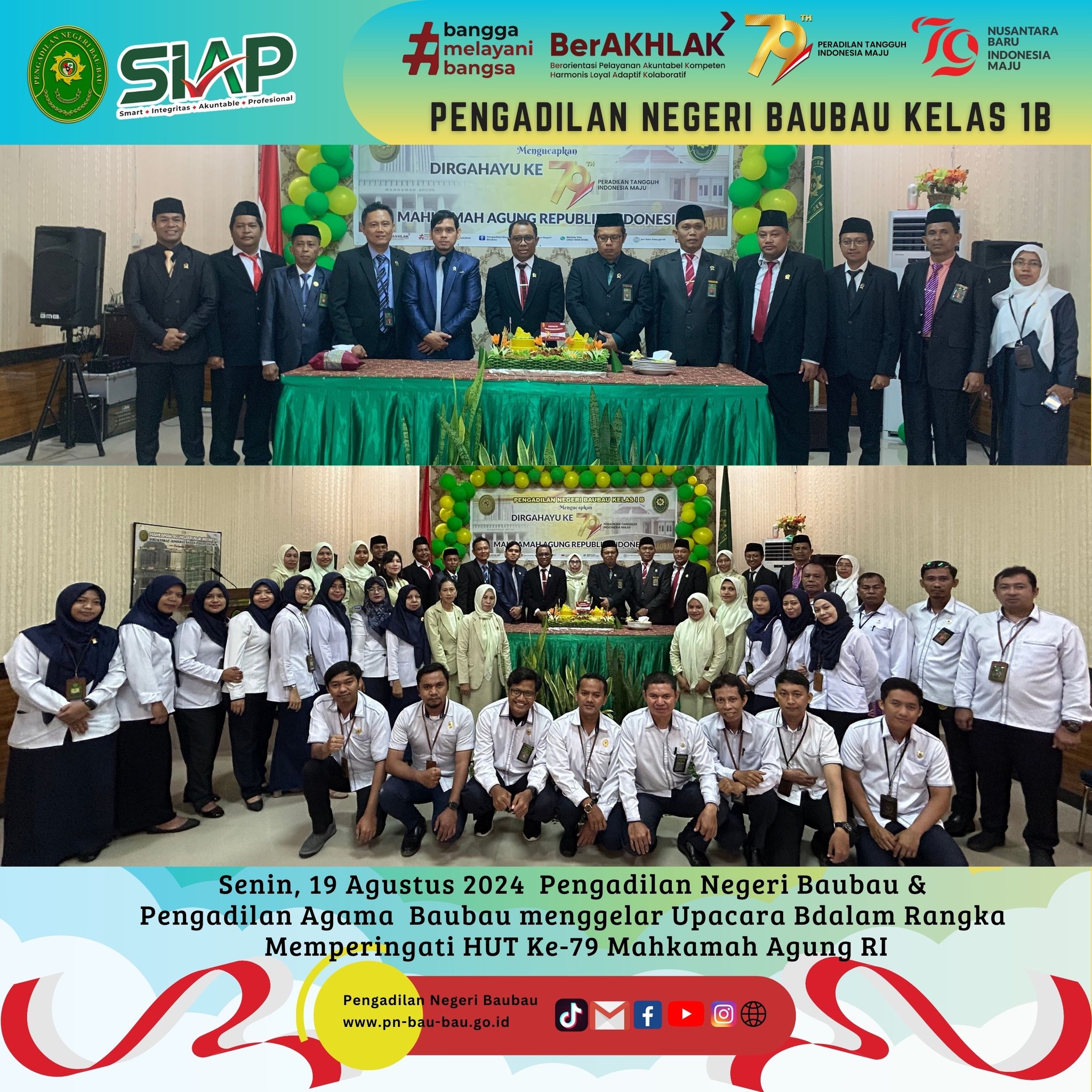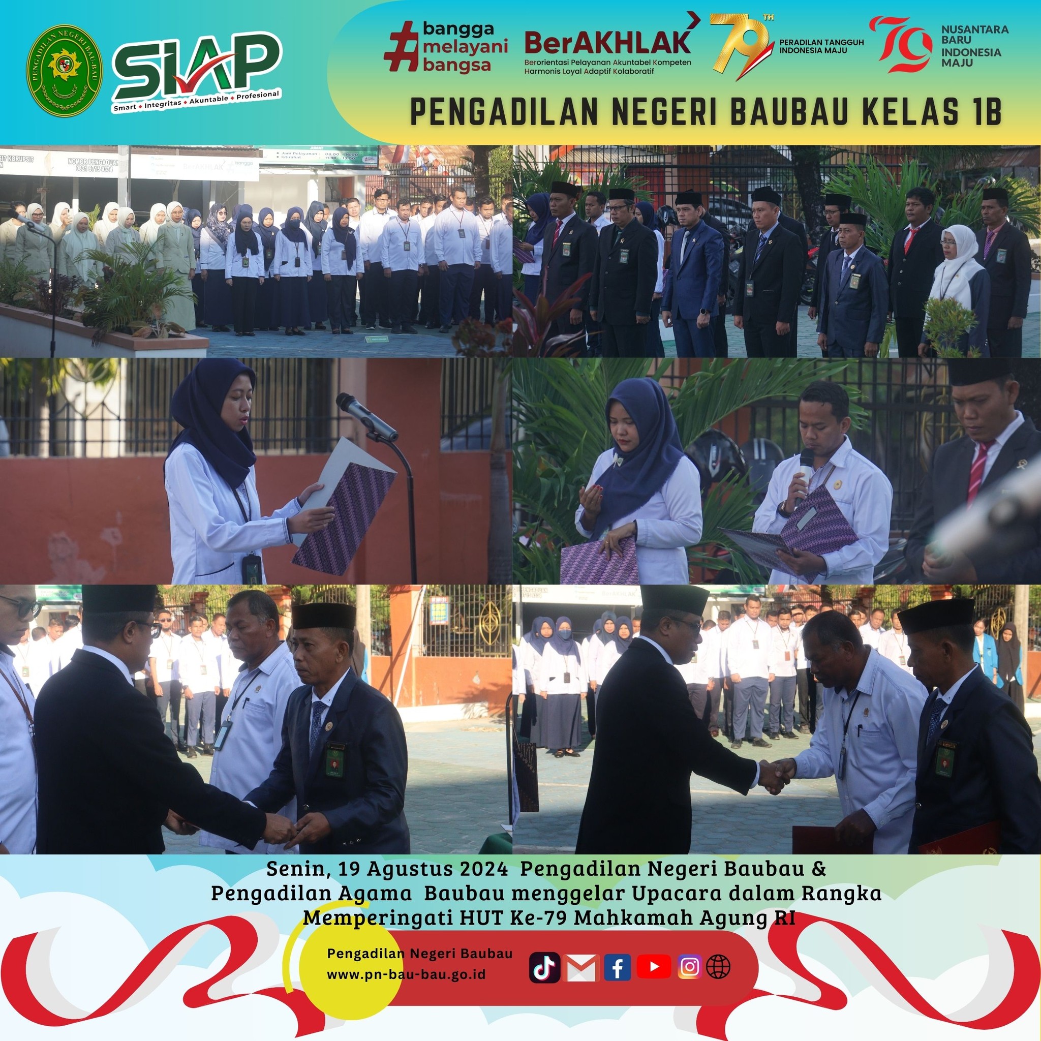 Pada pukul 08.00 Wita sampai selesai, Pengadilan Negeri dan Pengadilan Agama Baubau menggelar Upacara Bersama dalam Rangka memperingati Hari Ulang Tahun Mahkamah Agung RI Ke -79 Tahun 2024 sesuai Surat Sekretaris Mahkamah Agung RI Nomor 3552/SEK/HM3.1.1/VIII/2024 tanggal 14 Agustus 2024.