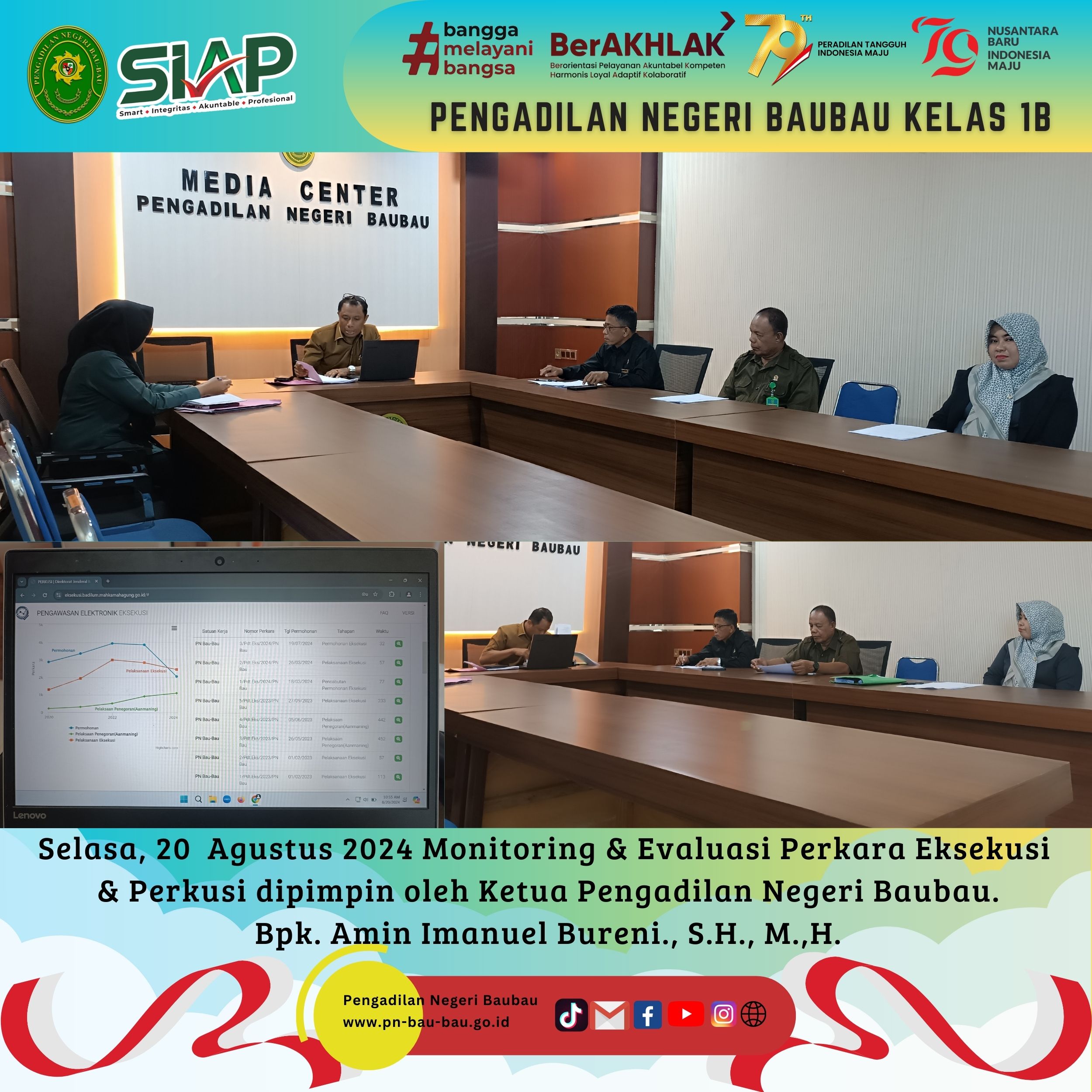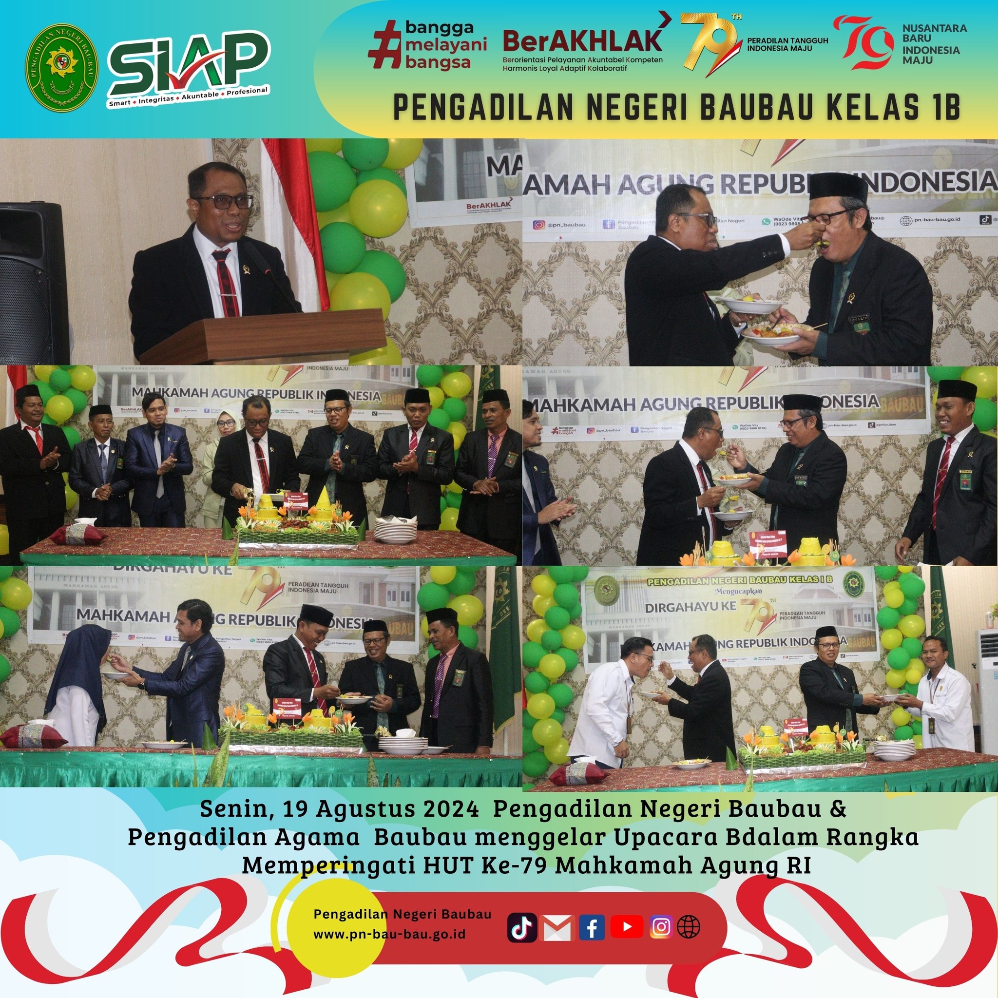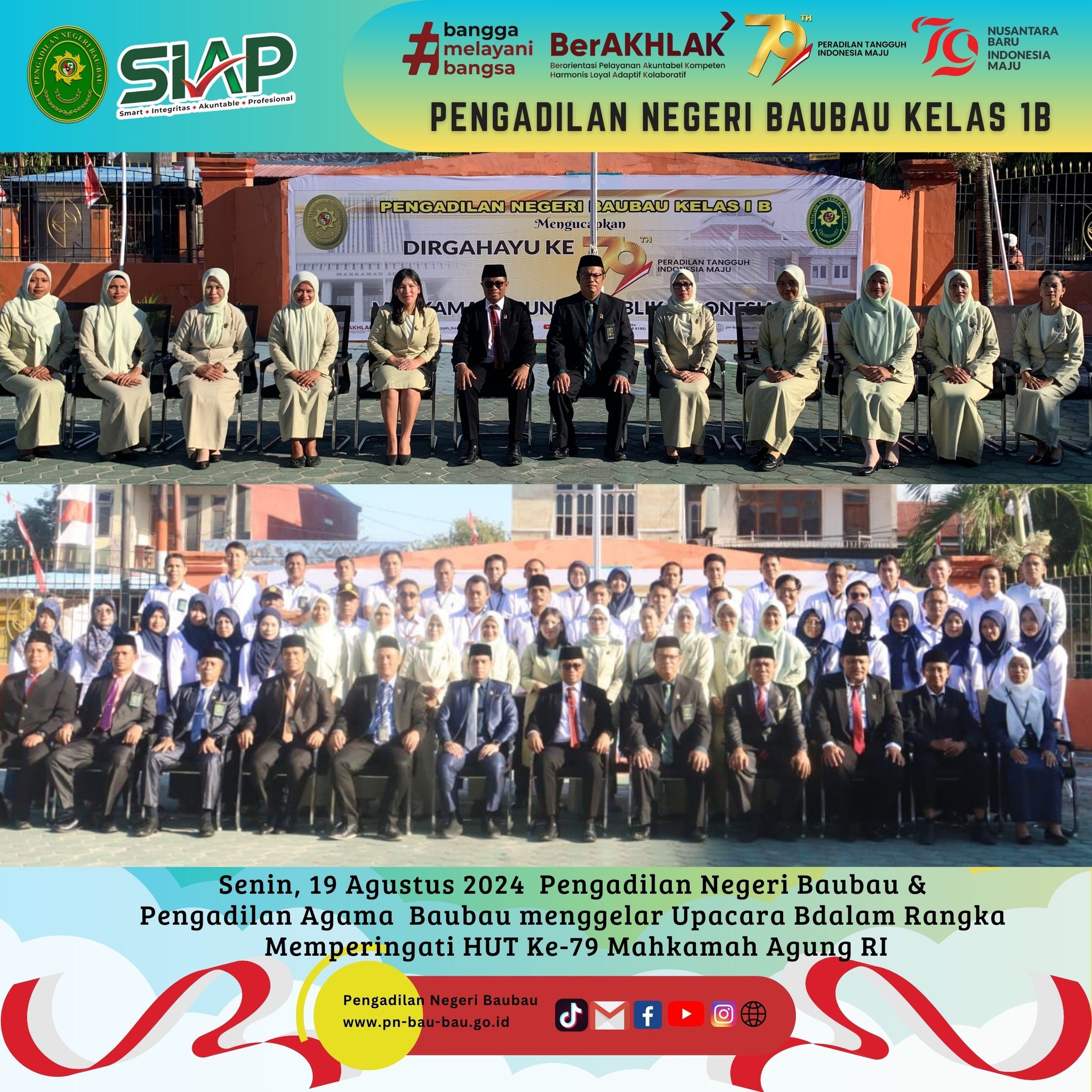 Pada pukul 08.00 Wita sampai selesai, Pengadilan Negeri dan Pengadilan Agama Baubau menggelar Upacara Bersama dalam Rangka memperingati Hari Ulang Tahun Mahkamah Agung RI Ke -79 Tahun 2024 sesuai Surat Sekretaris Mahkamah Agung RI Nomor 3552/SEK/HM3.1.1/VIII/2024 tanggal 14 Agustus 2024.