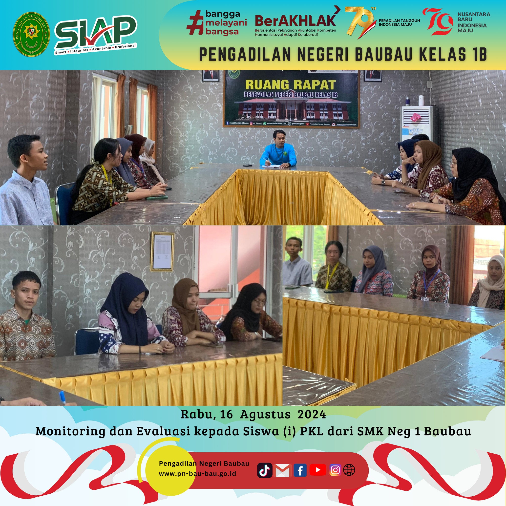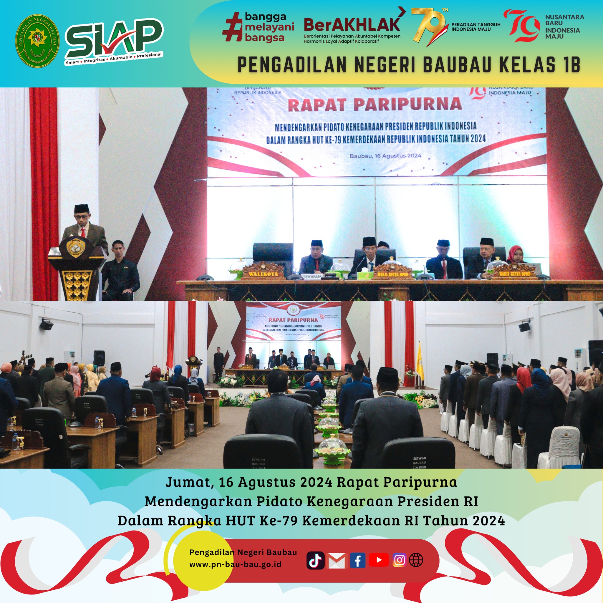 Pada Pukul 09.00 Wita sampai selesai, Ketua Pengadilan Negeri Baubau Kelas IB YM.Bpk. Amin Imanuel Bureni., S.H., M.H menghadiri Undangan Rapat Paripurna mendengarkan Pidato Kenegaraan Republik Indonesia dalam Rangka HUT Ke-97 Kemerdekaan Republik Indonesia Tahun 2024 bertempat di Aula Kantor DPRD Kota Baubau