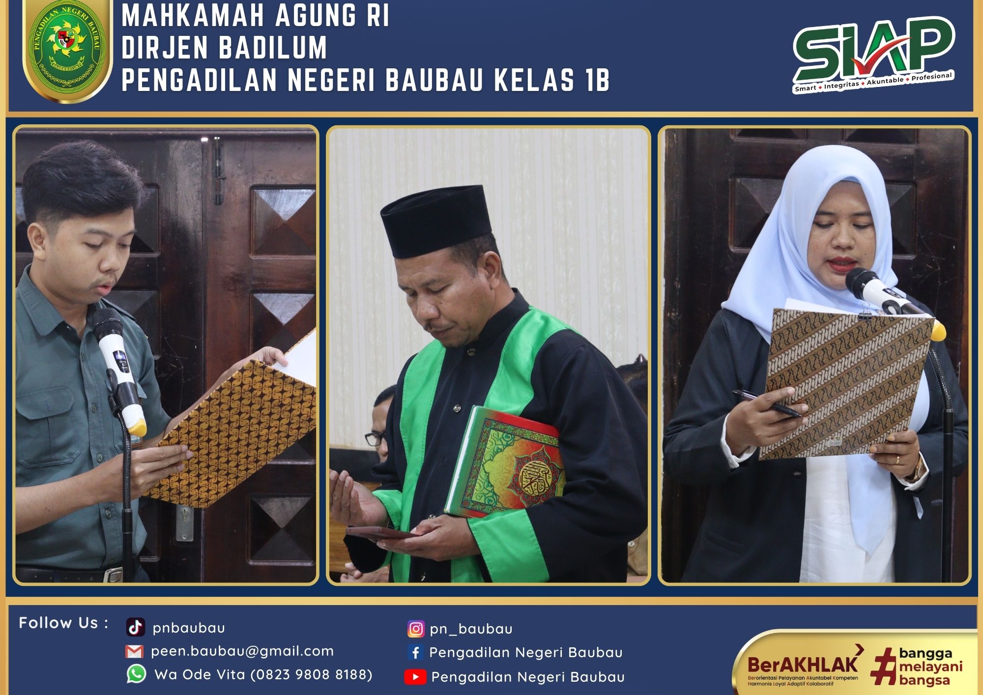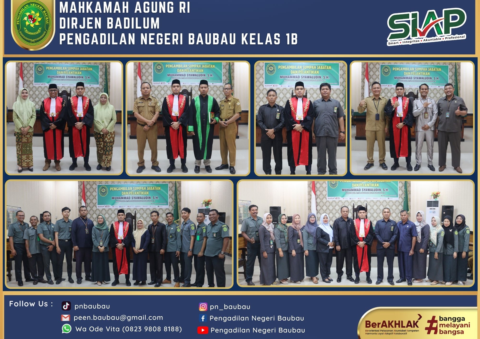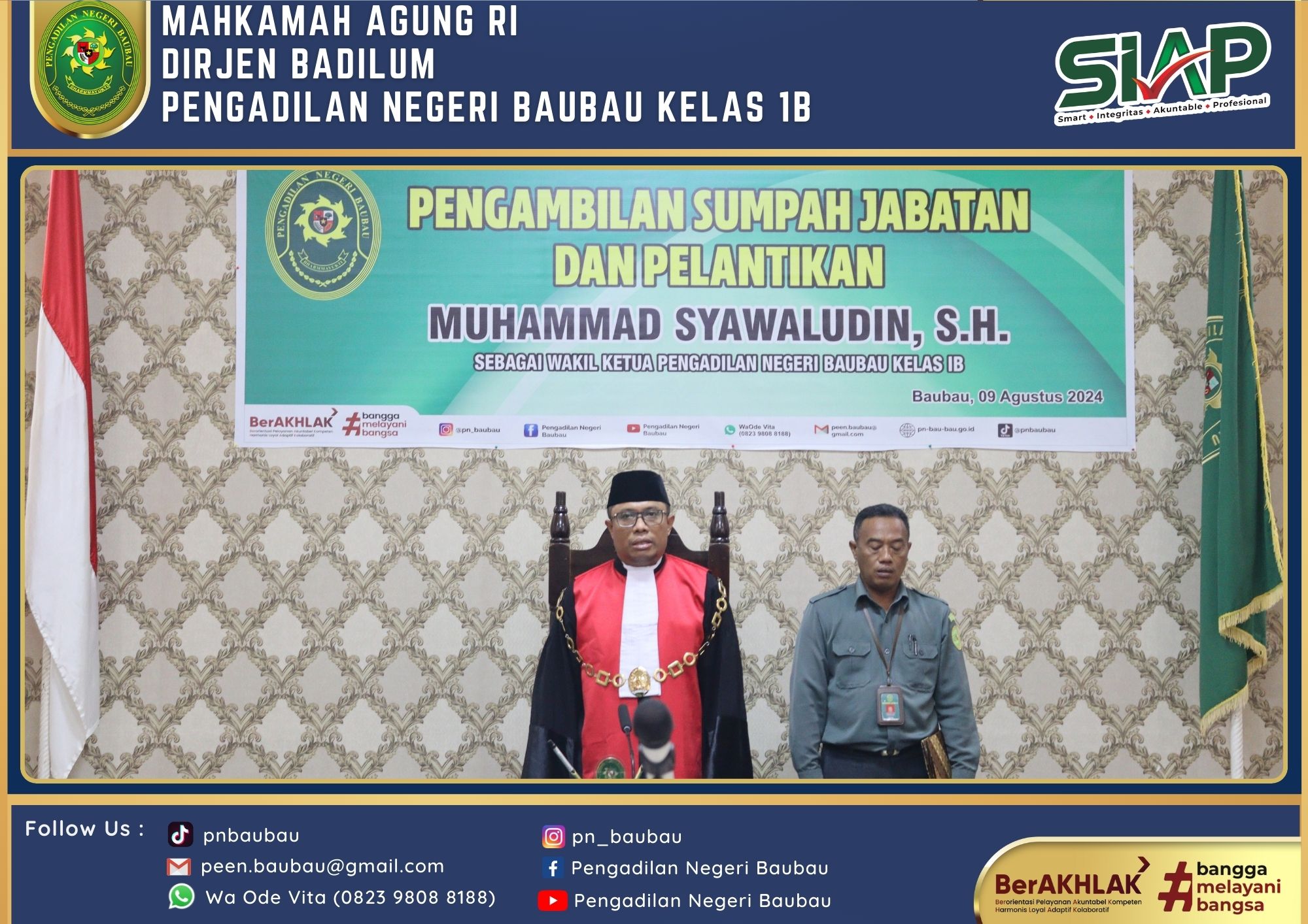 Pada Hari ini Jumat, Tanggal 9 Agustus 2024, Pukul 09.00 Wita sampai selesai telah dilaksanakan Pengambilan Sumpah Jabatan dan Pelantikan YM. Bapak Muhammad Syawaludin., S.H . sebagai Wakil Ketua Pengadilan Negeri Baubau Kelas IB (sebelumnya menjabat sebagai Ketua Pengadilan Negeri Biak Kelas II) oleh Ketua Pengadilan Negeri Baubau Kelas IB YM. Bapak Amin Imanuel Bureni., S.H.,M.H. Acara diawali dengan pembacaan surat keputusan Ketua Mahkamah Agung Republik Indonesia, kemudian dilanjutkan dengan pengambilan sumpah Jabatan Wakil Ketua Pengadilan Negeri Baubau Kelas IB oleh Ketua Pengadilan Negeri Baubau Kelas IB. Selanjutnya penandatanganan berita acara pengambilan sumpah jabatan dan pakta integritas serta Kata Pelantikan oleh Ketua Pengadilan Negeri Baubau kepada Pejabat yang telah dilantik.