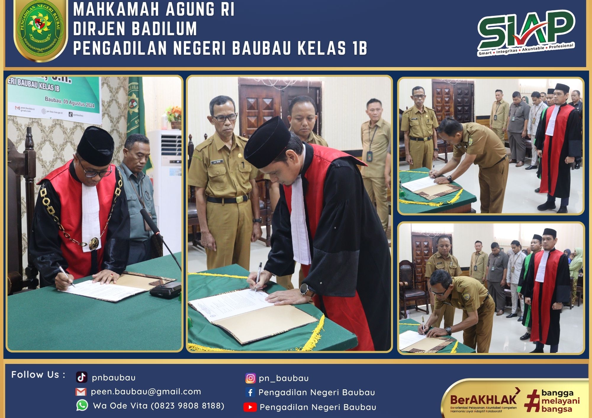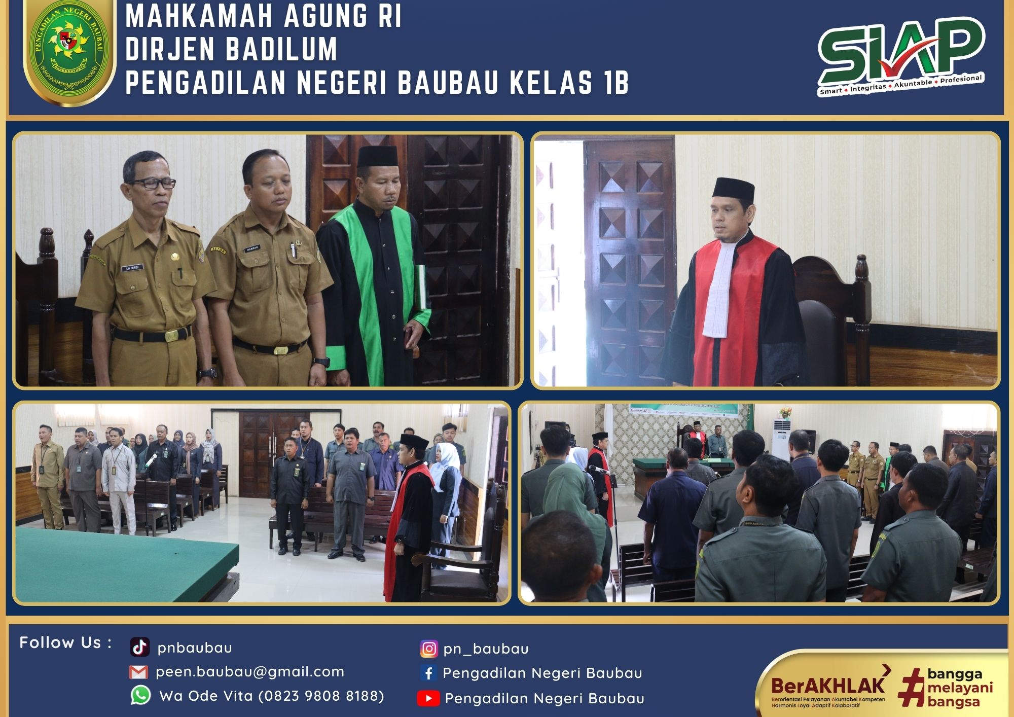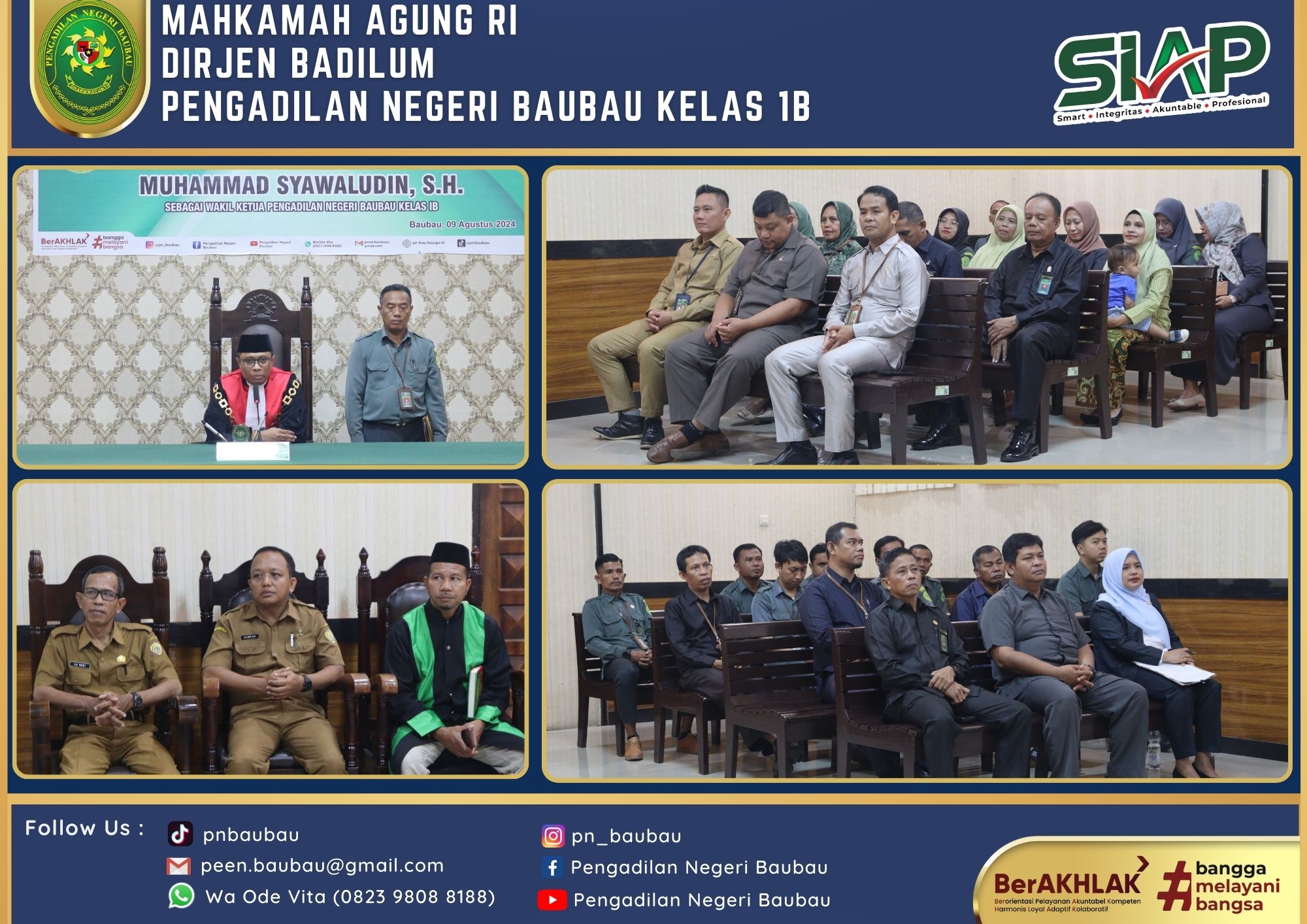 Pada Hari ini Jumat, Tanggal 9 Agustus 2024, Pukul 09.00 Wita sampai selesai telah dilaksanakan Pengambilan Sumpah Jabatan dan Pelantikan YM. Bapak Muhammad Syawaludin., S.H . sebagai Wakil Ketua Pengadilan Negeri Baubau Kelas IB (sebelumnya menjabat sebagai Ketua Pengadilan Negeri Biak Kelas II) oleh Ketua Pengadilan Negeri Baubau Kelas IB YM. Bapak Amin Imanuel Bureni., S.H.,M.H. Acara diawali dengan pembacaan surat keputusan Ketua Mahkamah Agung Republik Indonesia, kemudian dilanjutkan dengan pengambilan sumpah Jabatan Wakil Ketua Pengadilan Negeri Baubau Kelas IB oleh Ketua Pengadilan Negeri Baubau Kelas IB. Selanjutnya penandatanganan berita acara pengambilan sumpah jabatan dan pakta integritas serta Kata Pelantikan oleh Ketua Pengadilan Negeri Baubau kepada Pejabat yang telah dilantik.