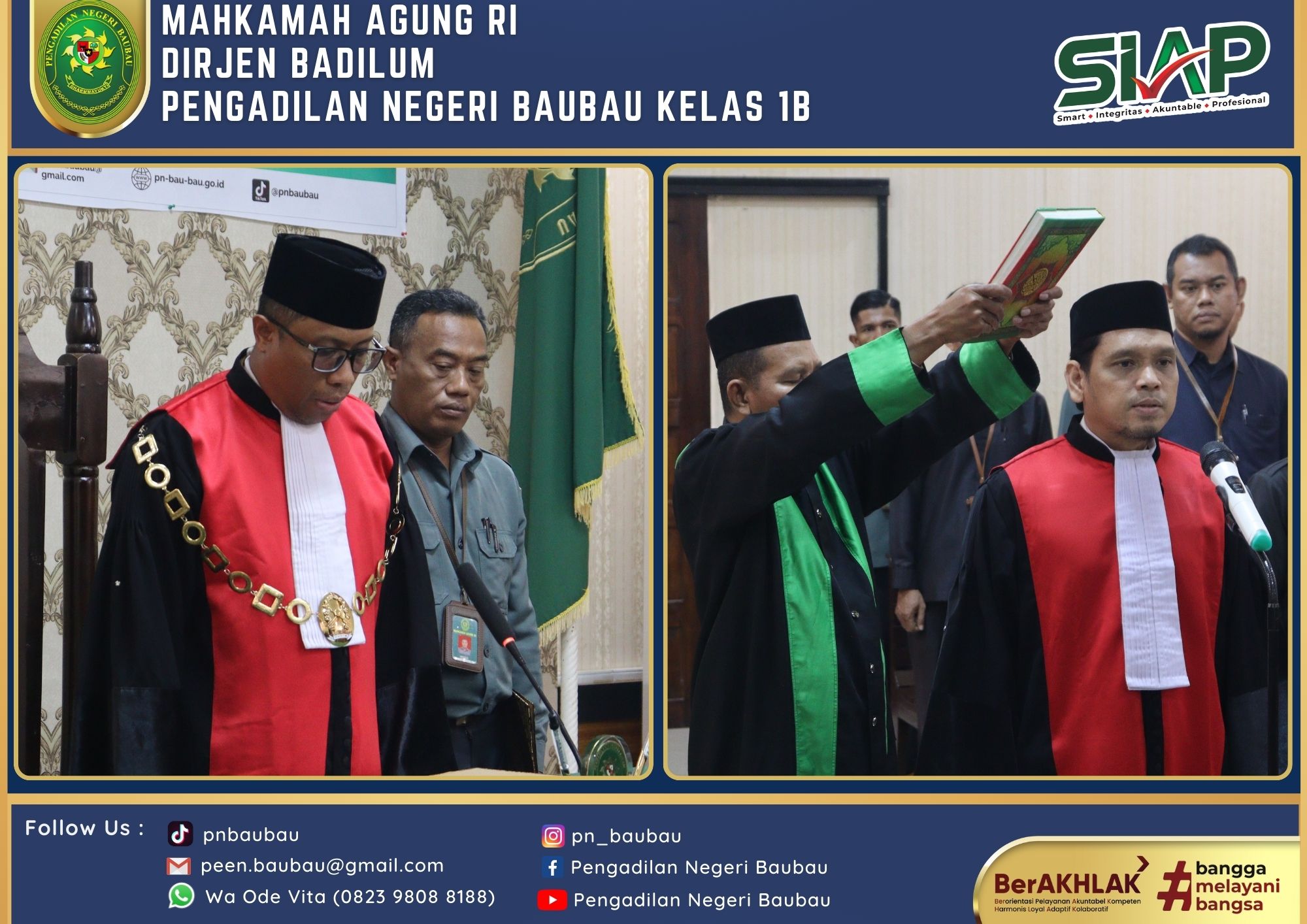 Pengambilan Sumpah Jabatan dan Pelantikan YM. Bapak Muhammad Syawaludin., S.H . sebagai Wakil Ketua Pengadilan Negeri Baubau Kelas IB oleh Ketua Pengadilan Negeri Baubau Kelas IB YM. Bapak Amin Imanuel Bureni., S.H.,M.H.