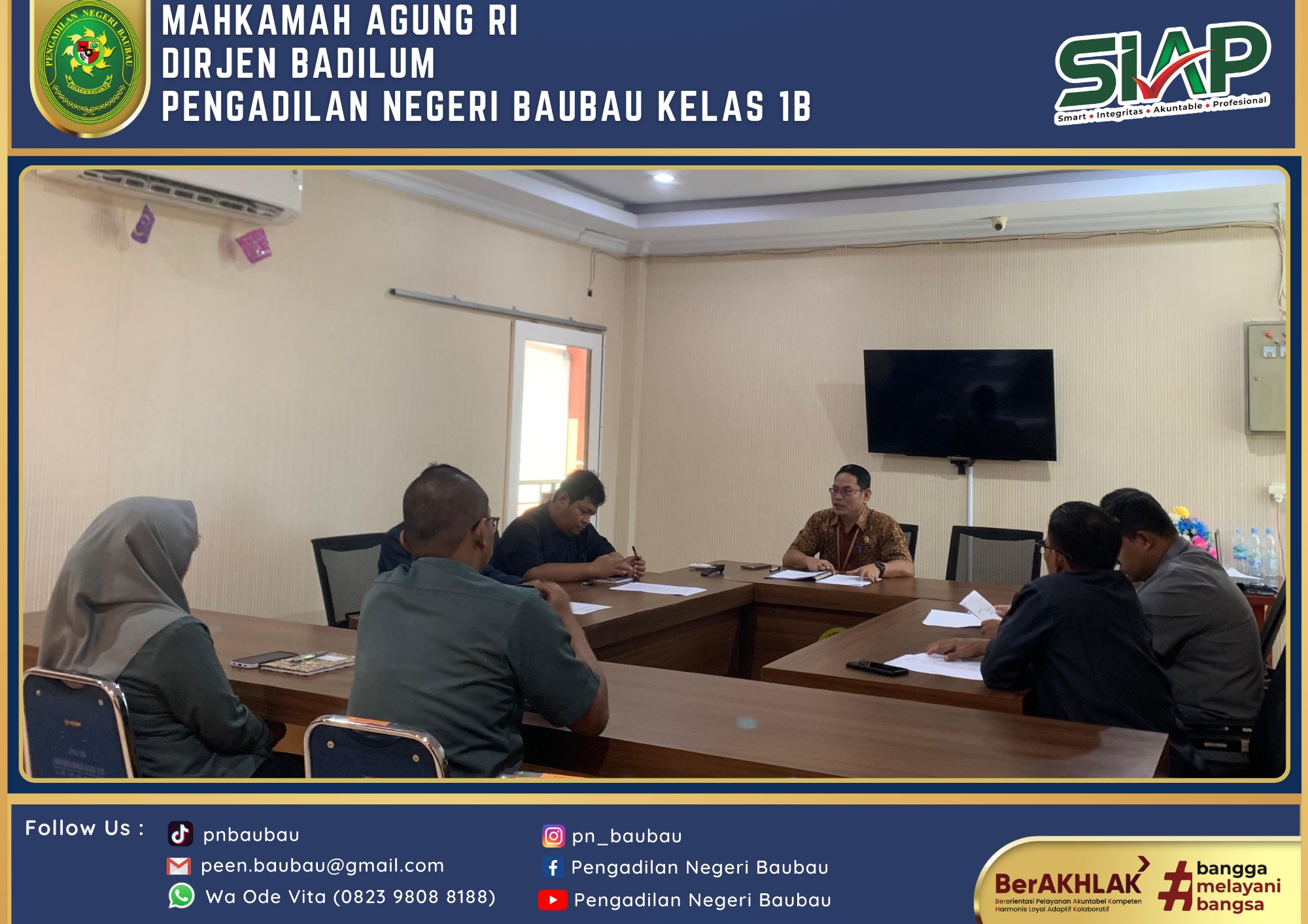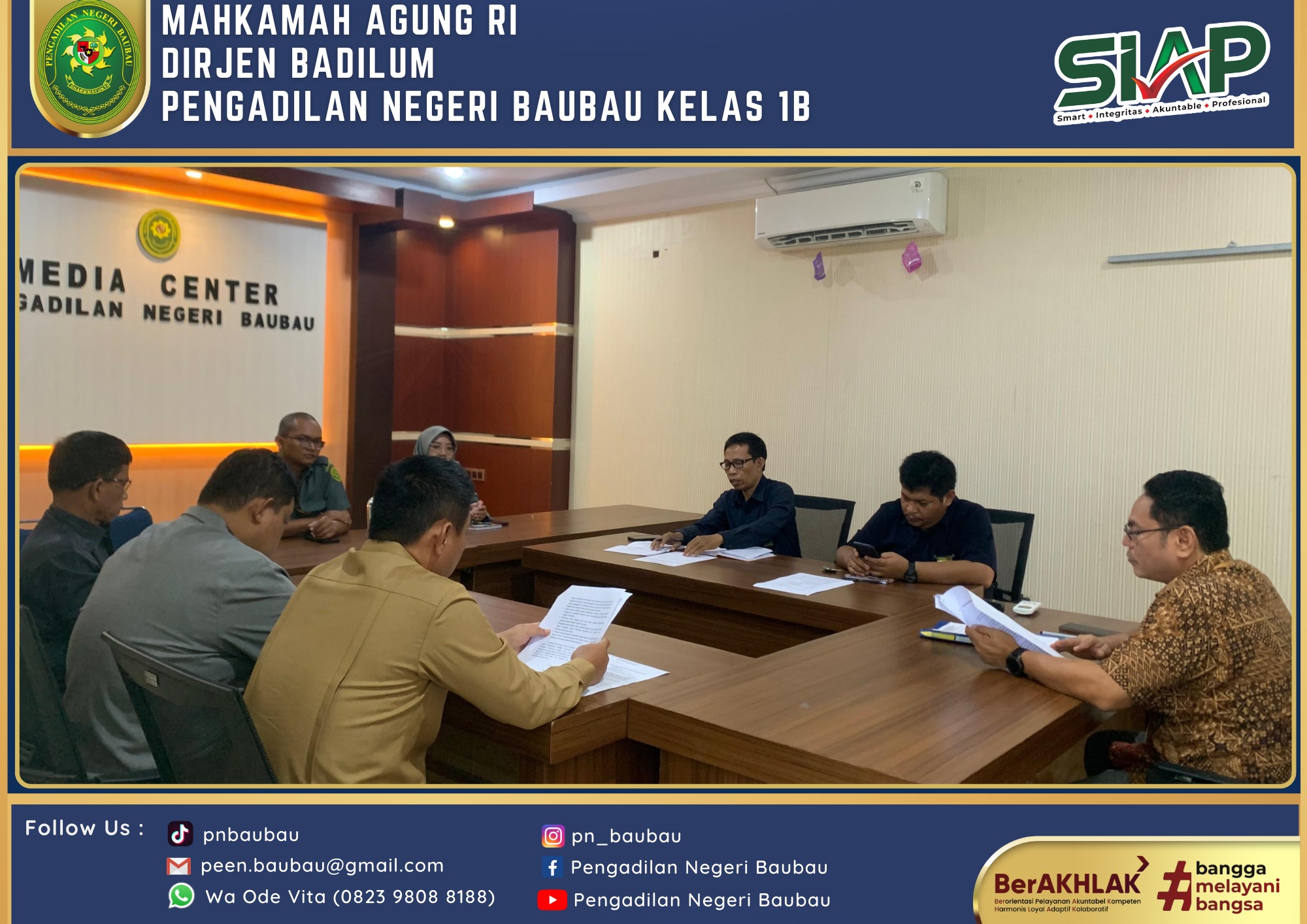 Bertempat di Media Center, Tim Baperjakat Pengadilan Negeri Baubau Kelas IB mengadakan rapat terbatas. Rapat baperjakat dipimpin langsung oleh Ketua Baperjakat sekaligus Wakil Ketua Pengadilan Negeri Baubau Bapak Johanis Dairo Malo, S.H., M.H. Rapat dibuka secara khidmat dan bersifat rahasia. Rapat dihadiri dari hakim, sekretaris, panitera. Kegiatan Baperjakat dilaksanakan pada Pukul 09.00 Wita sampai selesai.