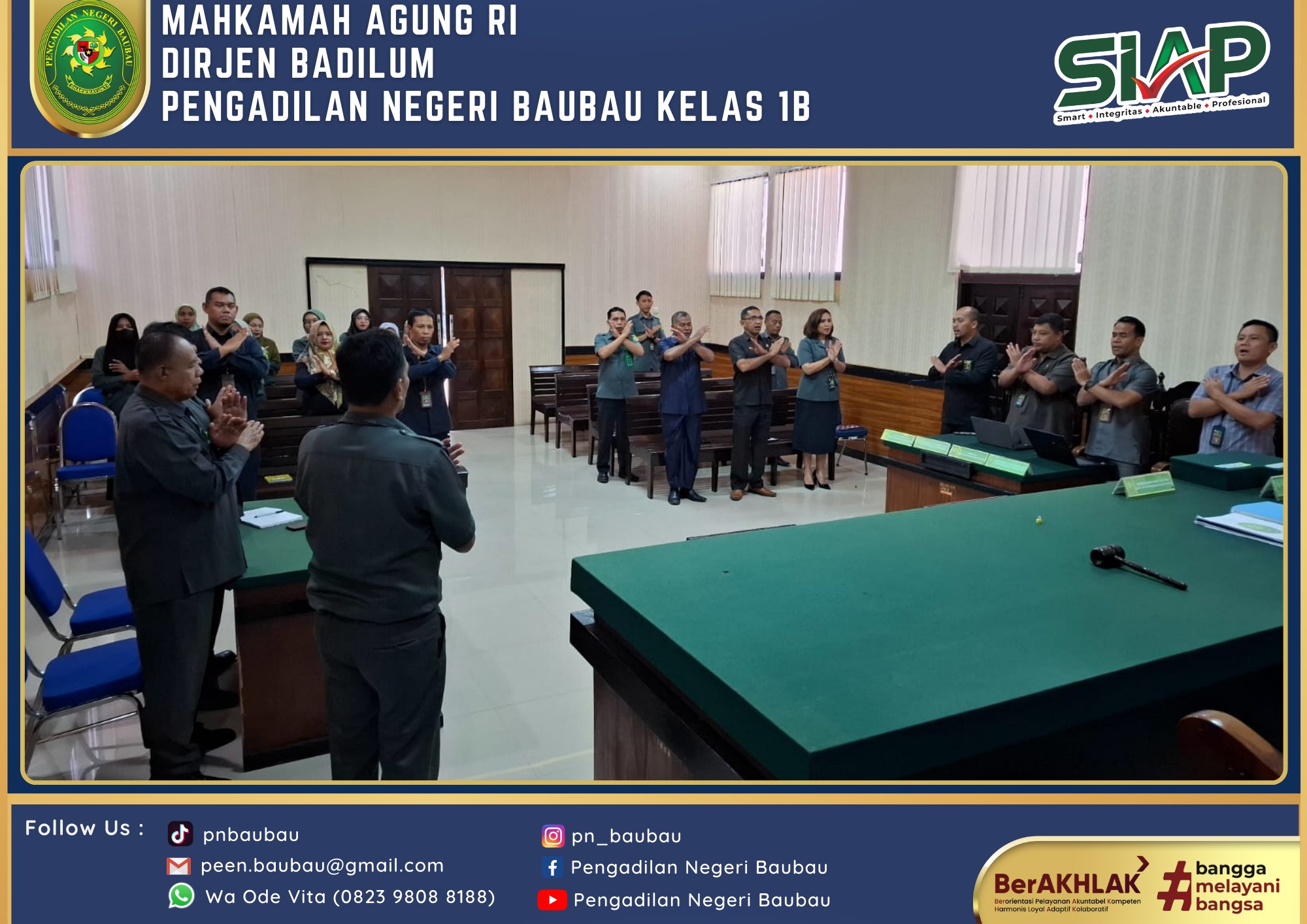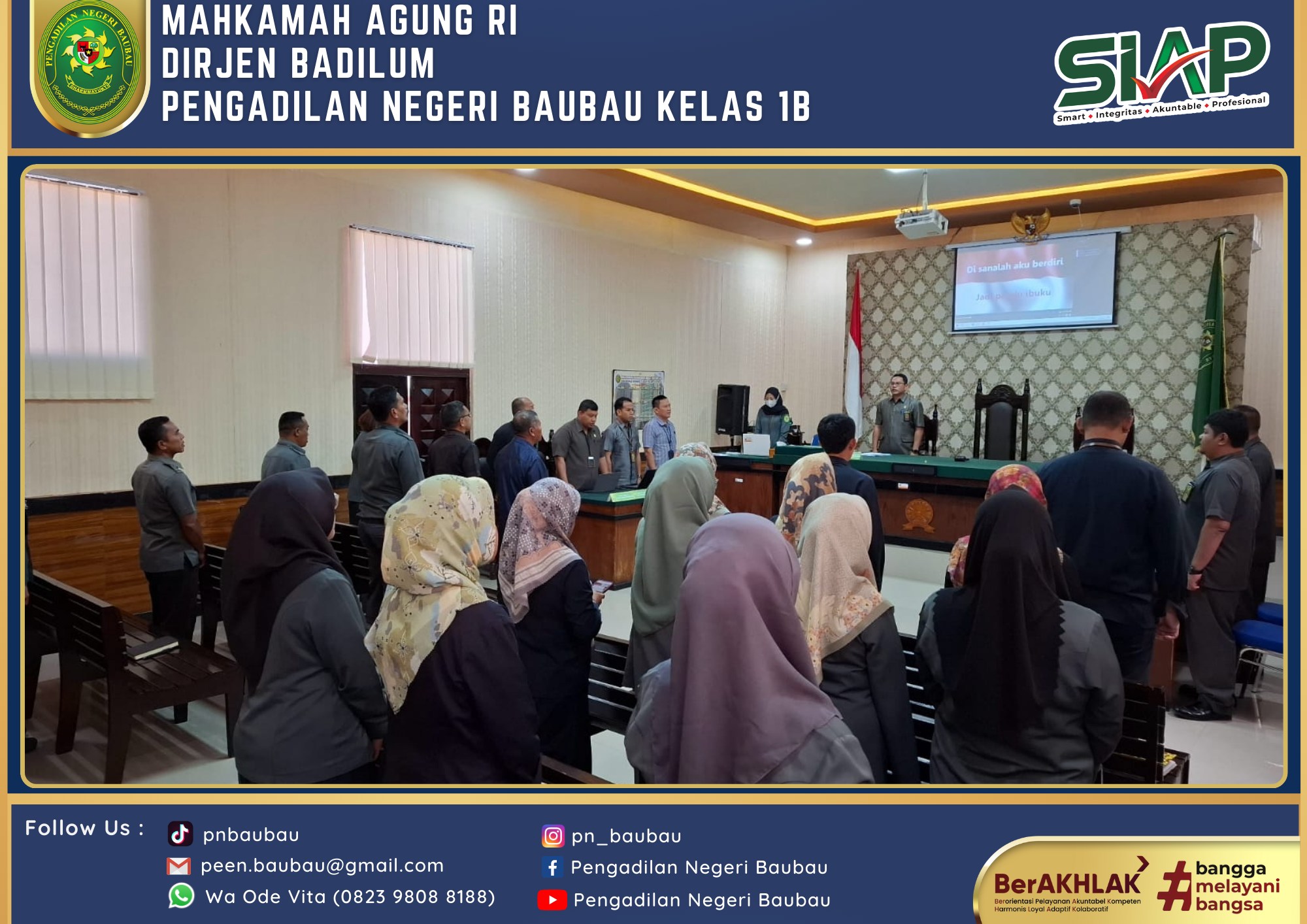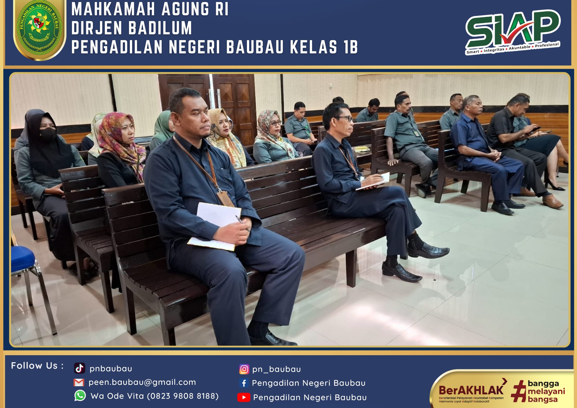 Bertempat di Ruang Sidang Utama telah dilaksanakan Rapat Bulanan, Pembinaan dan Pengawasan Peraturan Mahkamah Agung RI Nomor 7, 8, 9 Tahun 2016 Periode Bulan Juni Tahun 2024 yang dipimpin langsung oleh Wakil Ketua Pengadilan Negeri Baubau Kelas IB YM.Bpk Johanis Dairo Malo, S.H., M.H. Rapat diikuti oleh Seluruh Hakim, Panitera, Sekretaris, Para Panmud, Para Kasub, Para PP, JS/JSP, Staf, cpns, dan PPNPN Pengadilan Negeri Baubau Kelas IB. Rapat dilaksanakan pada pukul 09.00 Wita sampai selesai.
