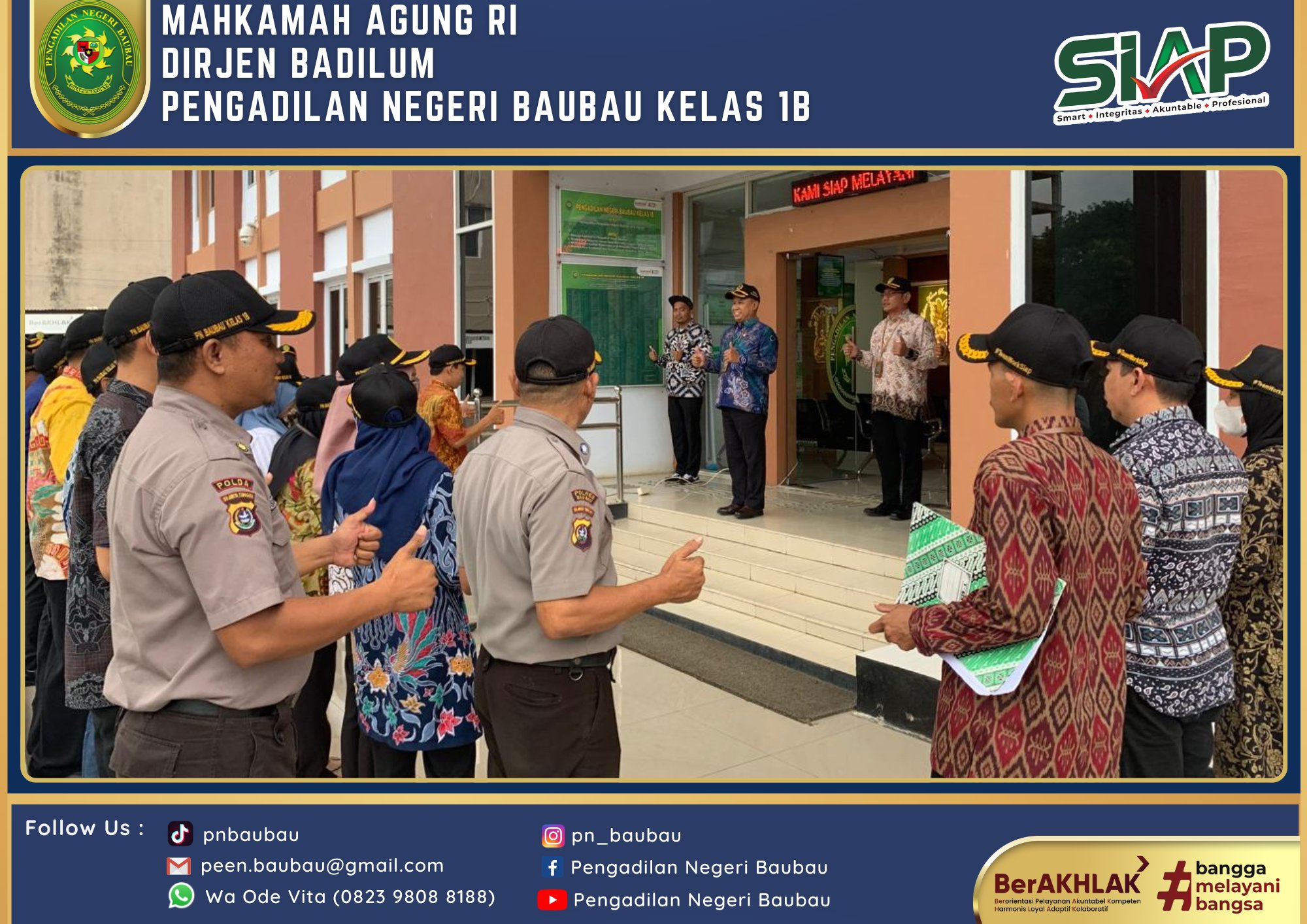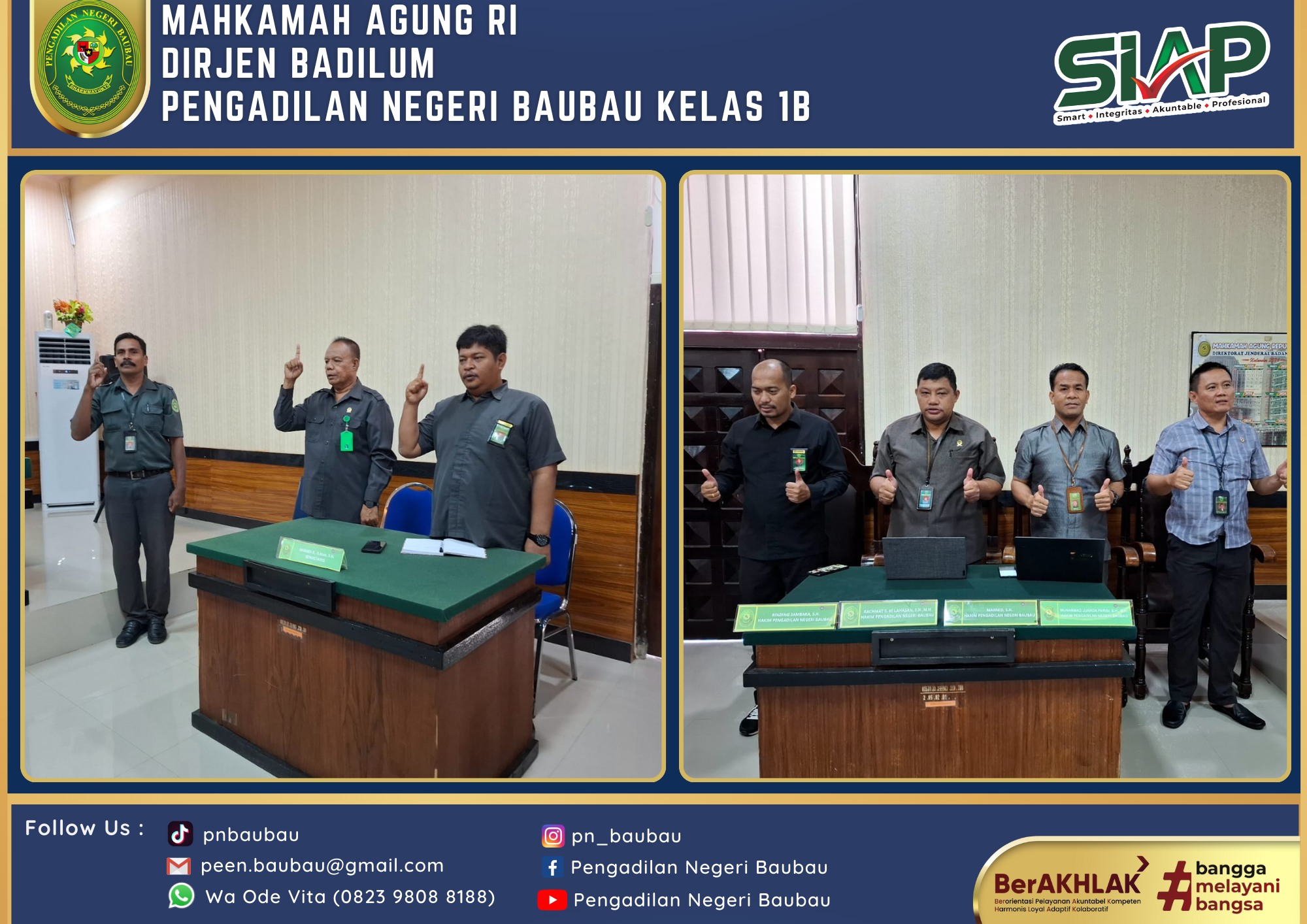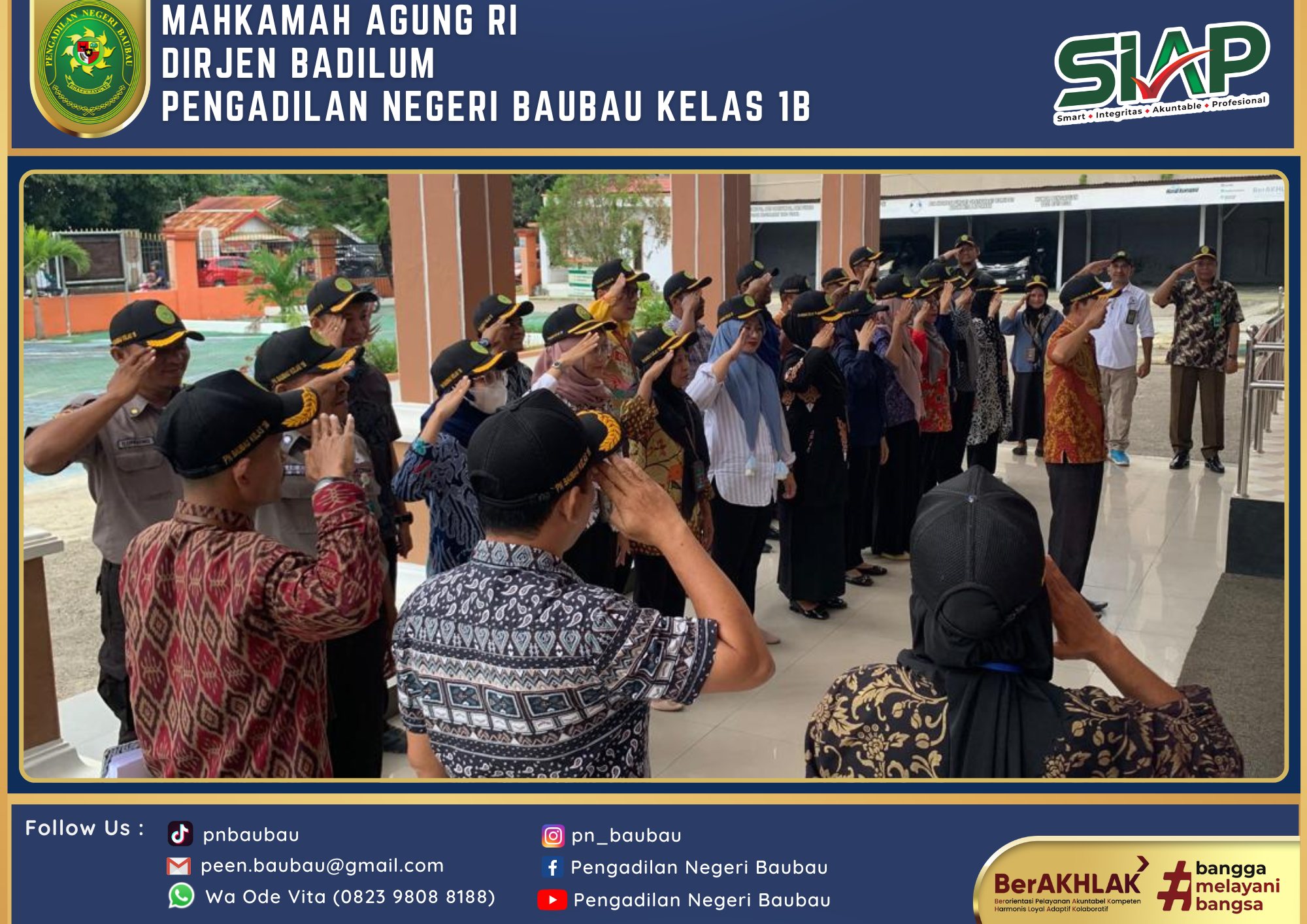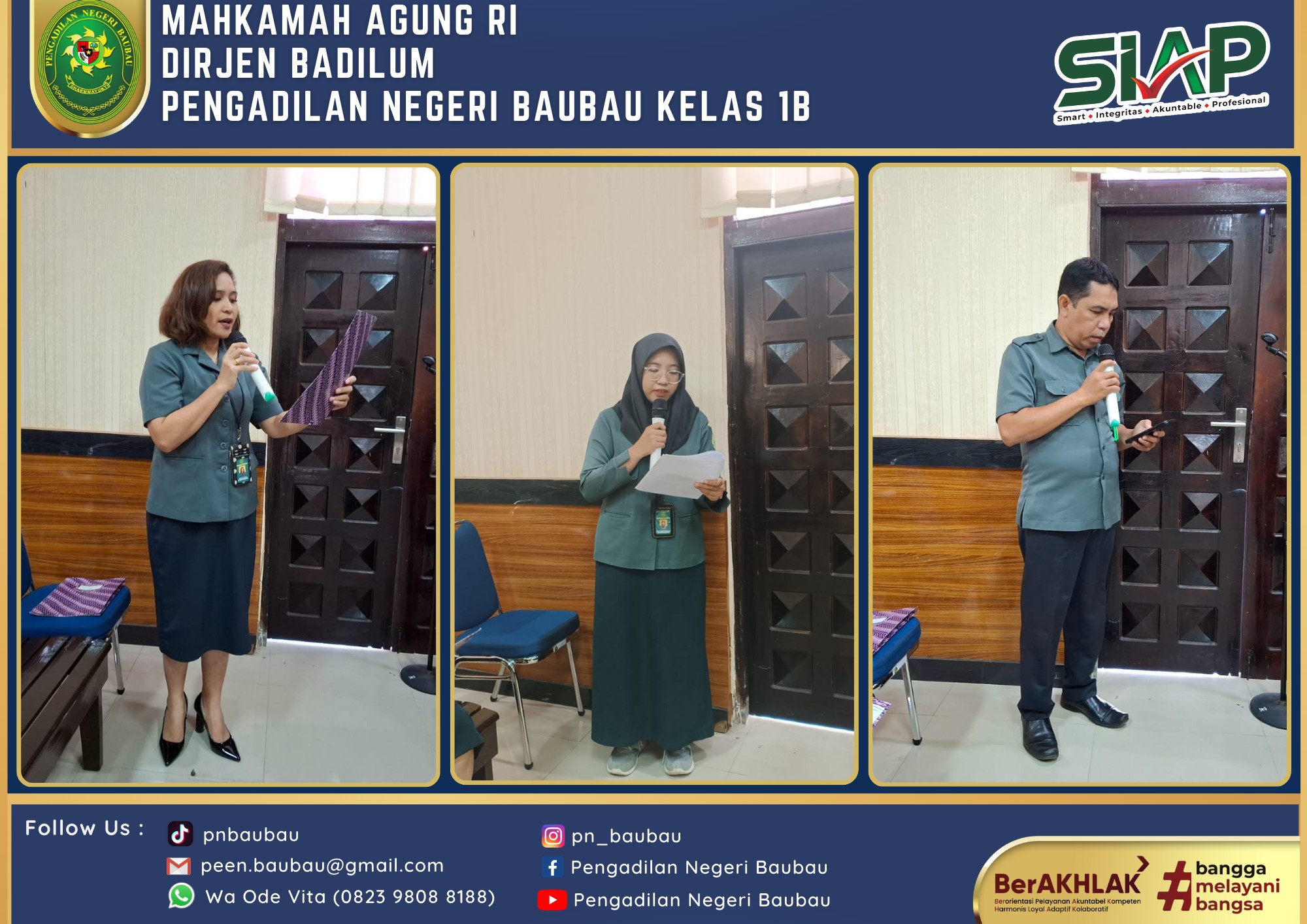 Bertempat di Ruang Sidang Utama telah dilaksanakan Rapat Bulanan, Pembinaan dan Pengawasan Peraturan Mahkamah Agung RI Nomor 7, 8, 9 Tahun 2016 Periode Bulan Juni Tahun 2024 yang dipimpin langsung oleh Wakil Ketua Pengadilan Negeri Baubau Kelas IB YM.Bpk Johanis Dairo Malo, S.H., M.H. Rapat diikuti oleh Seluruh Hakim, Panitera, Sekretaris, Para Panmud, Para Kasub, Para PP, JS/JSP, Staf, cpns, dan PPNPN Pengadilan Negeri Baubau Kelas IB. Rapat dilaksanakan pada pukul 09.00 Wita sampai selesai.