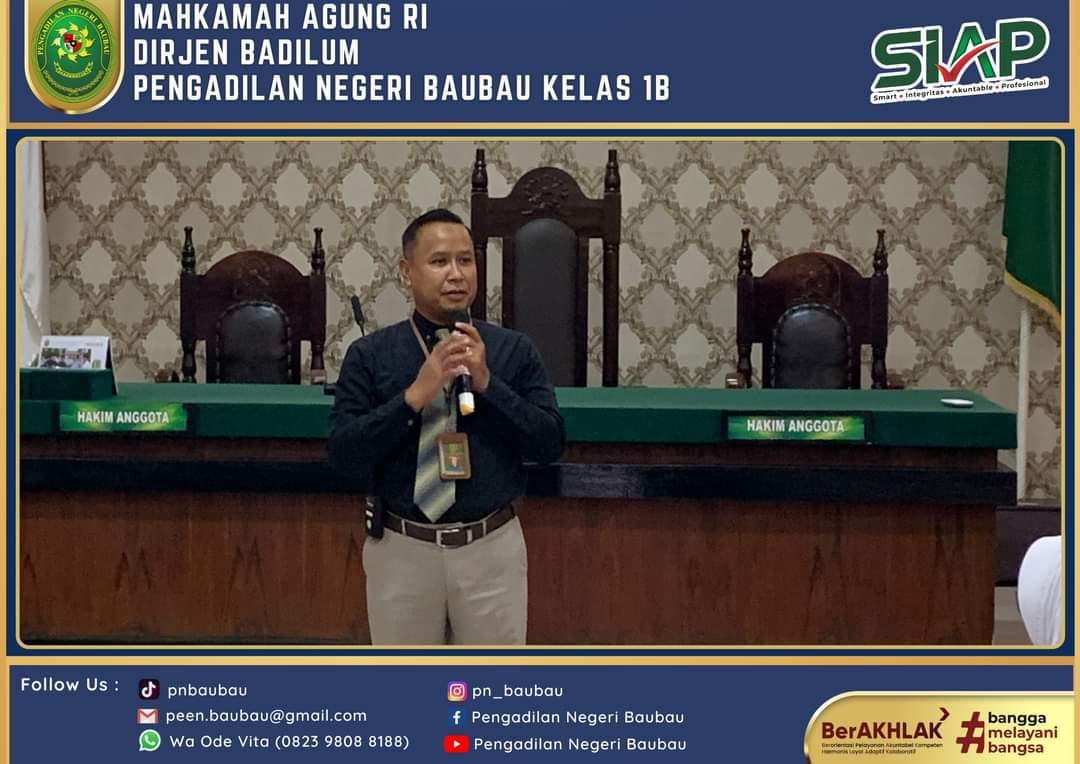 Kali ini, Pengadilan Negeri Baubau Kelas IB kedatangan Tamu dari Siswa(i) dari SMA Neg.2 Baubau yang berjumlah 34 Orang Siswa(i) dalam rangka memenuhi undangan dari Pengadilan Negeri Baubau guna mensukseskan Program “Mengenal Pengadilan” dikalangan para Pelajar. Di Pengadilan Negeri Baubau, seluruh kru telah siap siaga untuk menyambut kedatangan mereka tepatnya di bagian Pelayanan Terpadu Satu Pintu (PTSP) dan Bapak Rinding Sambara, S.H selaku Hakim pada Pengadilan Negeri Baubau bertugas menerima dan memberikan kata sambutan kepada Pelajar Siswa (i) SMA Neg.2 Baubau. Kemudian adik-adik didaulat untuk masuk ke ruang Pertemuan (Ruang Sidang Utama) untuk menerima materi Mengenal Pengadilan.