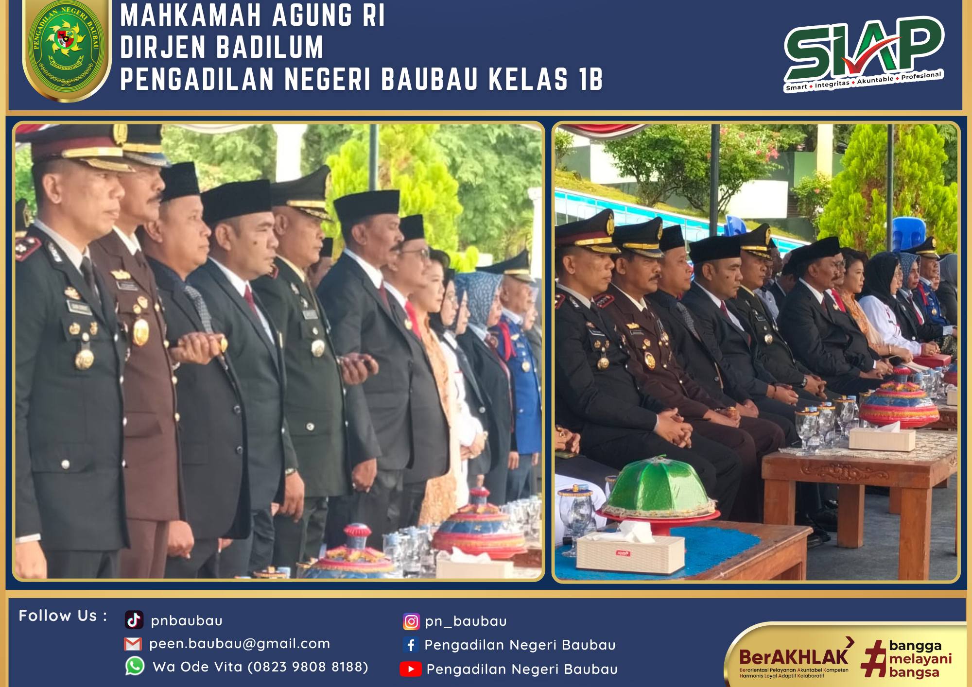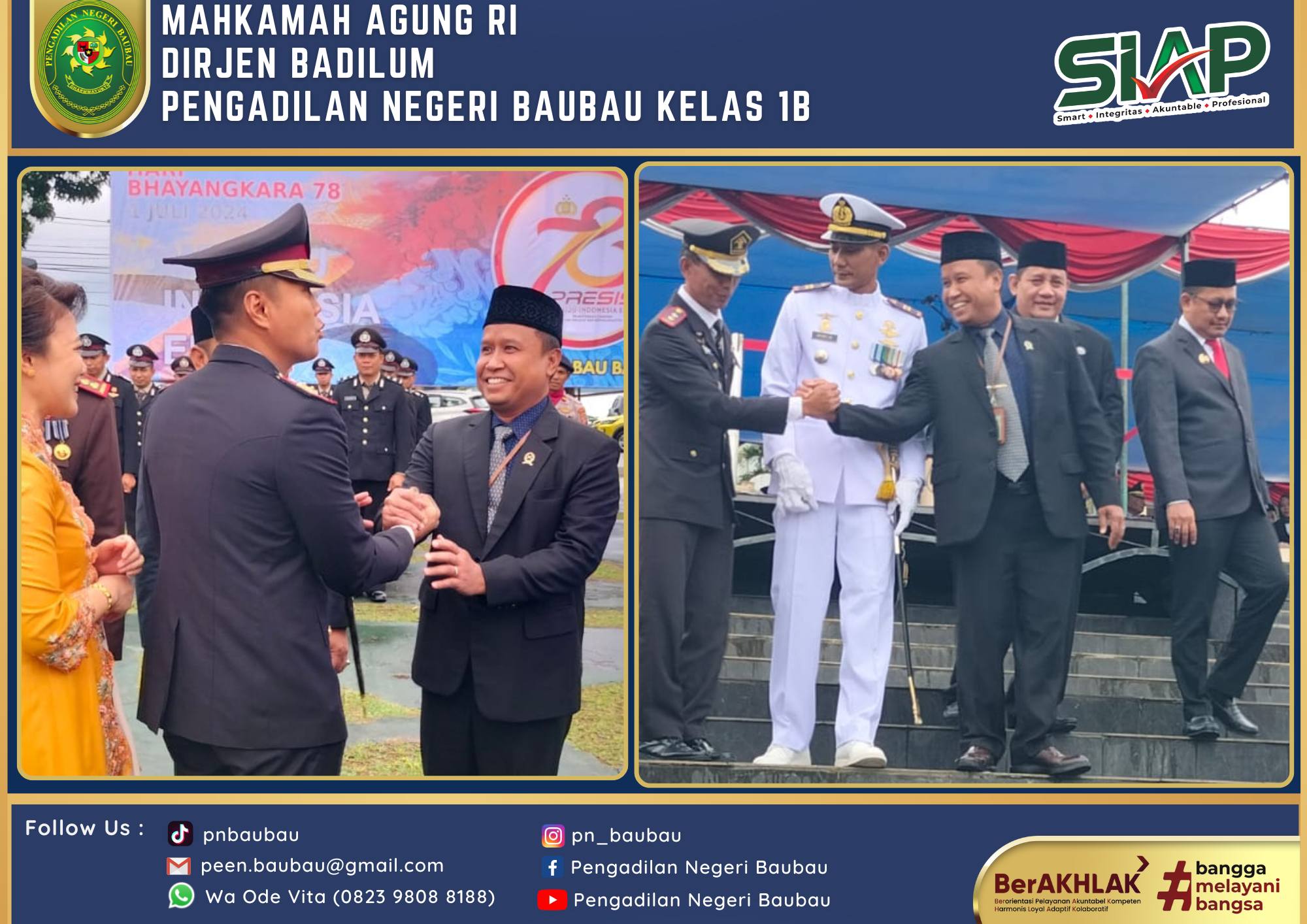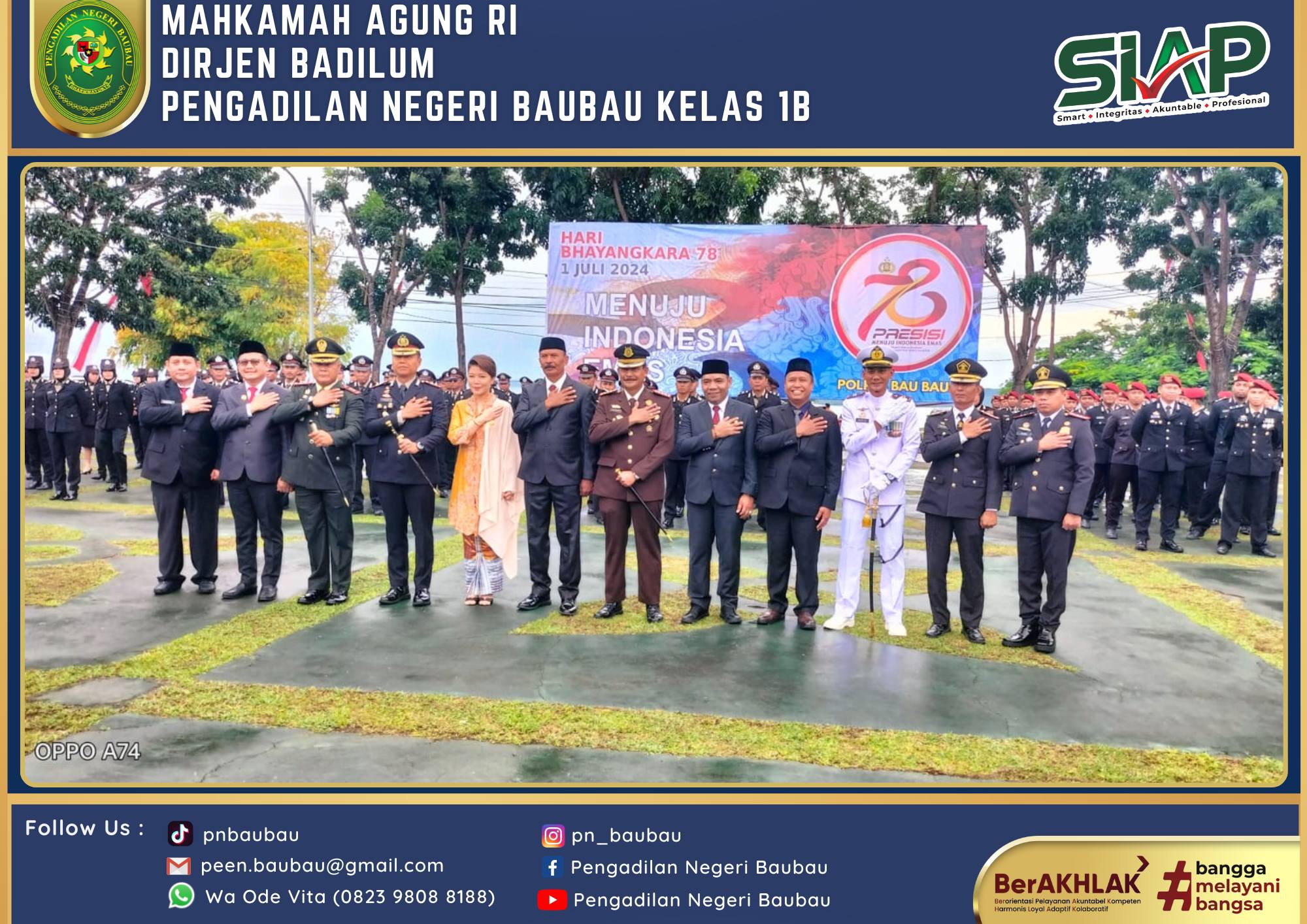 Ketua Pengadilan Negeri Baubau Kelas IB YM.Bapak Joko Dwi Atmoko, S.H., M.H mengikuti Upacara Peringatan Hari Bhayangkara Ke-78 Tahun pada Pukul 08.00 Wita bertempat di Lapangan Upacara Kantor Walikota Baubau . Bertindak sebagai Inspektur Upacara Kapolres Baubau. Ucapara berjalan Khidmat dan Lancar.