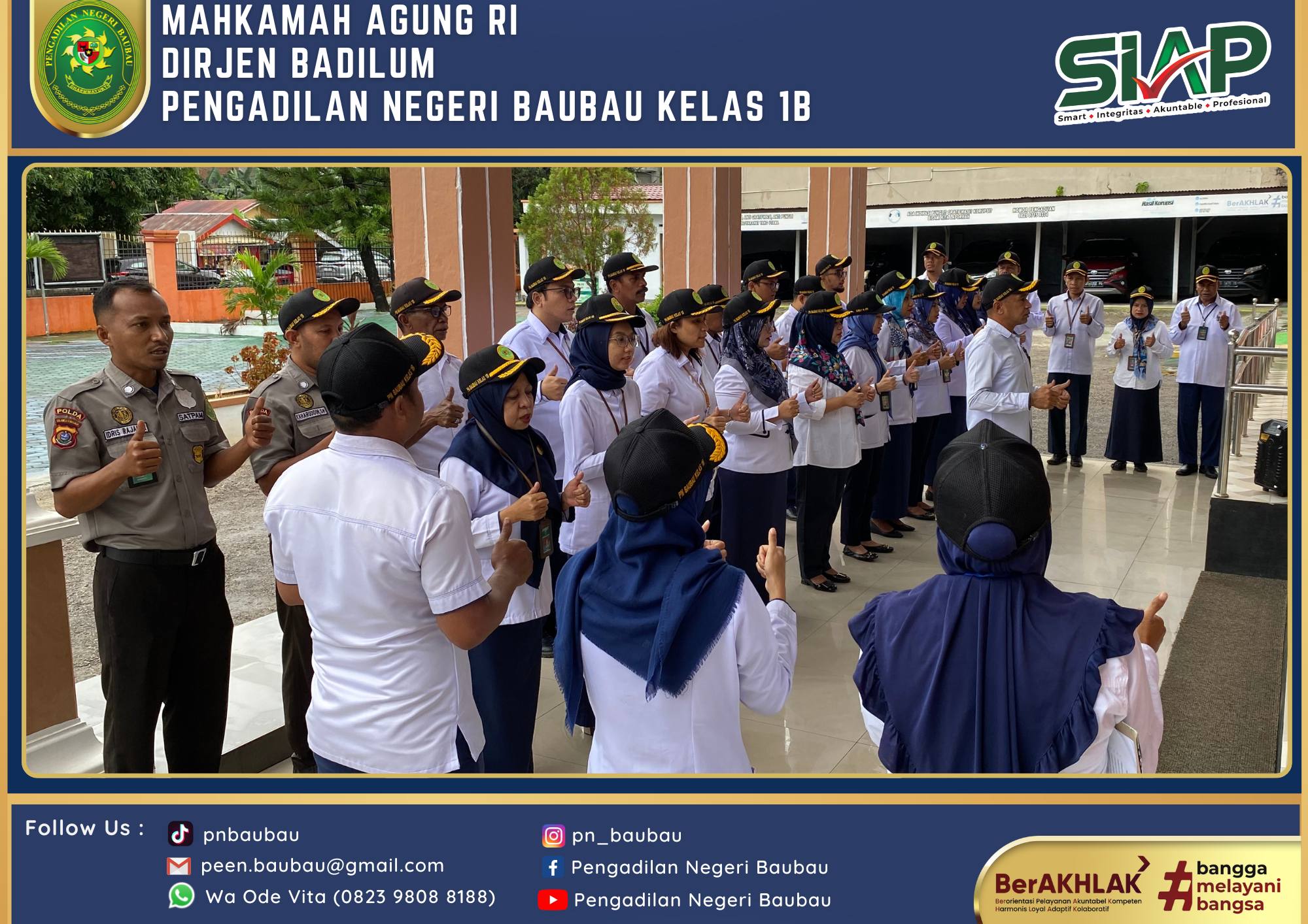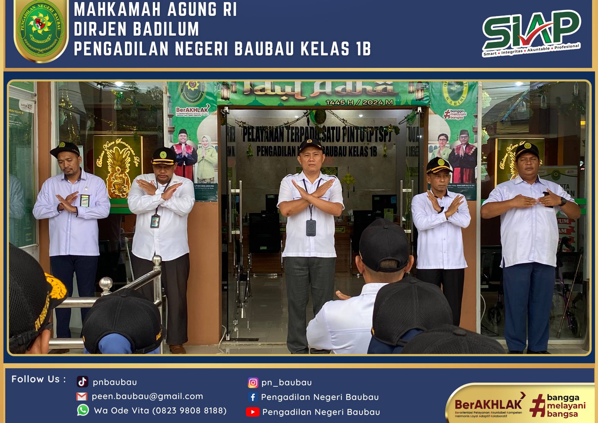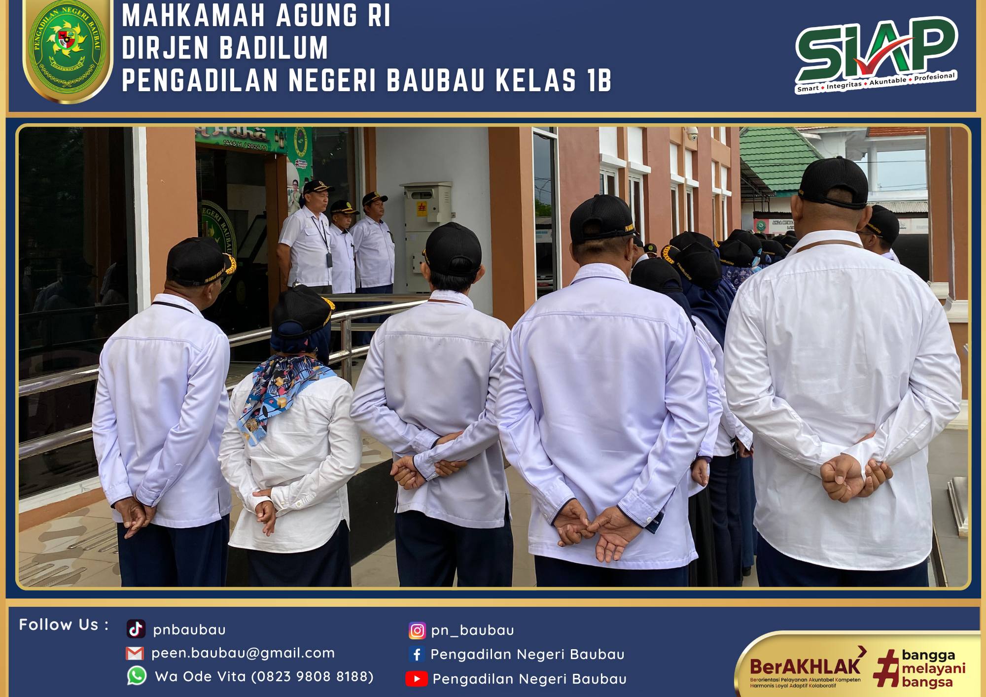 Ketua Pengadilan Negeri Baubau Kelas IB YM.Bapak Joko Dwi Atmoko, S.H., M.H mengikuti Upacara Peringatan Hari Bhayangkara Ke-78 Tahun pada Pukul 08.00 Wita bertempat di Lapangan Upacara Kantor Walikota Baubau . Bertindak sebagai Inspektur Upacara Kapolres Baubau. Ucapara berjalan Khidmat dan Lancar.