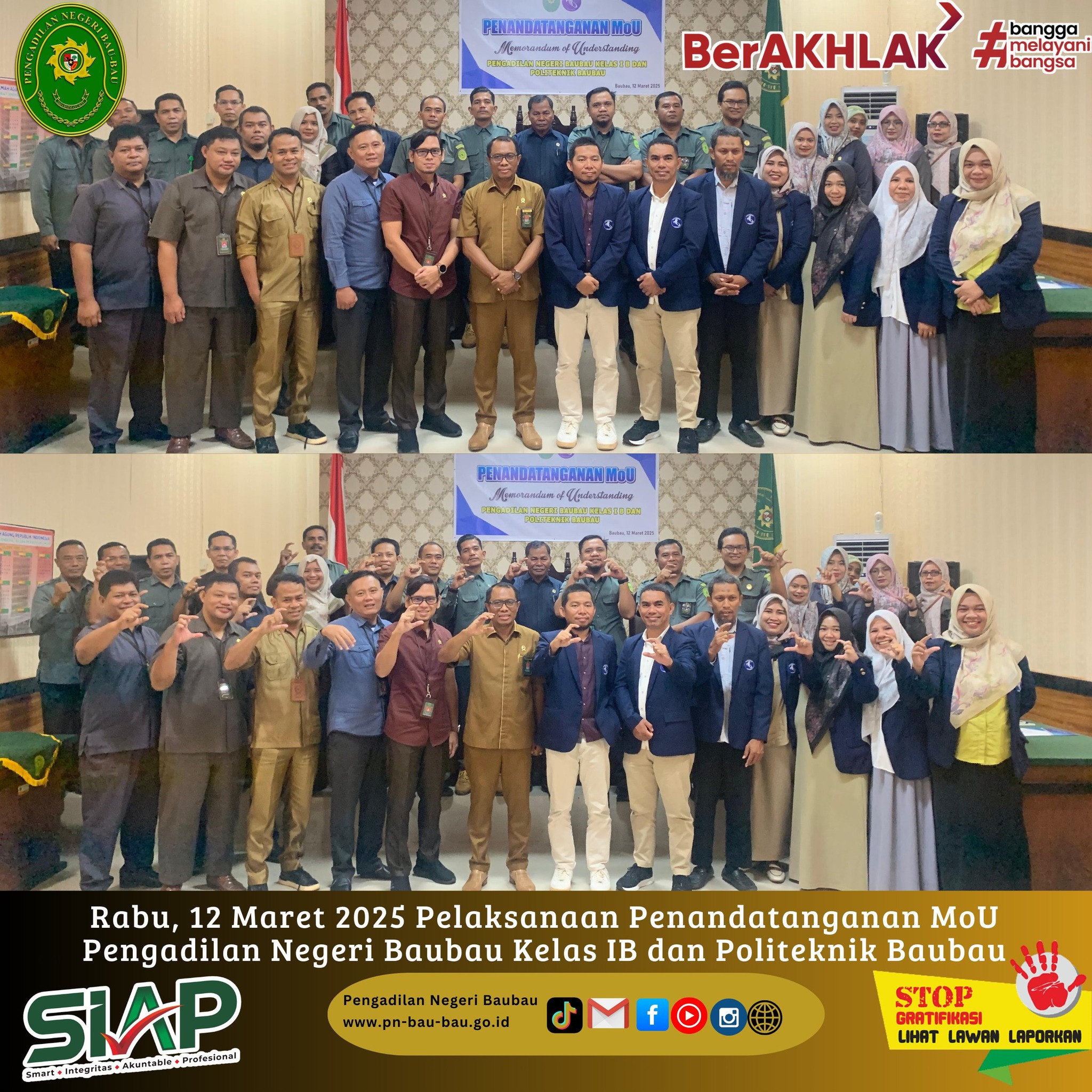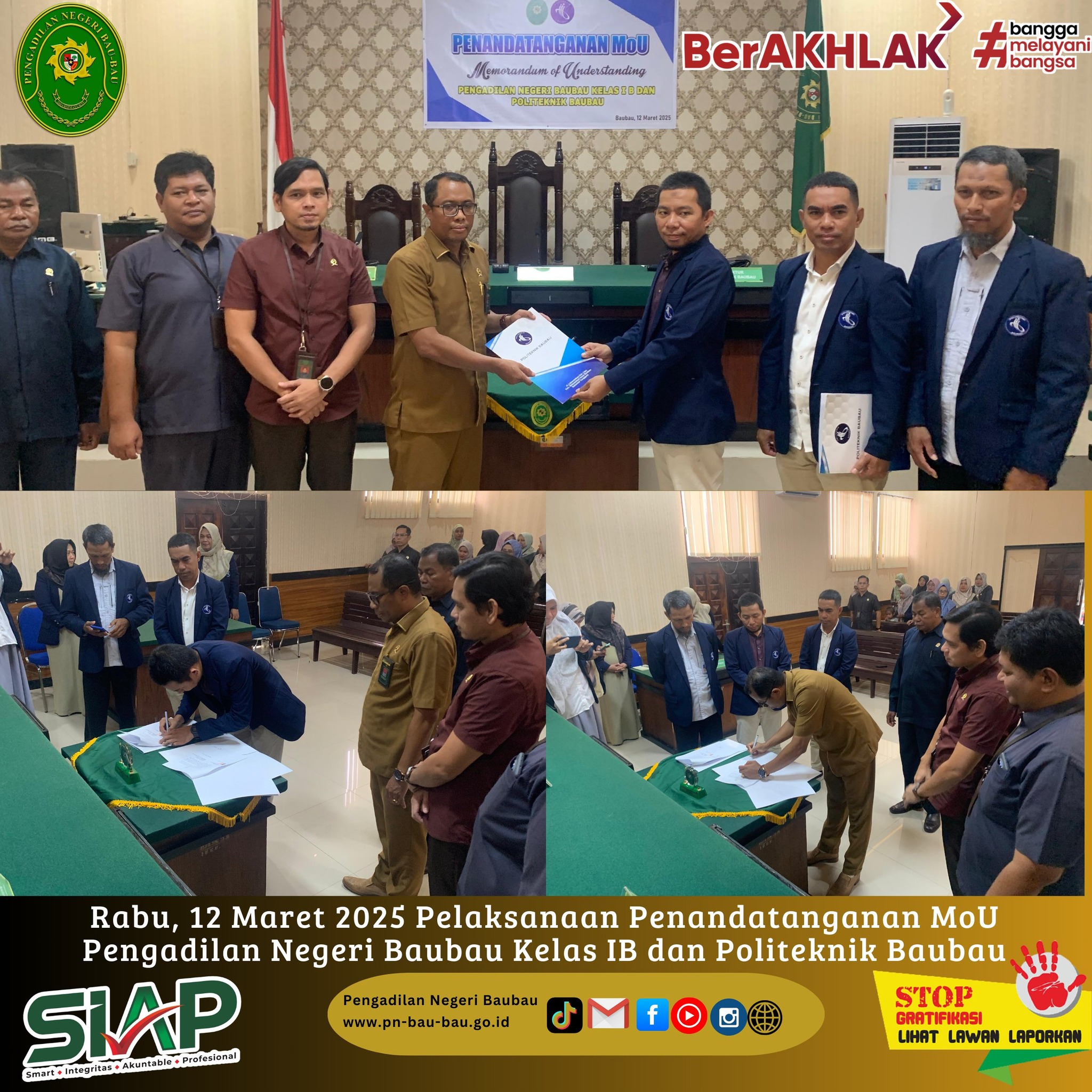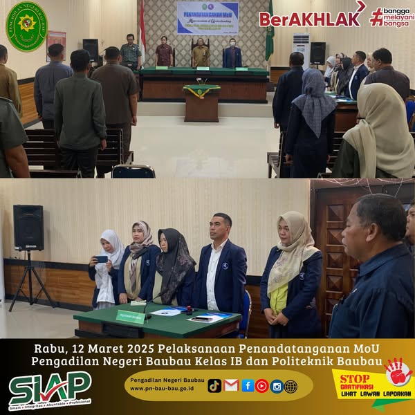 Rabu, 12 Maret 2025 Pelaksanaan Penandatanganan Kerjasama antara Pengadilan Negeri Baubau dengan Sekolah Luar Biasa Negeri 1 Baubau tentang Kerjasama di Bidang Penyediaan Layanan bagi Penyandang Disabilitas.